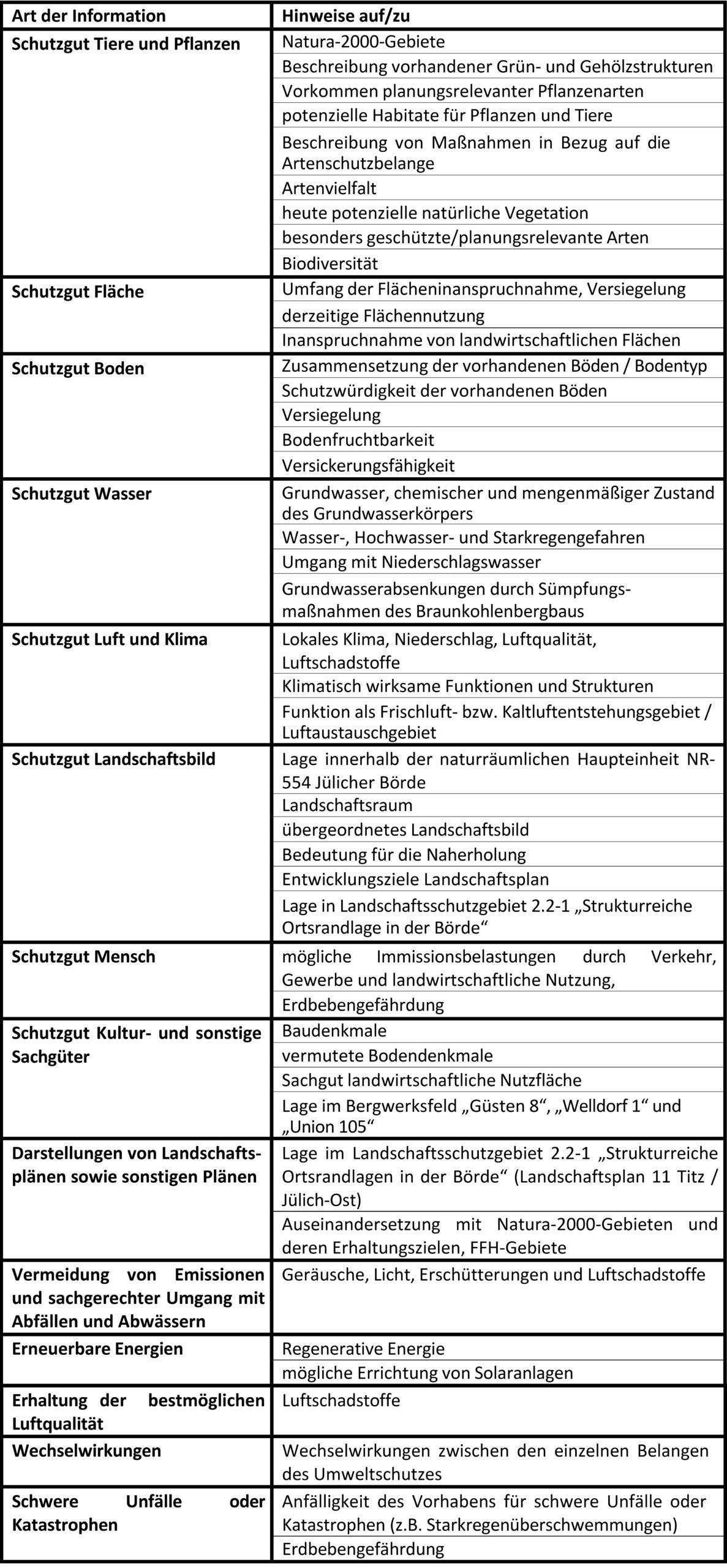 In den Stellungnahmen, die im Rahmen der frühzeitigen Beteiligung gemäß § 3 Abs. 1 und § 4 Abs. 1 BauGB sowie der förmlichen Beteiligung gemäß § 3 Abs. 2 und 4 BauGB abgegeben wurden, sowie in den vorliegenden Untersuchungen (Umweltbericht, Gutachten zur artenschutzrechtlichen Prüfung Stufe 1, Schalltechnische Untersuchung) werden Auswirkungen auf die verschiedenen Schutzgüter genannt.