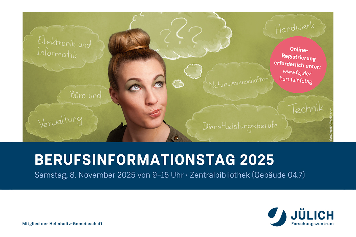 Der diesjährige Berufsinformationstag findet am Samstag, 8. November 2025 von 9 bis 15 Uhr im Foyer der Zentralbibliothek (Gebäude 04.7) auf dem Hauptgelände des Forschungszentrums Jülich statt. Eingeladen sind Schüler, Eltern und Lehrkräfte, das vielfältige Ausbildungsangebot des Forschungszentrums kennenzulernen.