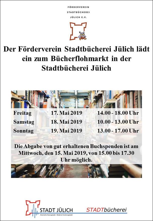 Der Förderverein Stadtbücherei Jülich e.V. lädt zum Bücherflohmarkt in der Stadtbücherei Jülich ein.