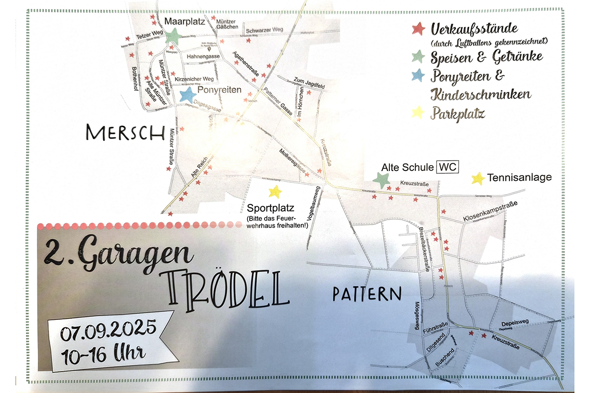 Am Sonntag, 7. September findet ein Garagenflohmarkt in Mersch-Pattern statt. An diesem Tag werden sich die beiden Dörfer von 10 bis 16 Uhr zu einem riesigen Trödelmarkt verwandeln. Für das leibliche Wohl ist gesorgt, Kinder dürfen sich auf Ponyreiten und Kinderschminken freuen.
