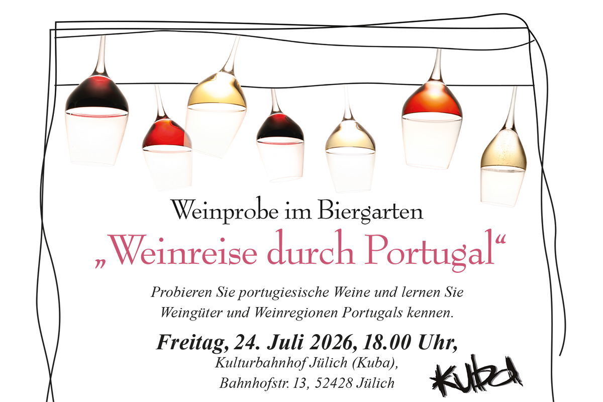 Vollmundiges aus Portugal: Bei der diesjähigen Weinprobe am Freitag, dem 24. Juli, im Biergarten des Kuba Jülich werden ab 18 Uhr Weiß-, Rosé- und Rotweine aus den verschiedensten Regionen Portugals vorgestellt. Angefangen mit den frischen Vinho Verde Weißweinen nahe der spanischen Grenze über klassische Rotweine von Douro und Dao, Tejo und Alentejo bis zu den fruchtigen Rosés der Algarve. Weine von namhaften und ausgezeichneten Weingütern ebenso wie auch von kleinen, weniger bekannten Quintas, die mit viel Herzblut Weine von großer Qualität erzeugen.