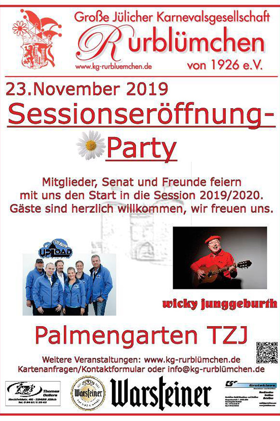 Die Große Jülicher KG Rurblümchen beginnt die Session am Samstag, 23. November, mit einer Sessionseröffnungsparty im Palmengarten des Technologiezentrums Jülich. Ab 20:00 Uhr werden Präsident Frank Kutsch und Senatspräsident Rainer Frings im TZJ die „Rurblümchensession“ eröffnen. Literat Wolfgang Steufmehl hat zwei feine Programmpunkte zu bieten: Eröffnen wird den Abend Wicky Junggeburth, der das Publikum sicherlich wieder toll unterhalten wird. Danach wird die Upload-Coverband einheizen, die sich schon zu einer gesetzten Größe entwickelt hat und mehrmals Garant für beste musikalische Unterhaltung war.