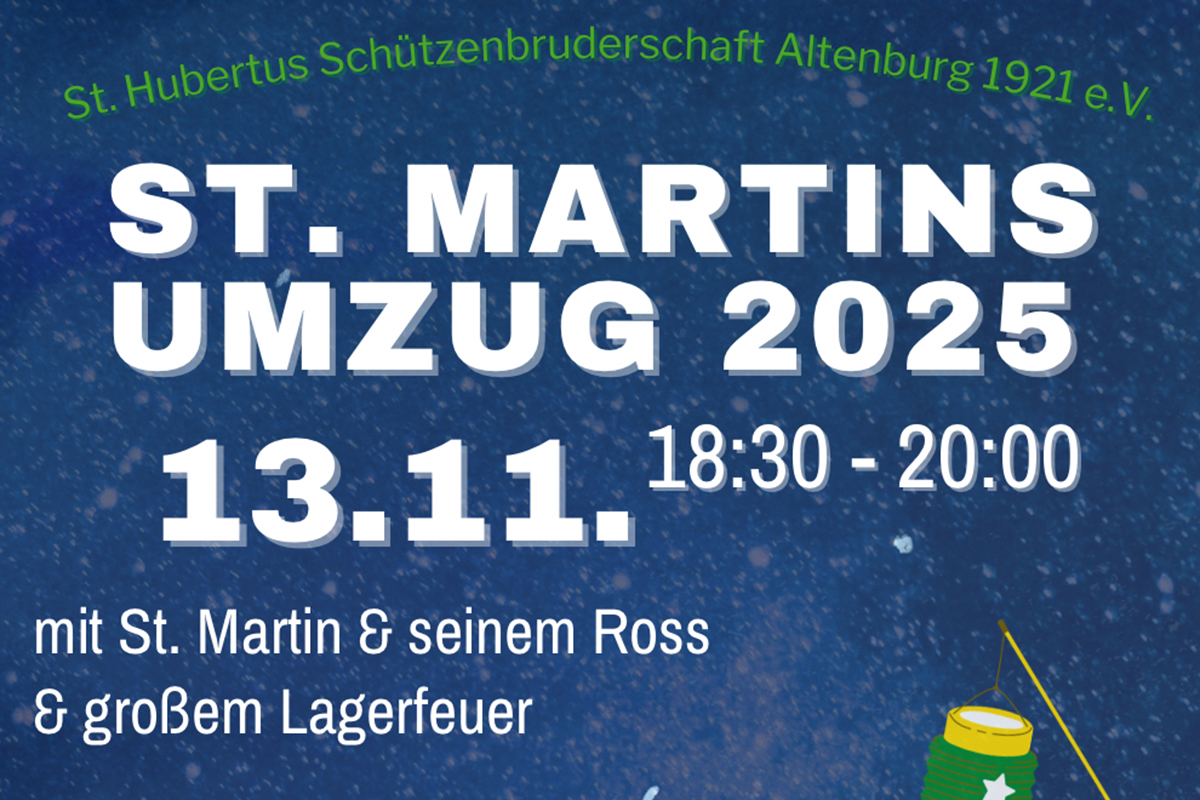 Die St. Hubertus Schützenbrüderschaft Altenburg organisiert am Donnerstag, 13. November ab 18. 30 Uhr den St. Martins Umzug in Altenburg. Die Familien starten an der St. Hubertus Kapelle in Altenburg und gehen mit St. Martin und seinem Pferd durch die gesäumten Straßen. Am Ende erwartet Sie ein großes Lagerfeuer.