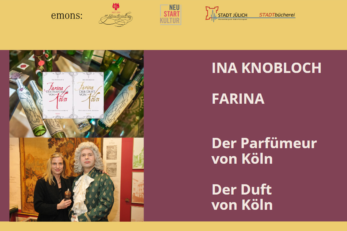 Historische Duft-Lesung: Ina Knobloch liest am Freitag, 23. Juni, in der Stadtbücherei Jülich aus ihren historischen Romanen „Farina – der Parfümeur von Köln“ und der Fortsetzung „Farina – der Duft von Köln“. Beginn ist um 19 Uhr. Die Veranstaltung findet im Rahmen des Förderprogramms von Neustart Kultur „Tausende literarische (Wieder-) Begegnungen mit Autorinnen und Autoren“ statt.