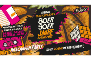 Mit der geballten DJ Power aus Jülich feiern DJ BUTO, DJ Chris, DJ Markus und DJ Ralf am Freitag, 31. Oktober eine 80er 90er Halloween Special Party. Einlass und Beginn ist um 20 Uhr in der Kulturbahnhof Kneipe, Bahnhofstr. 13. Tickets gibt es im Vorverkauf 8 Euro inkl. Gebühren, im Kuba-Kiosk oder online unter https://ztix.de/kuba-juelich/events/80er-90er-jahre-halloween-party-p37F9Z An der Abendkasse kosten die Tickets 10 Euro.