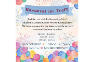 Auch in den Kinder- und Jugendtreffs der Stadt Jülich wird Karneval gefeiert! An jedem Standort gibt es von 15-20 Uhr eine Karnevalsparty für die Kinder und Jugendlichen: 24.02.2025 – Bourheim 26.02.2025 – Koslar 28.02.2025 – Barmen Geschlossen bleibt der Jugendtreff in Bourheim an Weiberfastnacht, 27.02.2025 und am Rosenmontag, 03.03.2025. Alle Informationen zu den Kinder- und Jugendtreffs der Stadt Jülich gibt es unter https://www.juelich.de/moja
