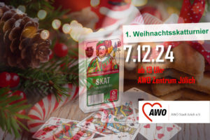 Die Titzer Spitzen, der Skatclub Rheinbraun und der Skatclub Koslar laden ein zum 1. AWO-Weihnachtsskatturnier in das AWO Begegnungszentrum Jülich, Marie-Juchacz Weg 2 statt. Es findet am Samstag, 7. Dezember von 13 bis 19 Uhr. Anschließend ist gemeinsamer Besuch des Jülicher Weihnachtsmarktes geplant. Spielablauf: 2 x 48 Spiele | Startgeld: 10,- EUR jedes verlorene Spiel: 1,- EUR Gespielt wird nach dem Regelwerk des Deutschen Skatverbandes. Anmeldungen sind möglich bei Dietmar Lobe: 0172/2405572 oder per Email: dietmar.lobe@mks-maklerdienste.de