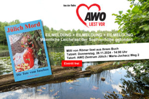 Die AWO Jülich lädt am Donnerstag, 28. November ab 14 Uhr zu einer spannenden Lesung ein. In der Reihe "AWO liest" bereitet die Jülicher Autorin Milli von Römer alias Marie-Luise Herpers ein paar fesselnde Momente im AWO Zentrum Jülich. Erneut Mord in Jülich. Männliche Leiche auf der Sophienhöhe gefunden. Was können die Jülicher aufatmen, wenn sich Hannelore und Manfred auf Mörderjagd begeben. Der Eintritt ist frei.