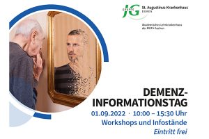 Das St. Augustinus-Krankenhaus lädt zum Informationstag rund um das Thema Demenz ein. Workshops und Vorträge mit Informationsaustausch finden am Donnerstag, 1. September, zwischen 10 und 15.30 Uhr statt. Für die Workshops und Vorträge ist eine Voranmeldung bei Demenzexpertin Monika Ganster (Tel. 02421 / 599-6830) erforderlich. Die zahlreichen Informationsstände am Haupteingangsbereich können ohne Anmeldung besucht werden. Der Eintritt ist frei. Die Vorträge und Workshops finden unter Einhaltung der erforderlichen Hygienemaßnahmen statt. Zudem ist ein aktueller negativer Testnachweis nötig. Den Angehörigen der…