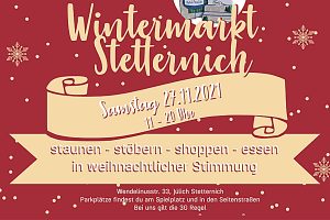 Ein Wintermarkt unter dem Motto "staunen, stöbern, shoppen, essen in weihnachtlicher Stimmung" findet am Samstag, 27. November, von 11 bis 20 Uhr in Stetternich, Wendelinusstraße 33, statt. Daran nehmen Uta Pirug (Mary Kay Kosmetik), Steffi Springmann (TragS Design - Näharbeiten), Patricia Heck (Fotografie), Isabell Zeidler (MonstaBella – Nähsets, Kuscheltiere), Sarah Frings (Thermomix), Wilfried Conen (Holzdeko), Jasmin Esser (Duftlampen), Britta Fink (Papier-Basteleien) und Vera Wilden (Schmuck). Aufgrund der begrenzten Platzmöglichkeiten wird um Verständnis gebeten, dass zur Einhaltung aller gültigen Abstandsregelungen gegebenenfalls…