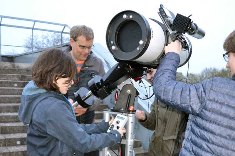 Noah, Sechstklässler am Gymnasium Haus Overbach, ist eines von rund 15 aktiven Mitgliedern des Astronomie Clubs, der sich einmal in der Woche im Science College (SCO) in Barmen trifft um gemeinsam in die Sterne zu gucken. Oder eben auch nicht. Hängen die Wolken tief und es regnet, finden die Astronomen auf dem Dach des modernen Baus, der sich ganz der Forschung und den Naturwissenschaften verschrieben hat, immer etwas zu tun. „Hier werden auch kosmologische oder philosophische Theorien diskutiert“, verrät Philipp Mühlheims und weist mit der Hand durch den eigens eingerichteten Astronomie-Raum in der obersten Etage des SCO. Mühlheims, einst ebenfalls Gymnasiast in Overbach, war ebenfalls bereits während der Schulzeit astronomisch interessiert. Aus dem Interesse wurde der Beruf, Mühlheims ist studierter Luft- und Raumfahrttechniker und betreut gemeinsam mit dem ehemaligen Physiklehrer Franke den AstronomieClub. So wie Philipp Mühlheims geht es vielen ehemaligen Mitgliedern, aus dem Interesse, dem Hobby werden Beruf und Berufung. So steht auch für Noah, einer der jüngsten im astronomischen Zirkel, zweifelsfrei fest: „Ich will Physiker werden!“. „Ich glaube drei unserer Ehemaligen haben Astrophysik studiert, einige auch Physik“, führt Franke weiter aus und freut sich ein wenig darüber: „Ist das nicht toll?“