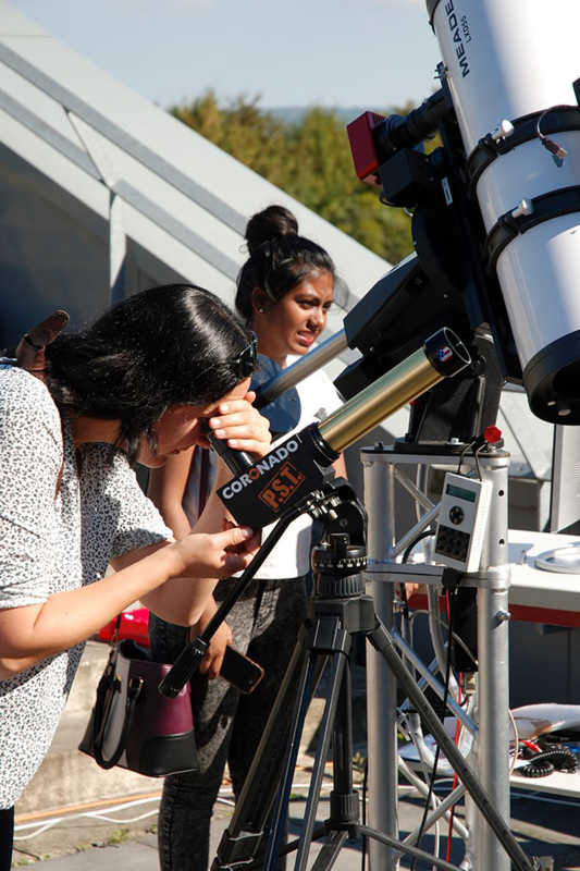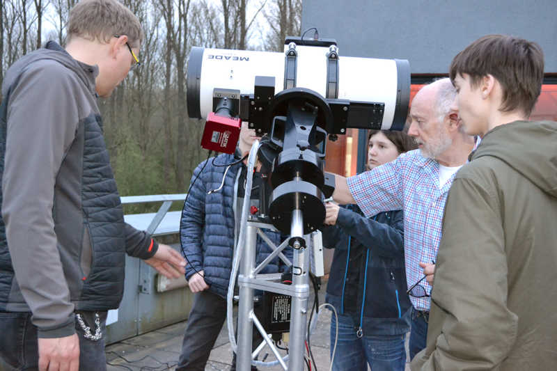 Apropos Teleskop, die Armada an technischen Geräten, die im Astronomieraum des Science College aufgebaut ist, ist in der Tat eindrucksvoll. „Unsere Ausstattung ist schon sehr professionell“, freuen sich Ex-Lehrer Franke und sein Mitstreiter Philipp Mühlheims. „Damit kann man einen sehr tiefen Blick in die Galaxie werfen“, fügt Mühlheims hinzu. Unterstützt von modernster Software und ausgestattet mit hochempfindlichen Kameras können die Hobby-Astronomen hier bestens ausgerüstet ihrer Leidenschaft frönen, Aufnahmen galaktischer Phänomene machen, die Bahnen einzelner Himmelskörper verfolgen oder auch mal einen genaueren Blick auf die Sonne richten. Da ist allerdings im Moment eher wenig los, was Sonnenbeobachtungen aktuell eher etwas langweiliger macht. Mein zumindest Philipp Mühlheims. Denn auch Sonnenbeobachtungen gehören zum umfangreichen Angebot, dass der Astronomie Club neben den wöchentlichen Treffen seinen Mitgliedern, aber auch allen anderen Interessierten macht. So gibt es jeweils einmal im Jahr größere Veranstaltungen, den Astro-Sprint und den Astro-Marathon. Workshops für Grundschulklassen oder speziell für Mädchen im Rahmen der sogenannten Ferienakademie gehören ebenfalls zum Angebot, das der Astro Club macht. Auch wer als Tagungsgast im Haus Overbach weilt, kommt in den Genuss eines astronomischen Ausflugs. „Und das Interesse ist erstaunlich groß“, freut sich Franke. „Spätestens wenn die Leute einmal den Mond gesehen haben, ist es passiert“ ergänzt sein Kollege.