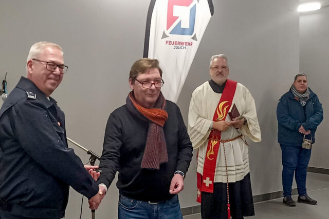Ihm sei die Einsegnung der neuen Räumlichkeiten sehr wichtig, so Fuchs, um die schützende Hand Gottes über der Broicher Löschgruppe bei ihrer gefährlichen Arbeit zu wissen. Die so wichtige Arbeit der Feuerwehr brauche gute Rahmenbedingungen, die den Anforderungen der Zeit entsprächen. Am Ende sind knappe drei Millionen Euro in das neue Gebäude geflossen, das zuvor der Pfarrei Heilig Geist gehörte, bevor sie es an die Stadt Jülich übertrug. Das Gebäude bietet in Zukunft sowohl weltlichem als auch geistlichem Engagement ein zu Hause.