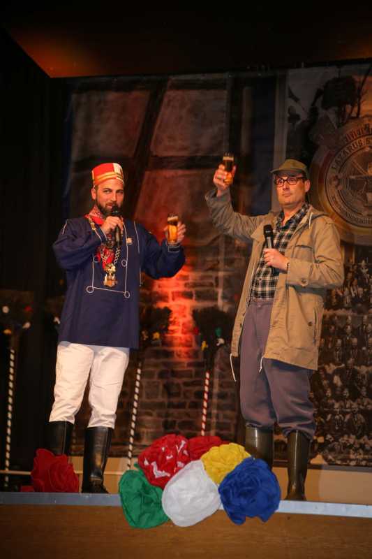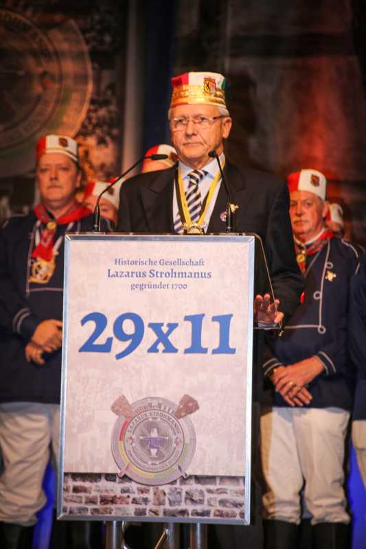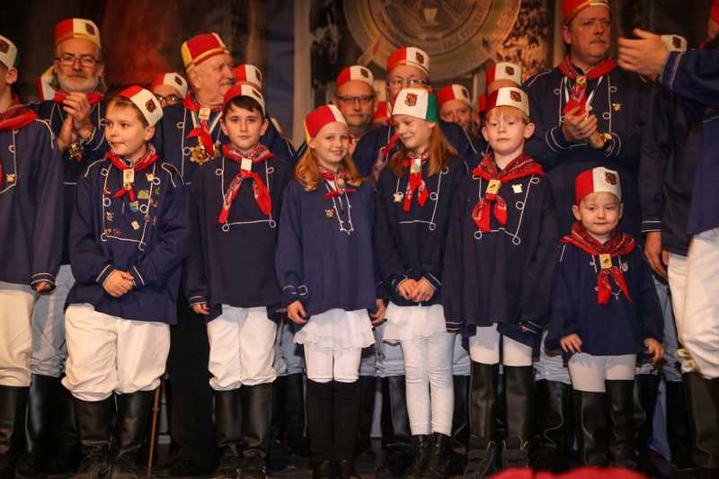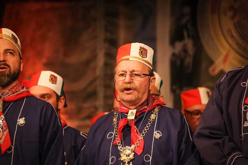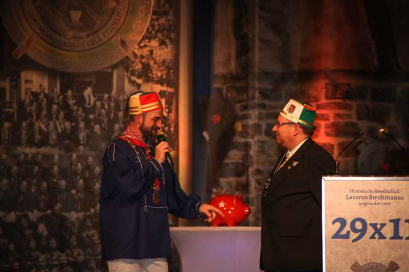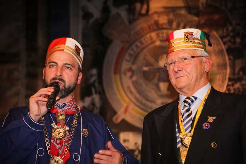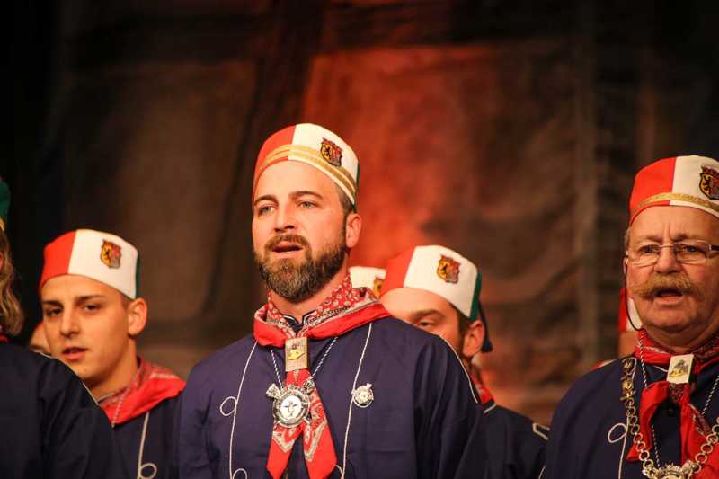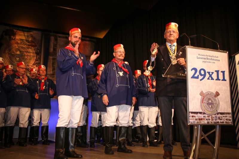 Ein beeindruckendes Bild: Der Vorhang geht auf und macht sichtbar, wie stimmgewaltig Tradition sein kann: Das Lazarus-Lied stand am Anfang des Festaktes der Historische Gesellschaft Lazarus Strohmanus. Im Jubeljahr ein historischer Moment: Die Kettenübergabe an die nächste Generation. Vater Hein Ningelgen übergab jetzt auch offiziell die Präsidentschaft an Sohn David. Dafür gab es reichlich Applaus für beide Ningelgens.