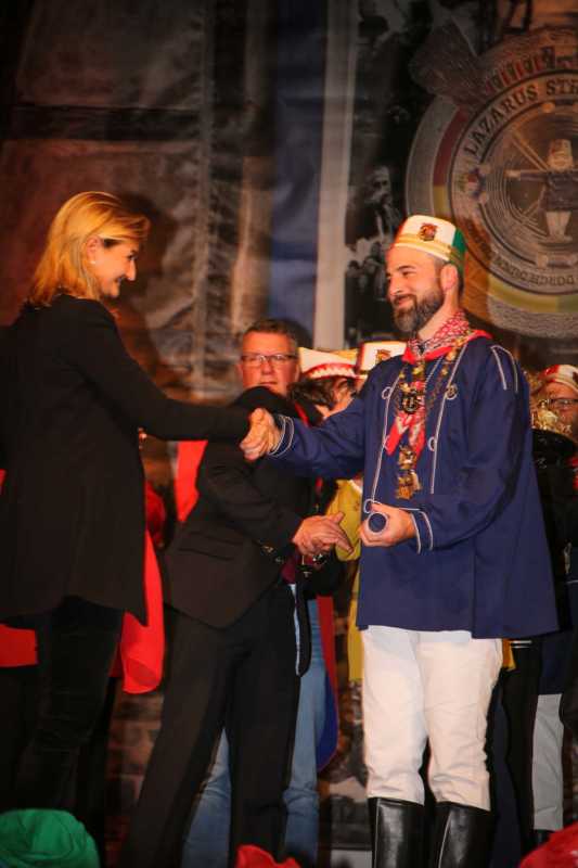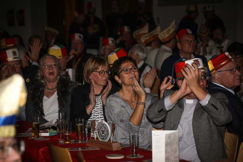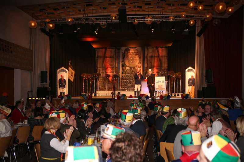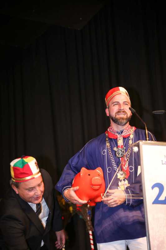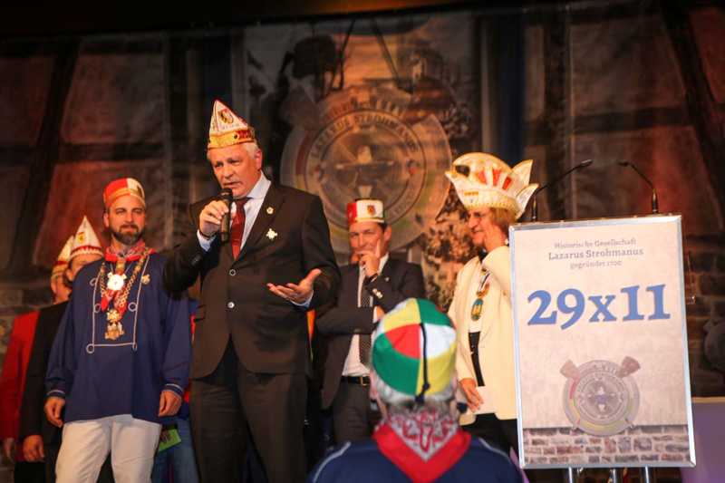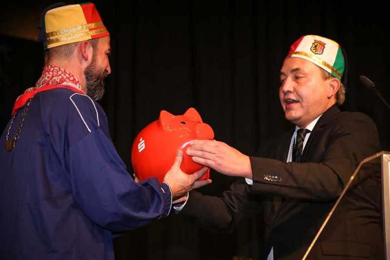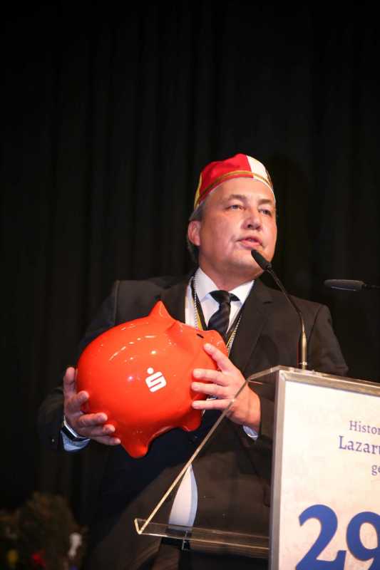 Schirmherr und Vorstandsvorsitzender der Sparkasse, Uwe Willner, hatte eine besondere Überraschung parat: Jede Gesellschaft – nicht nur die historische – erhält für die Session ein rotes Sparschwein. Angelehnt an das Jubeljahr 29 x 11 = 319 rief er einen Wettbewerb aus: Wem es gelingt, am nächsten an die Summe 319 mit angehängter „0“, also 3190 Euro heranzukommen, dem zahlt die Sparkasse die gleich Summe noch einmal aus.“Ich nehme die Herausforderung an“, sagte der selbstbewusste Jung-Präsident. Freuen dürfen sich die Lazarus-Brüder und Schwestern auch auf einen Besuch im Düsseldorfer Landtag. Dazu lud Landtagsabgeordnete Patricia Peill die Jubilare und natürlich damit auch das Kinderdreigestirn des Jülicher Kengerzoch ein, das an diesem Abend ebenfalls vorgestellt wurde.