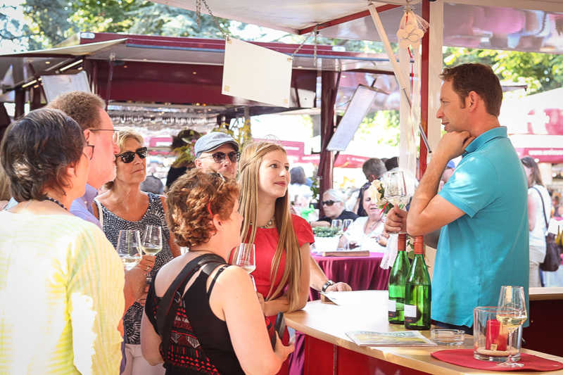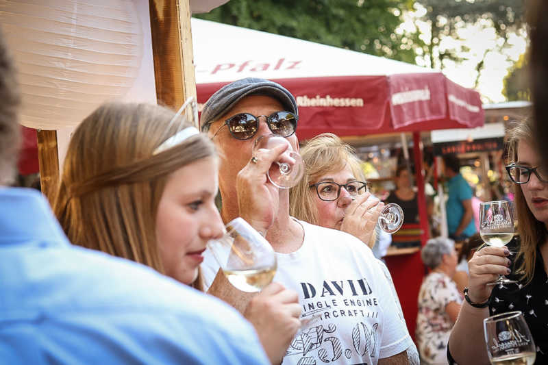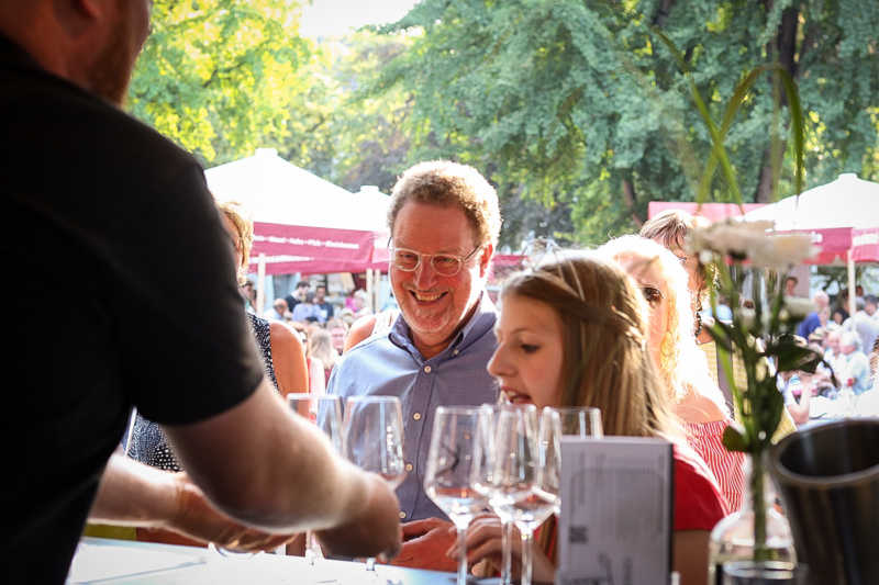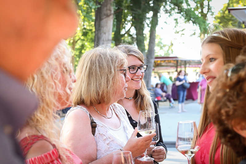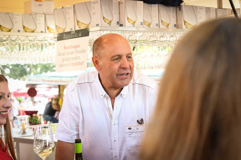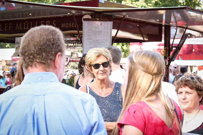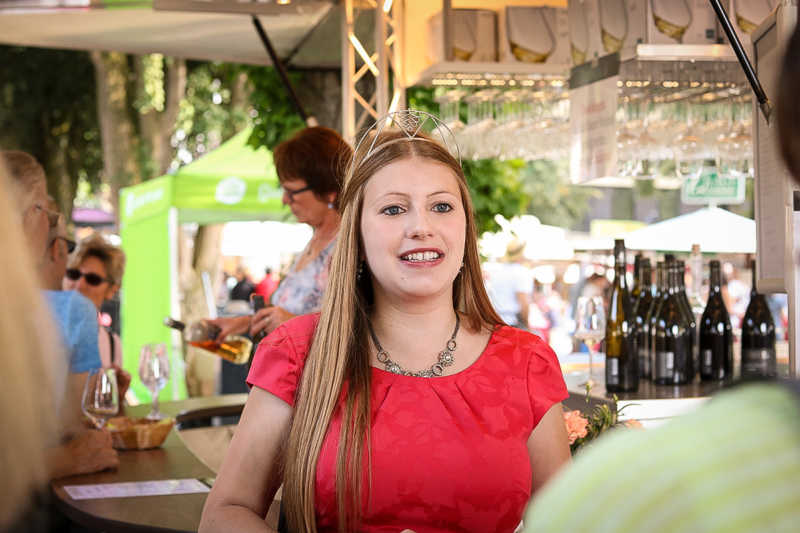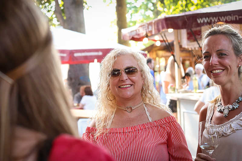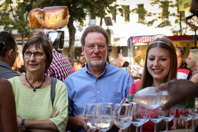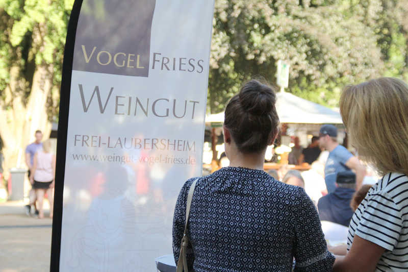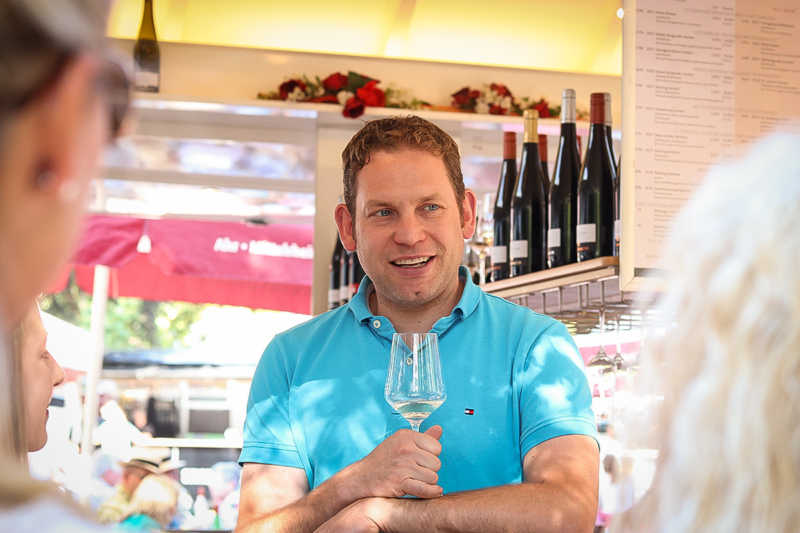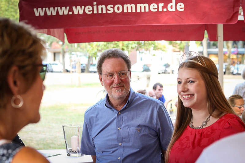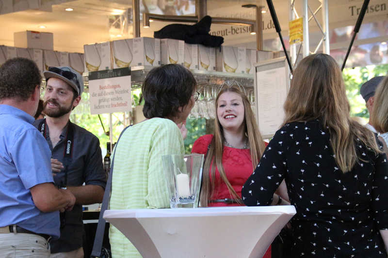 Schon die erste Begegnung war etwas besonderes: Morio Muskat hieß der Tropfen, den das Weingut Langenwalter ausschenkte. Eine Rebsorte, die heute nicht mehr sehr bekannt ist. In den 70er Jahren auf dem Vormarsch ist es nun ein Nischenwein, der aber eine außergewöhnliche Qualität hat, wie der Winzer erklärte – gerade weil er nur einen geringen Ertrag hat. Der Geschmackstest stimmte – den konnten sich die Gäste auf der Zunge zergehen lassen. Ein Terassen-Spaßwein nennt es Thorsten Langenwalter. „Für einen Tag wie heute perfekt“, meinte die Weinmajestät.