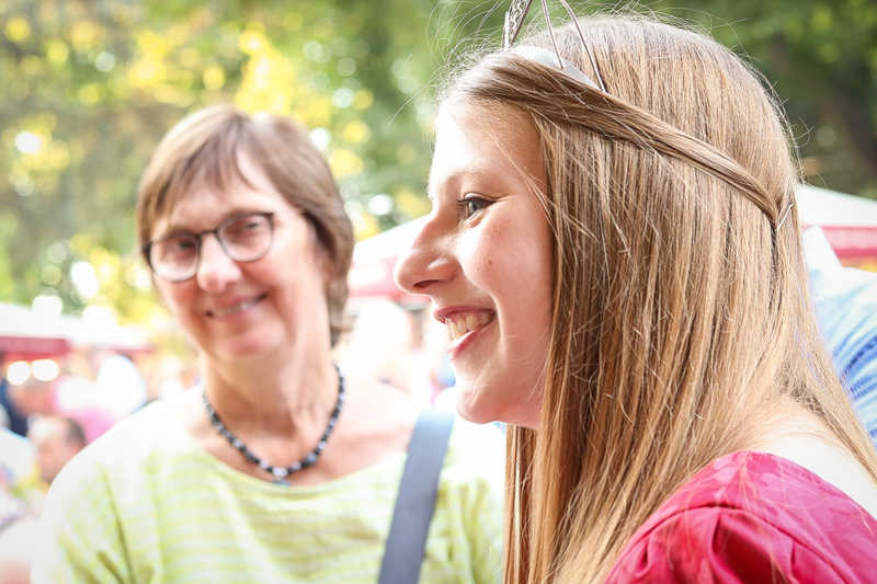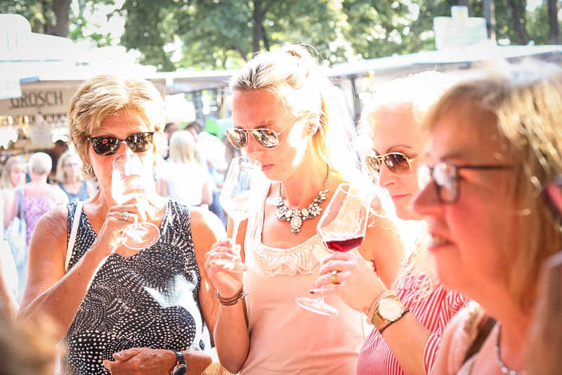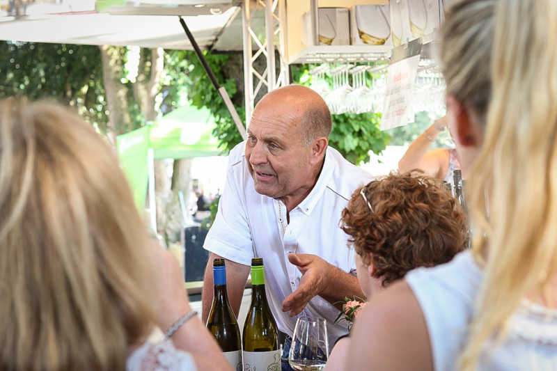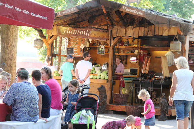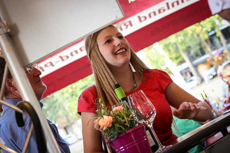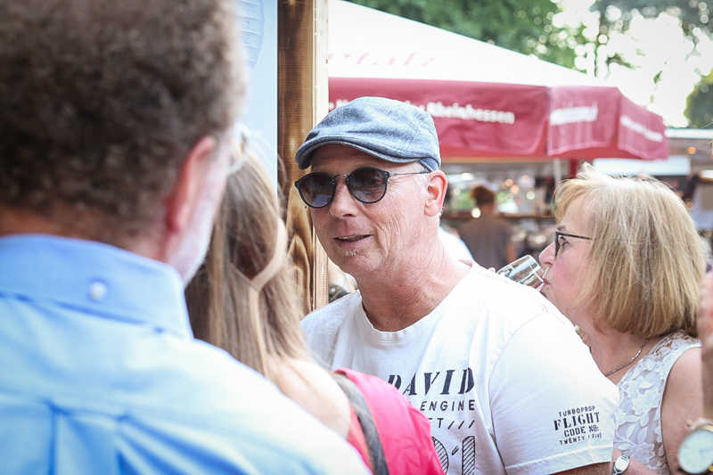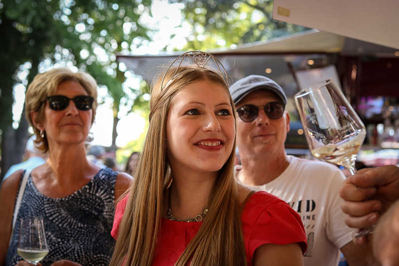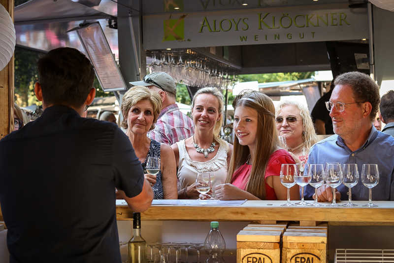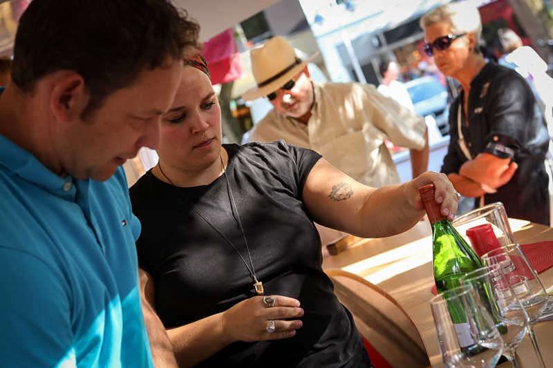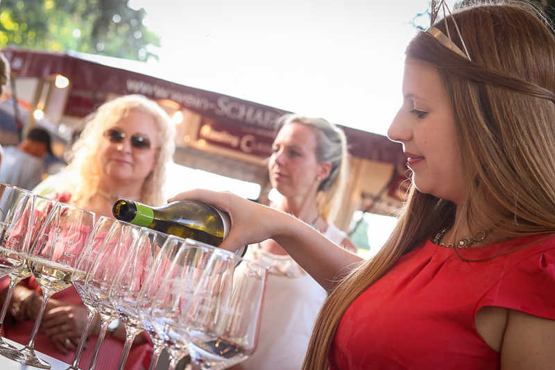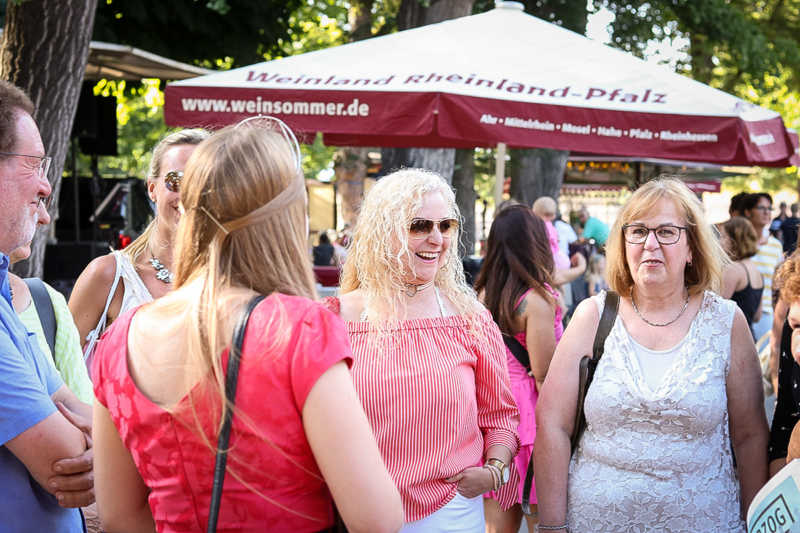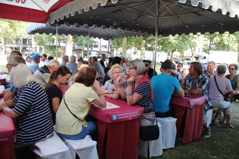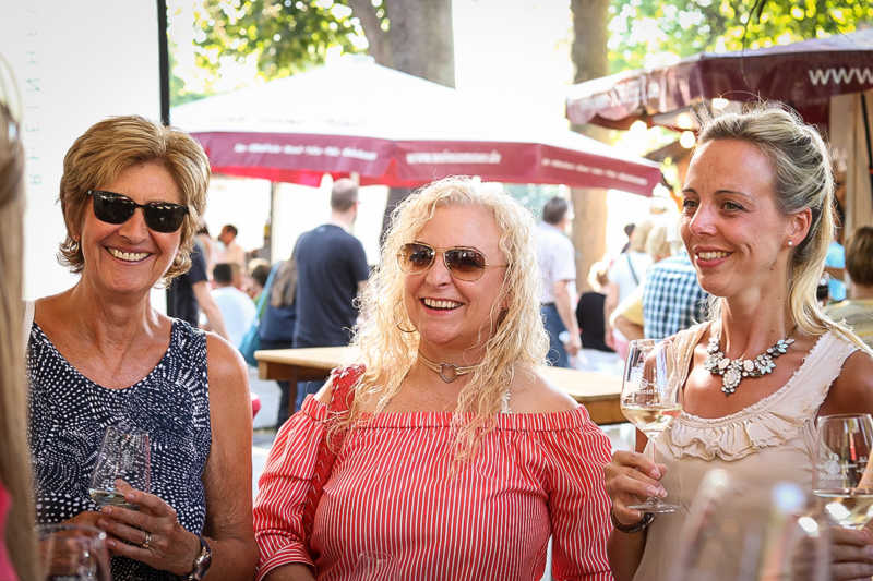 Schon die erste Begegnung war etwas besonderes: Morio Muskat hieß der Tropfen, den das Weingut Langenwalter ausschenkte. Eine Rebsorte, die heute nicht mehr sehr bekannt ist. In den 70er Jahren auf dem Vormarsch ist es nun ein Nischenwein, der aber eine außergewöhnliche Qualität hat, wie der Winzer erklärte – gerade weil er nur einen geringen Ertrag hat. Der Geschmackstest stimmte – den konnten sich die Gäste auf der Zunge zergehen lassen. Ein Terassen-Spaßwein nennt es Thorsten Langenwalter. „Für einen Tag wie heute perfekt“, meinte die Weinmajestät.