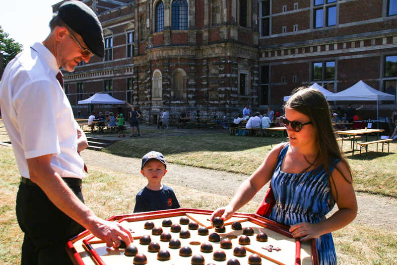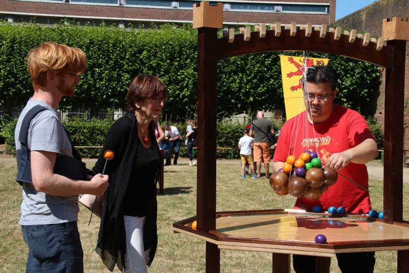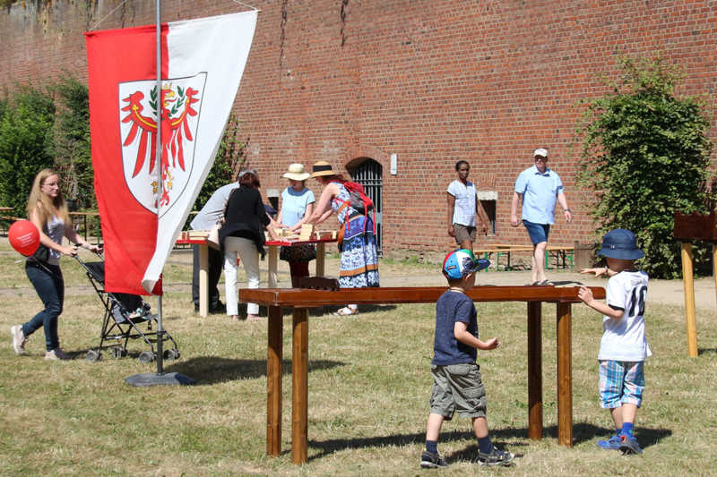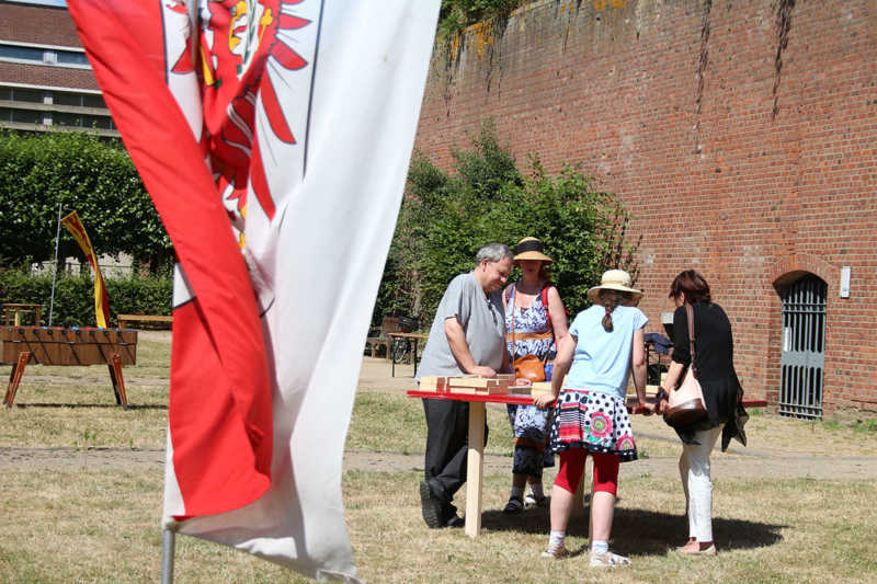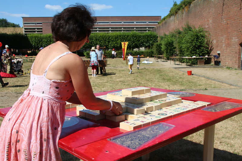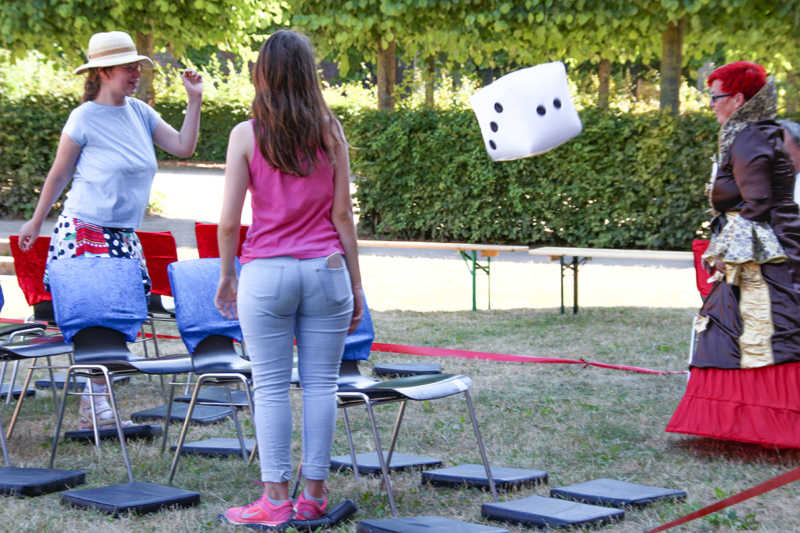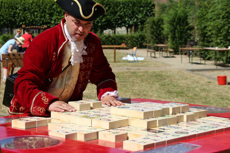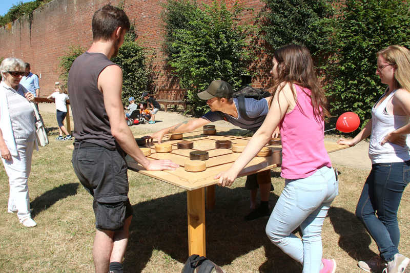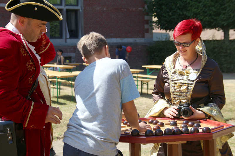 Wie nähert man sich der Festung Zitadelle spielerisch? Am besten beim Lebend-Mensch-Ärger-Dich nicht, Mahjong aber auch Kicker und Tischkegeln, bei „trou Madame“, Solitaire oder historischer Mühle. Die Abteilung Stadtmarketing der Stadt Jülich hatte zum 3.Renaissance-Picknick unter dem Motto „Spielen – gestern und heute“ eingeladen. Zehn Stationen waren – zuweilen sogar im Schatten – der Schlossfassade aufgebaut. Zur Stärkung gab es Kuchen und Pizza in Zitadellen-Form.