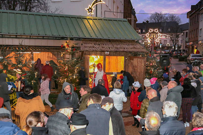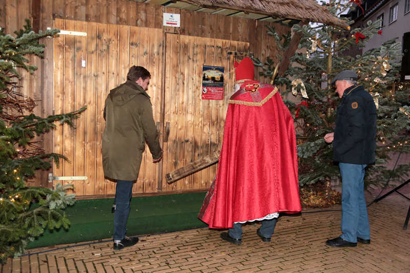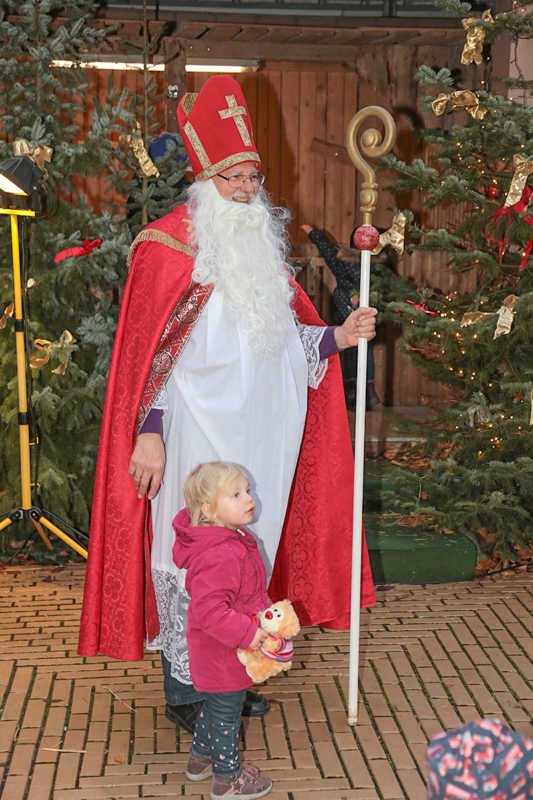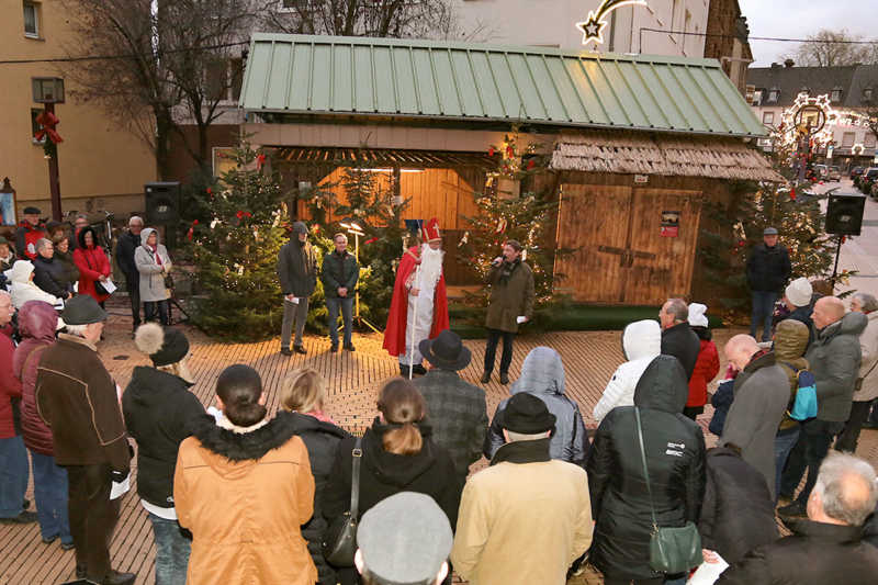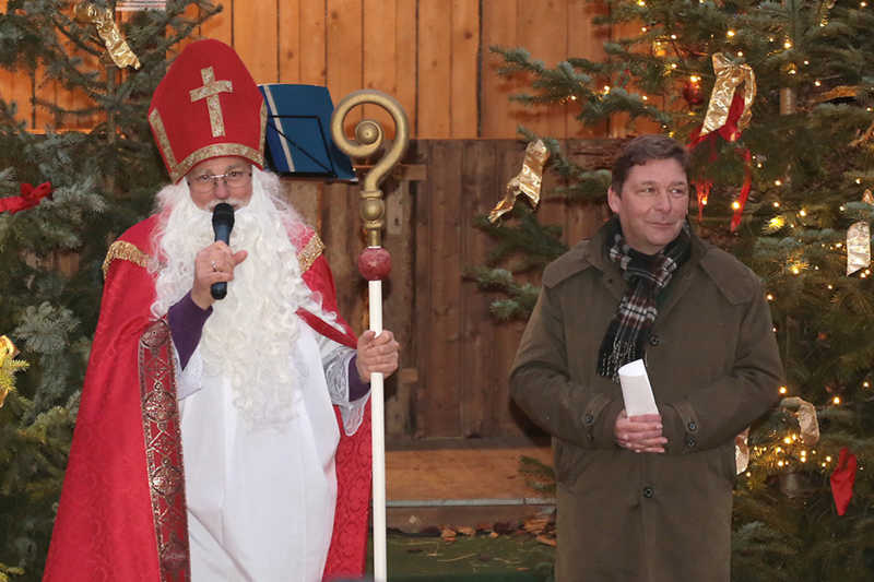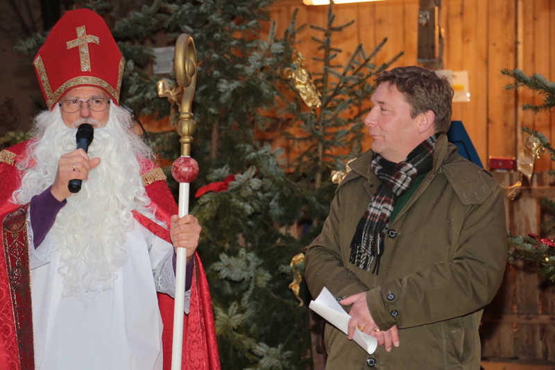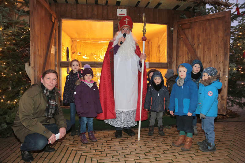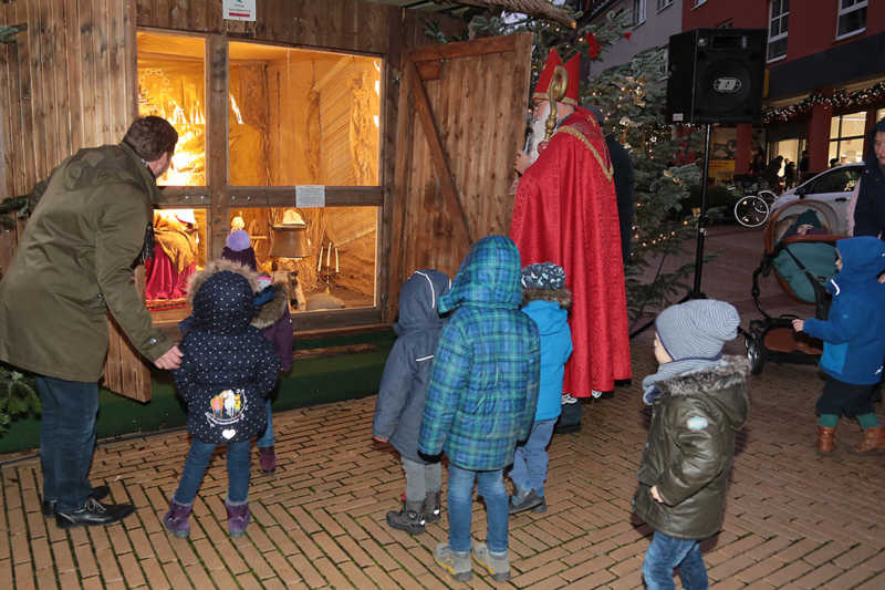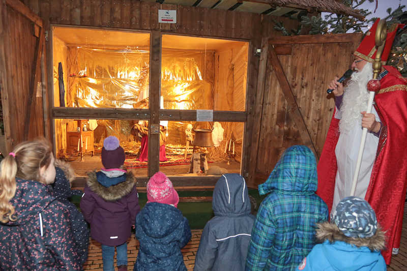 Gemeinsam mit dem Bürgermeister wurde die Krippe feierlich eröffnet, viele Kinder kamen direkt dazu. Der Nikolaus bedankte sich ganz besonders bei den vielen Helfern, die über viele Wochen fleißig gearbeitet haben. Bei der beginnenden Dämmerung wurde die ganze Pracht sichtbar, der neue Sternenhimmel über den Buden erzeugte ein heimeliges Ambiente.