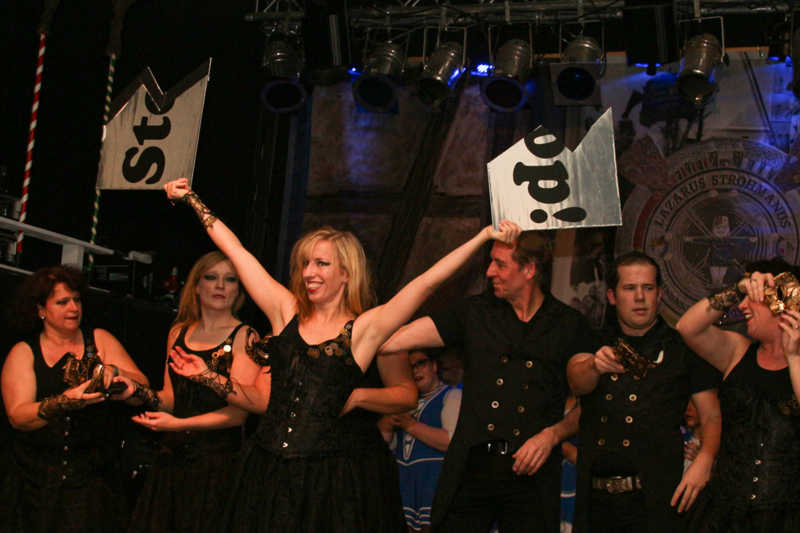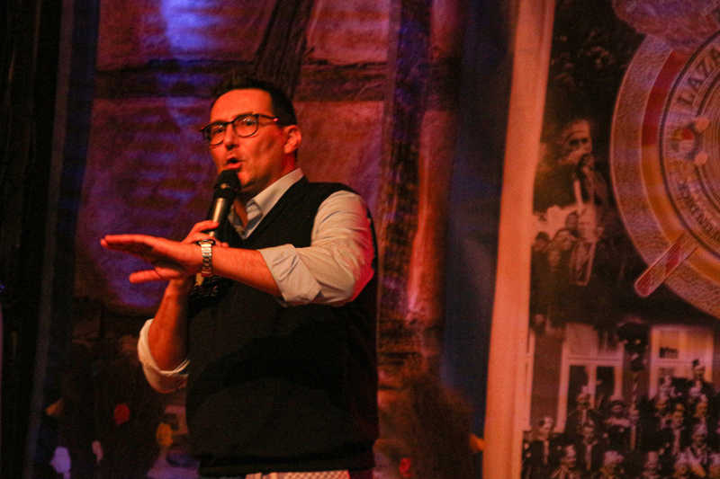 Schenkelklopfer und „Ohs“ verursachte Oli, der Köbes, der zum „Warm-up“ mit den Gästen erst einmal Werbung der Vorzeit durchdeklinierte und für schiere Begeisterung mit den „Verhörern“ sorgte.