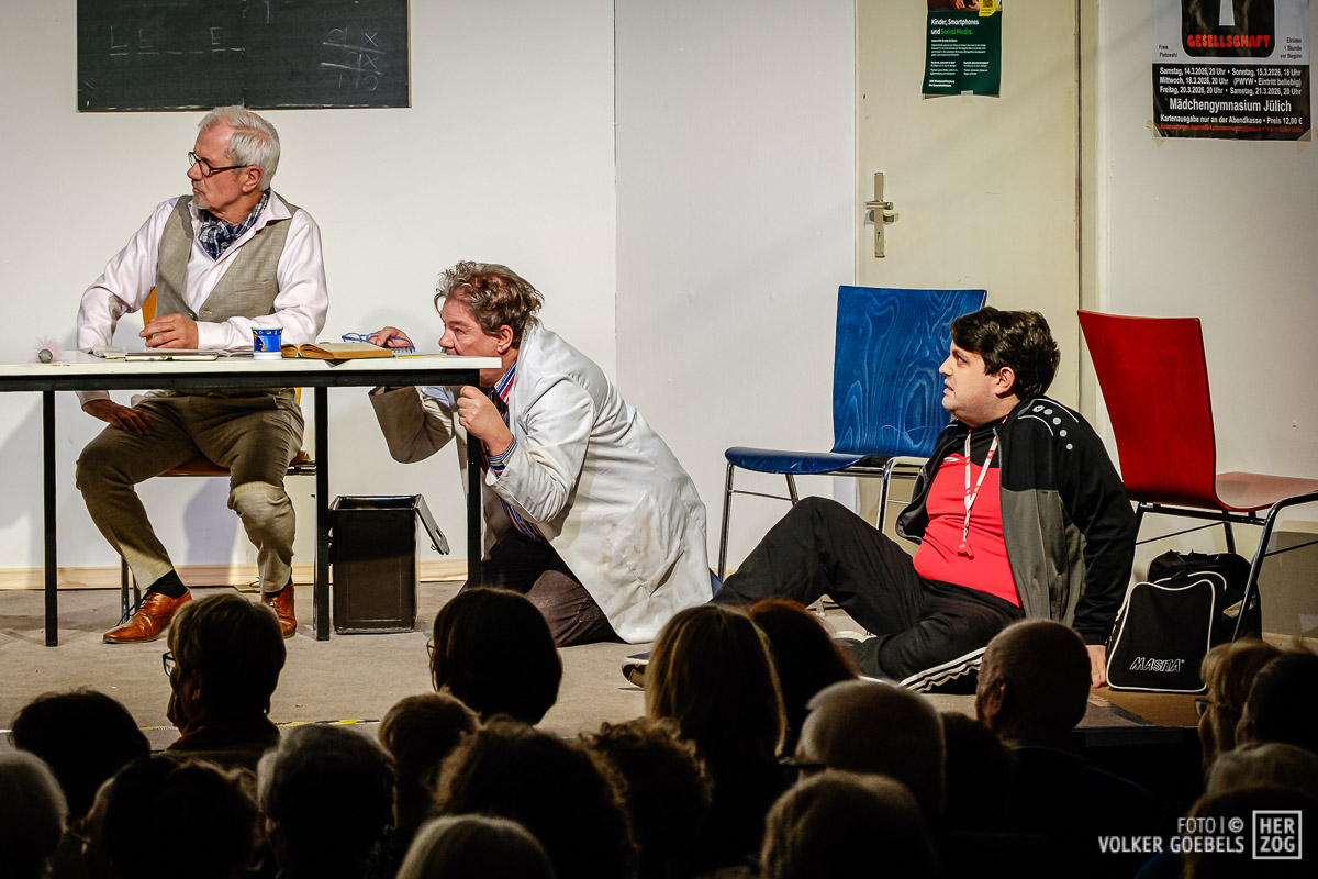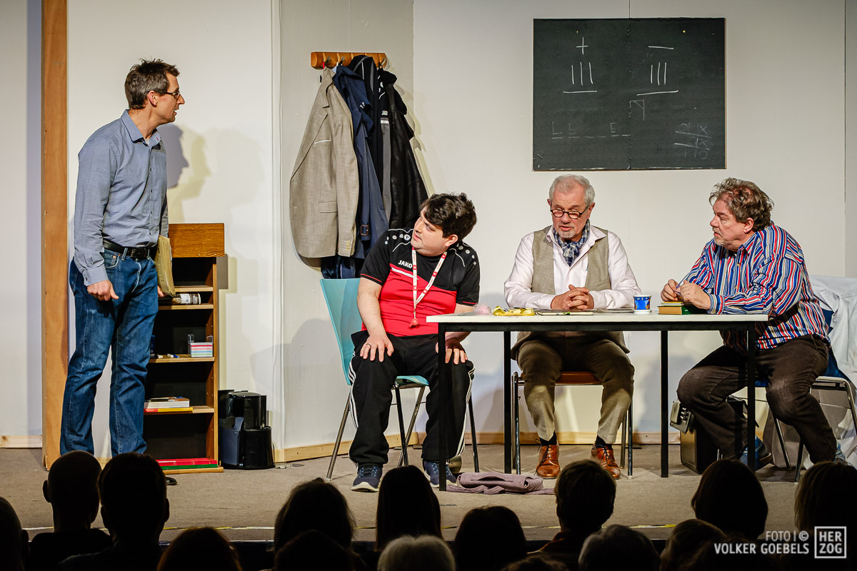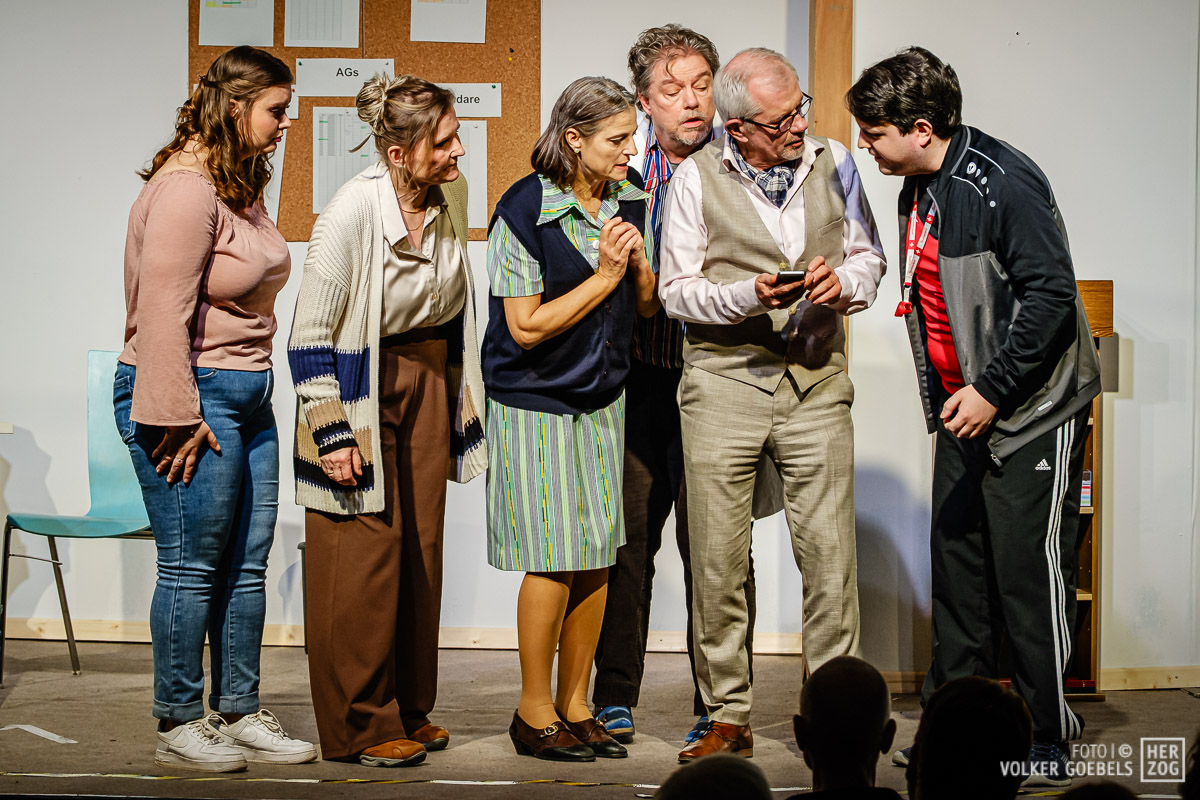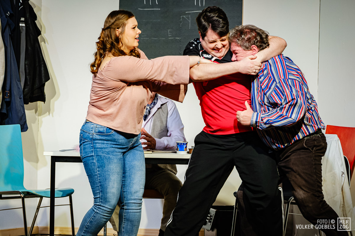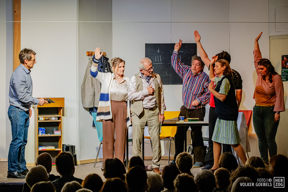 Die besetzt das Ensemble unter der Regie von Christoph Fischer übrigens glänzend. Der verzweifelte Vater vierer Kinder wird überzeugend und einfühlsam in Szene gesetzt von Henning Achenbach. Ausgerechnet dem Mimen, der im Hauptberuf Lehrer ist – oder gerade deswegen? Herrlich in der Rolle des verkannten Professors: Jens Range. Souverän wie stets bringt Bert Voiss seine langjährige Erfahrung mit großer Präsenz auf die Bühne. Philipp Hardt verkörpert den junggebliebenen und leicht erregbaren Sportlichen, herrlich gelassen die Referendarin Lisa Kloschinski und „Ute“ alias Brigit Bergk, eine Vertrauenslehrerin, der man vertrauen würde. Bei der Premiere stieg Melanie Zehnpfennig in die Schuhe der zynischen Jugendverachterin, die sie mit großartiger Mimik glaubhaft machte; in der Sonntagsaufführung übernahm Claudia Cormann-Wiersch, die für die Einlage von Schuberts Frühlingslied jubelnden Szenenapplaus erhielt. Dieser Figur ist der persönlich gekürte Lieblingswortwechsel zu verdanken: „Sie sind so arrogant!“ sagt der Sportlehrer, die Antwort: „Das sieht nur von unten so aus.“ Herrlich!
