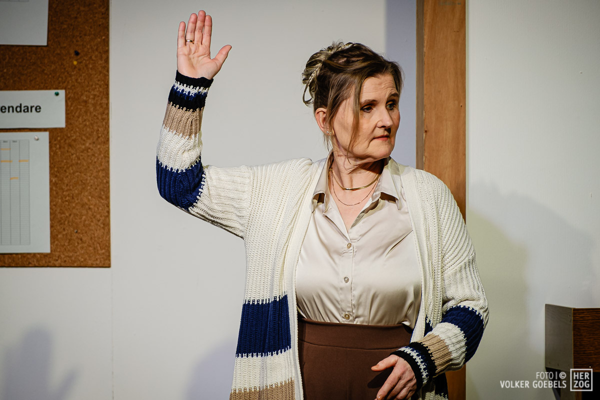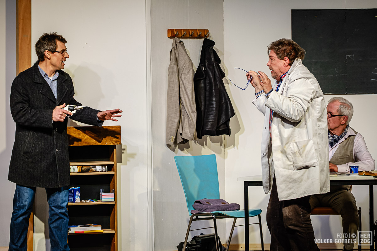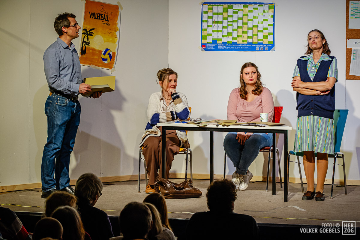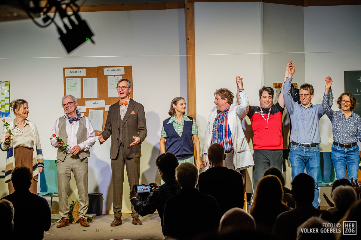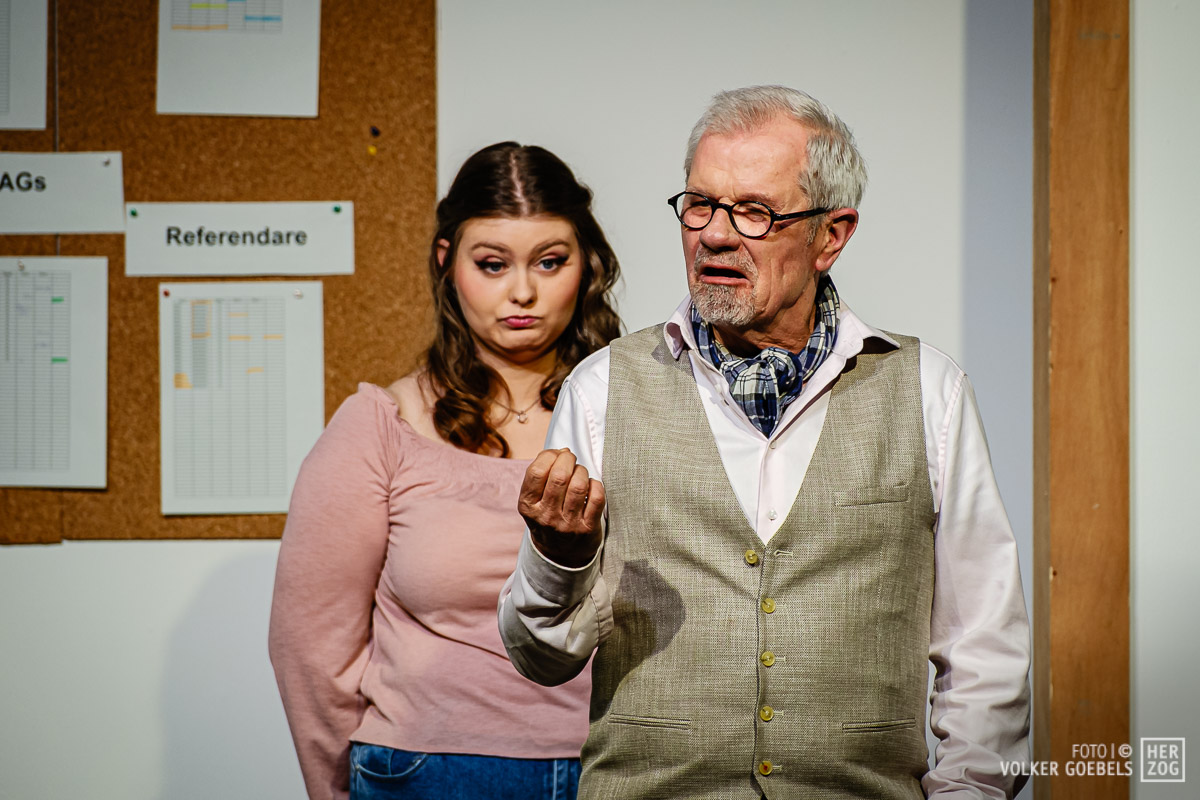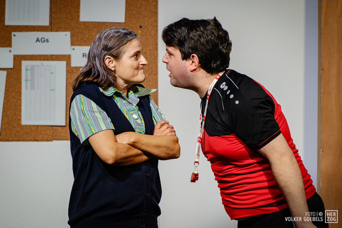 Die besetzt das Ensemble unter der Regie von Christoph Fischer übrigens glänzend. Der verzweifelte Vater vierer Kinder wird überzeugend und einfühlsam in Szene gesetzt von Henning Achenbach. Ausgerechnet dem Mimen, der im Hauptberuf Lehrer ist – oder gerade deswegen? Herrlich in der Rolle des verkannten Professors: Jens Range. Souverän wie stets bringt Bert Voiss seine langjährige Erfahrung mit großer Präsenz auf die Bühne. Philipp Hardt verkörpert den junggebliebenen und leicht erregbaren Sportlichen, herrlich gelassen die Referendarin Lisa Kloschinski und „Ute“ alias Brigit Bergk, eine Vertrauenslehrerin, der man vertrauen würde. Bei der Premiere stieg Melanie Zehnpfennig in die Schuhe der zynischen Jugendverachterin, die sie mit großartiger Mimik glaubhaft machte; in der Sonntagsaufführung übernahm Claudia Cormann-Wiersch, die für die Einlage von Schuberts Frühlingslied jubelnden Szenenapplaus erhielt. Dieser Figur ist der persönlich gekürte Lieblingswortwechsel zu verdanken: „Sie sind so arrogant!“ sagt der Sportlehrer, die Antwort: „Das sieht nur von unten so aus.“ Herrlich!