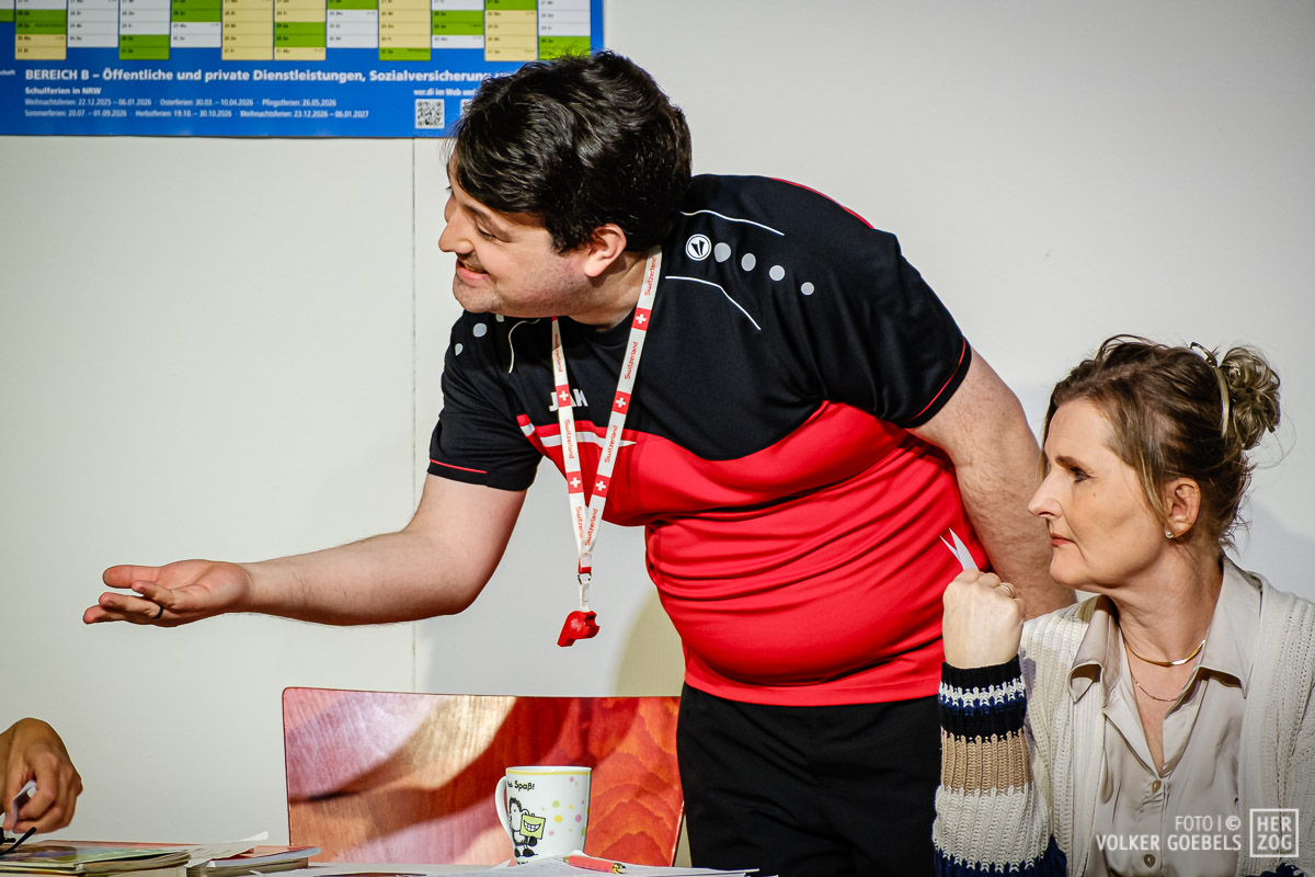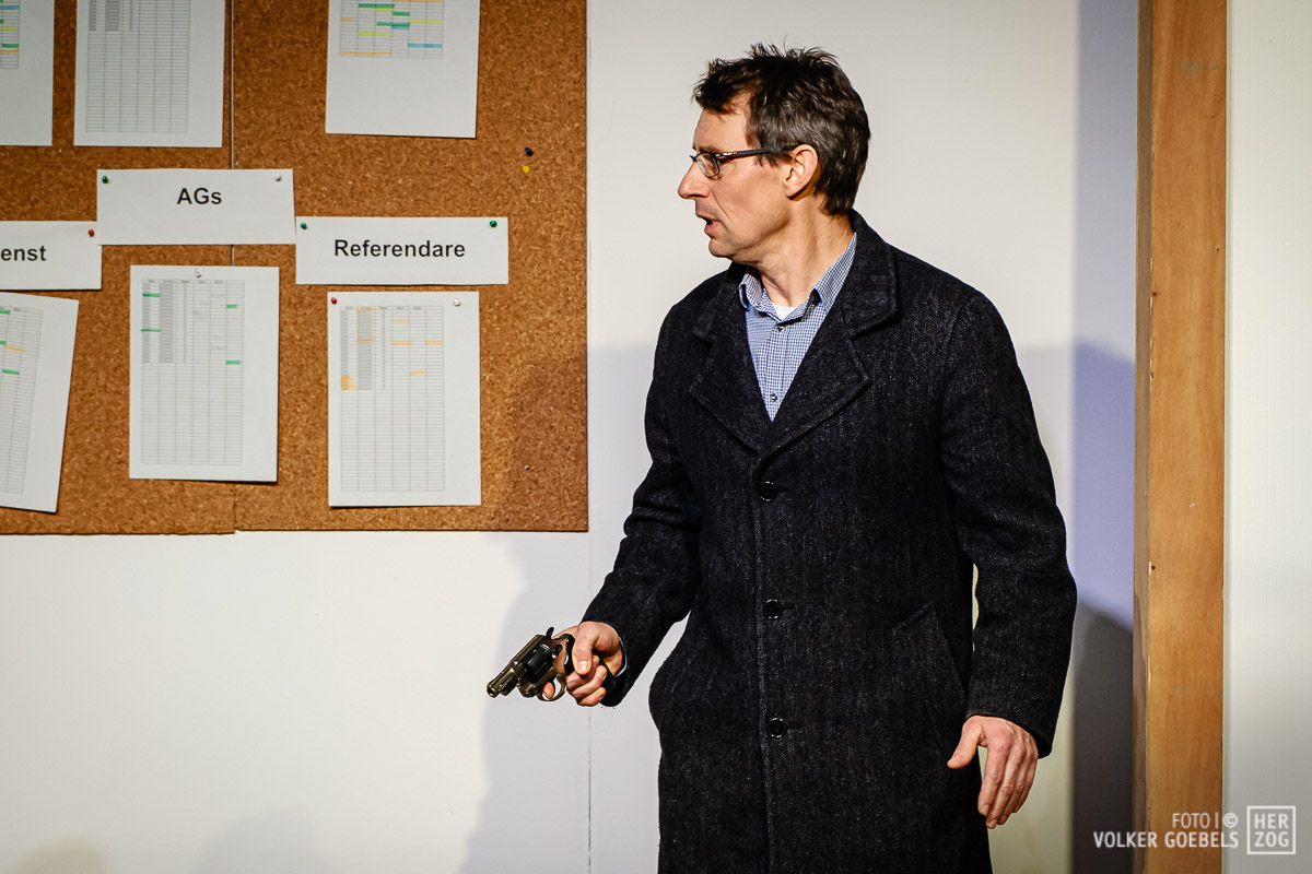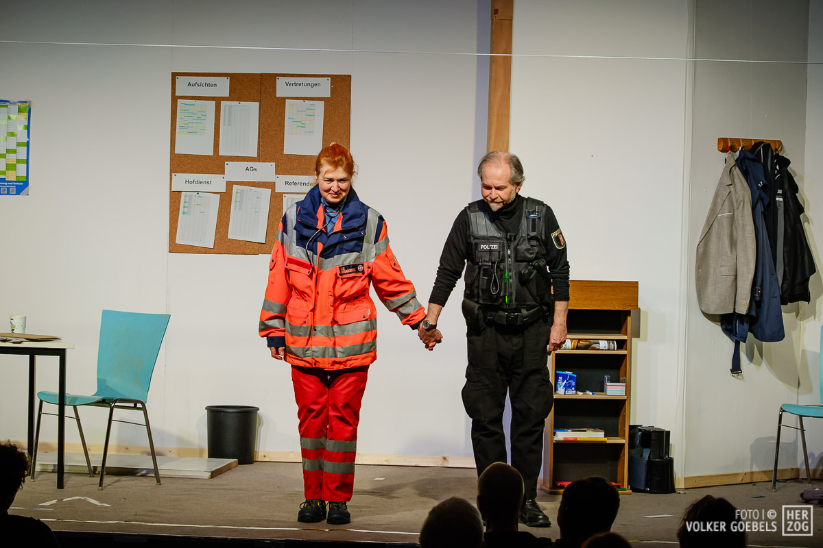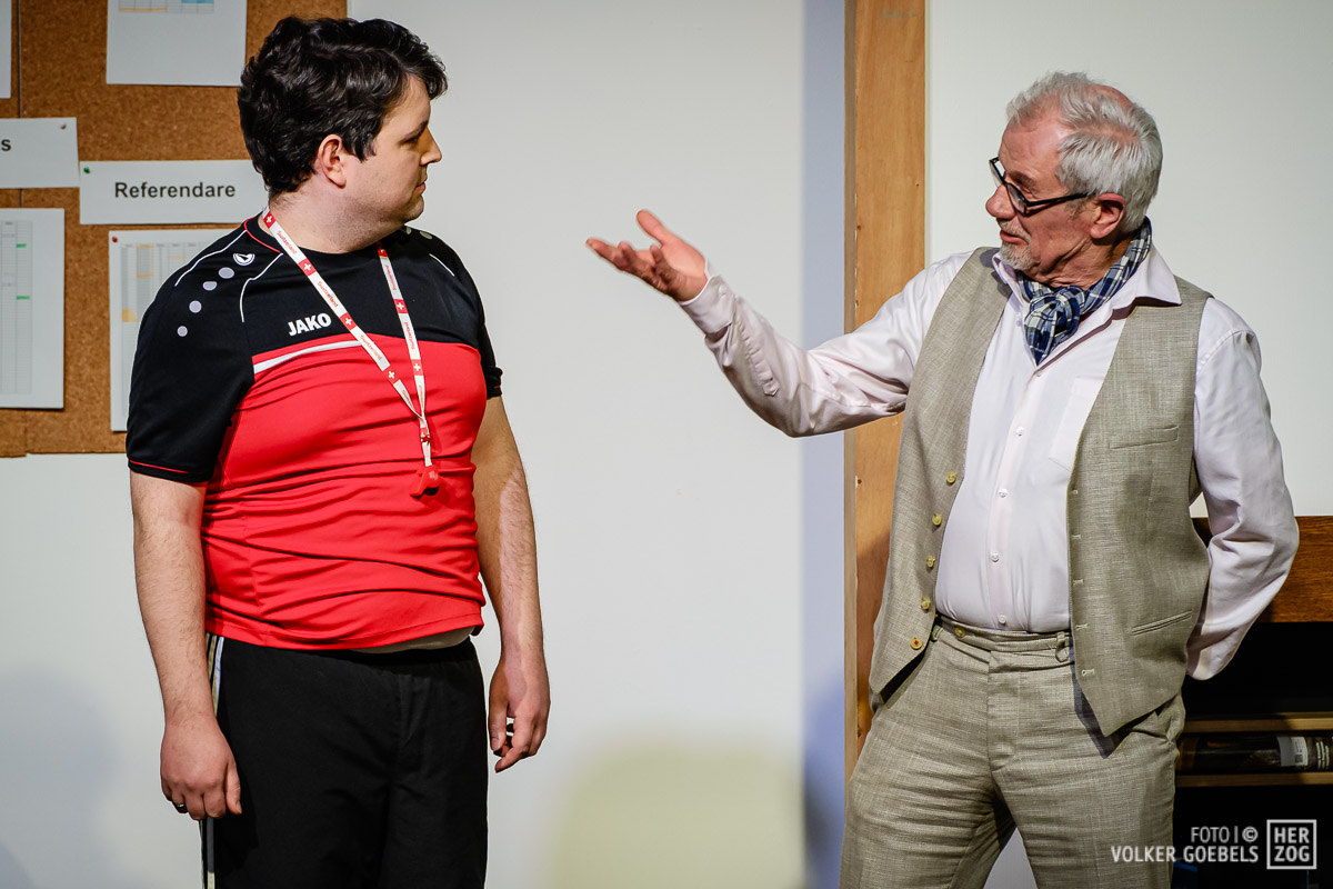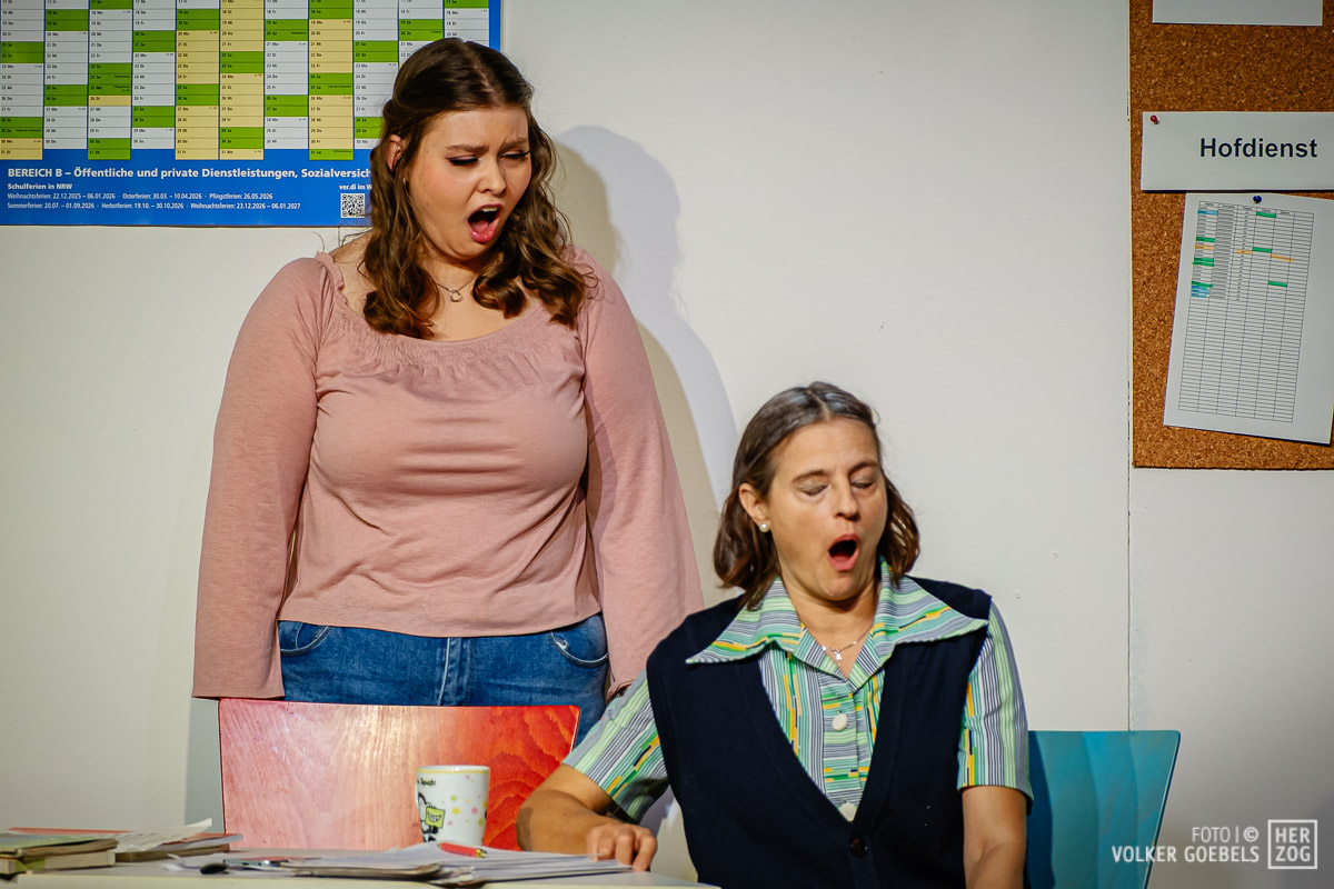 Die besetzt das Ensemble unter der Regie von Christoph Fischer übrigens glänzend. Der verzweifelte Vater vierer Kinder wird überzeugend und einfühlsam in Szene gesetzt von Henning Achenbach. Ausgerechnet dem Mimen, der im Hauptberuf Lehrer ist – oder gerade deswegen? Herrlich in der Rolle des verkannten Professors: Jens Range. Souverän wie stets bringt Bert Voiss seine langjährige Erfahrung mit großer Präsenz auf die Bühne. Philipp Hardt verkörpert den junggebliebenen und leicht erregbaren Sportlichen, herrlich gelassen die Referendarin Lisa Kloschinski und „Ute“ alias Brigit Bergk, eine Vertrauenslehrerin, der man vertrauen würde. Bei der Premiere stieg Melanie Zehnpfennig in die Schuhe der zynischen Jugendverachterin, die sie mit großartiger Mimik glaubhaft machte; in der Sonntagsaufführung übernahm Claudia Cormann-Wiersch, die für die Einlage von Schuberts Frühlingslied jubelnden Szenenapplaus erhielt. Dieser Figur ist der persönlich gekürte Lieblingswortwechsel zu verdanken: „Sie sind so arrogant!“ sagt der Sportlehrer, die Antwort: „Das sieht nur von unten so aus.“ Herrlich!