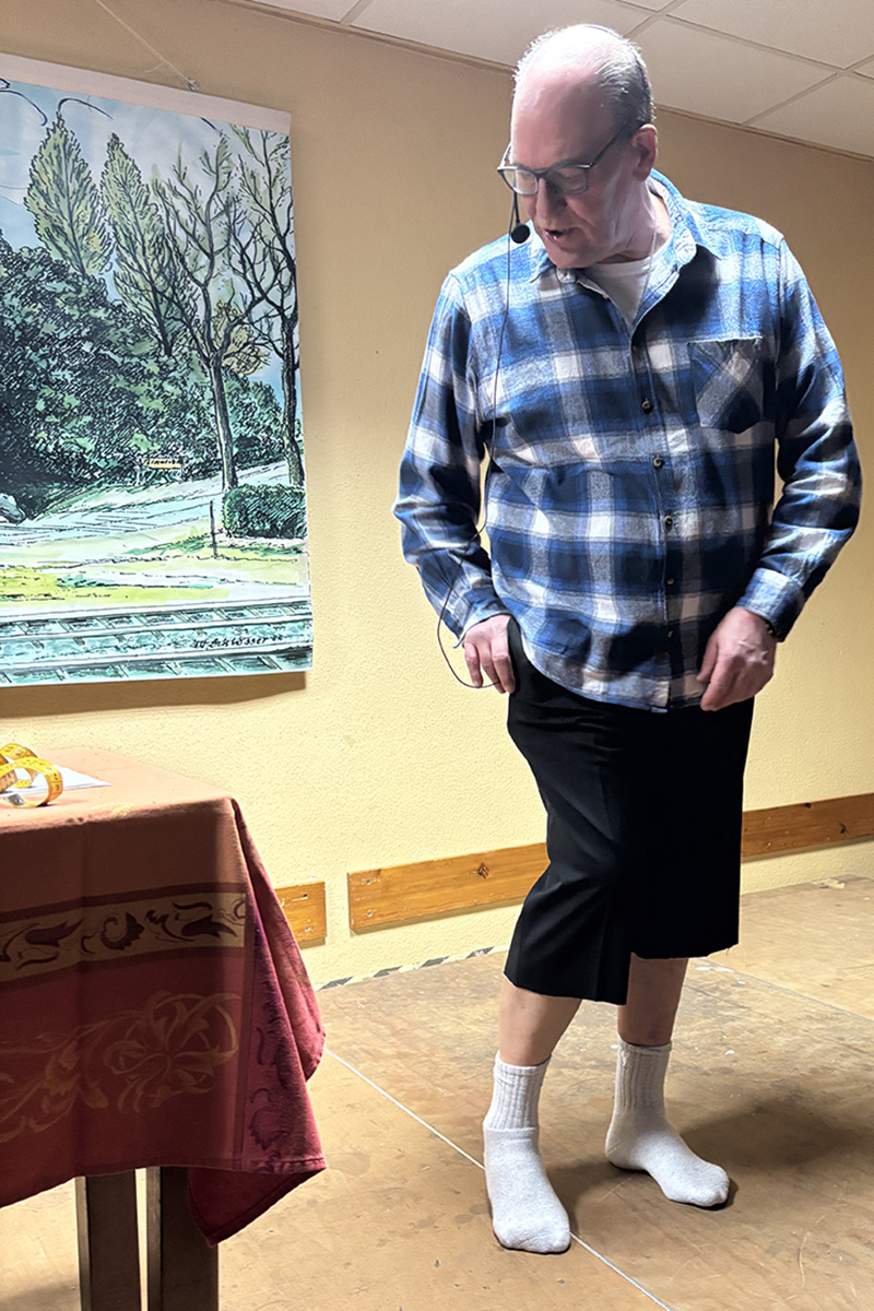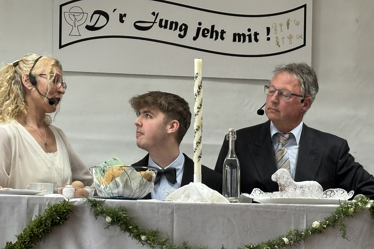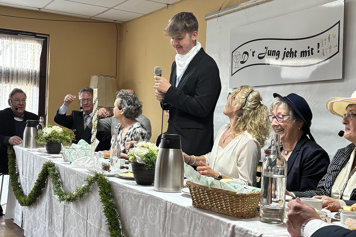 Gleich im ersten Akt bekam man Appetit auf die gute alte Kirchberger Zeit, denn bei der „Kommelion“ von der leeve Jung (Jonah Loevenich) durfte die Butter noch fingerdick aufs Brot geschmiert werden – schließlich könne man sich das ja leisten. Dick auftragen ist eben bei einer Kommunion dörflicher Standard – auch bei Kleidung und Deko. Das fand jedenfalls „Brita“ Eberhardt, die trotzdem ganz ungeniert das Buffet in die mitgebrachten Vorratsdosen lud – für schlechte Zeiten.