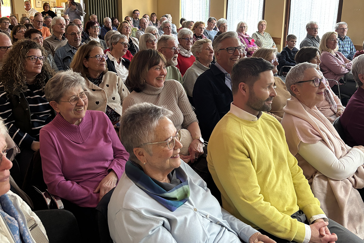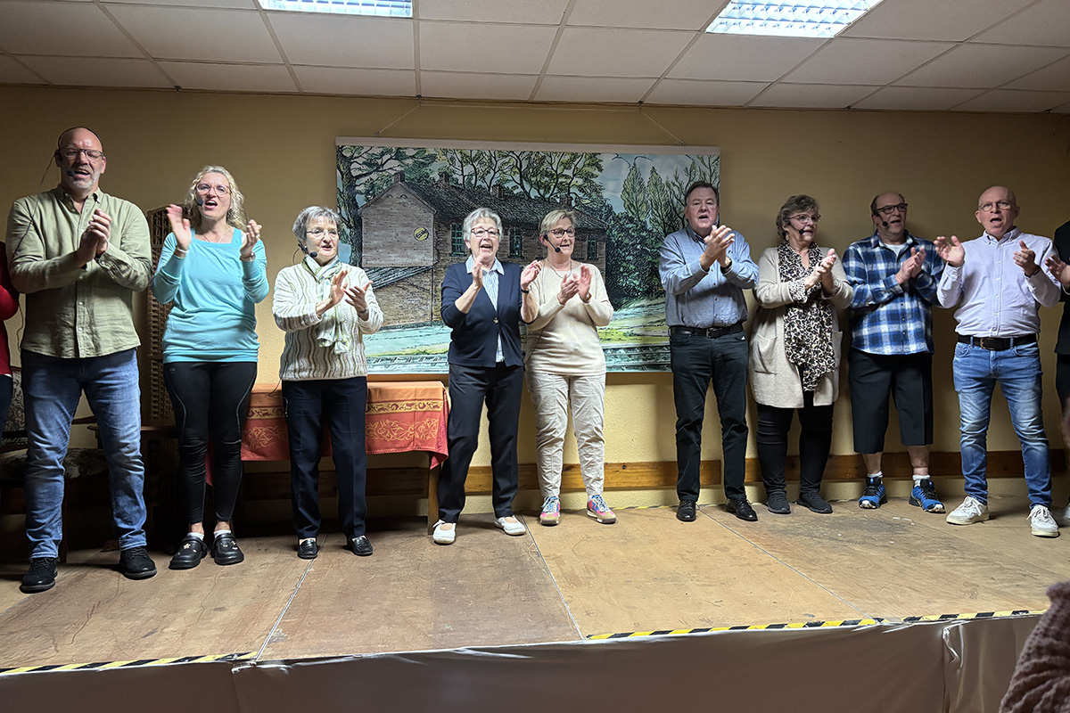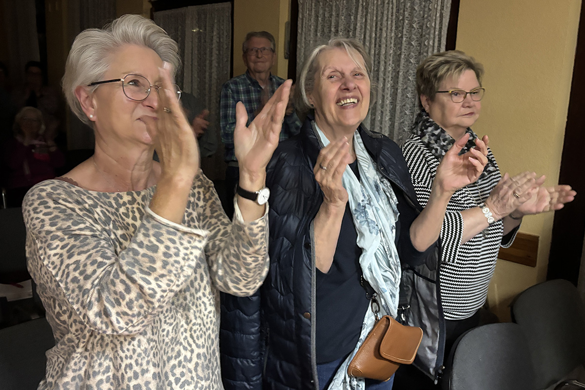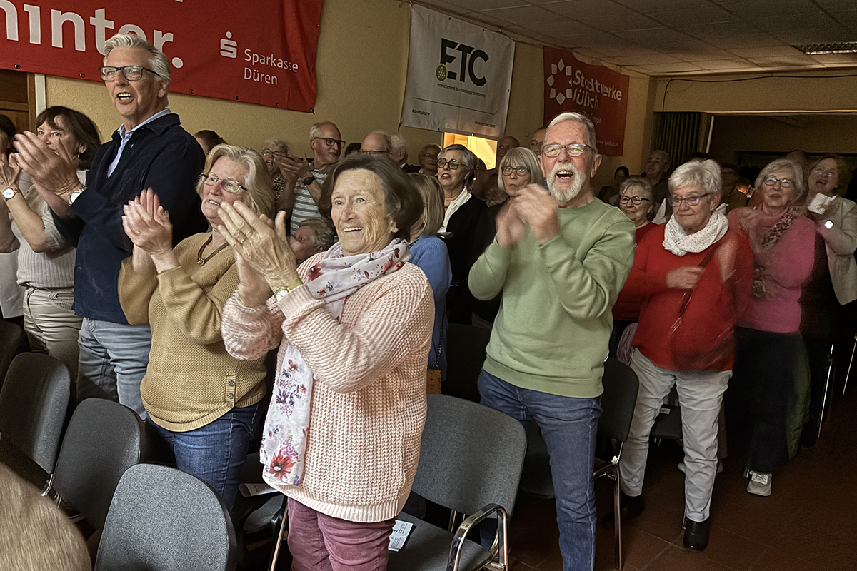 Dazu gab es Hematleeder von den beiden Dorfmusikanten Michael & Frank sowie einen Gastbeitrag von Georg Thevessen vom Arbeitskreis der Jülicher Mundartfreunde, der über die Freuden eines Opas las. Zum Abschluss gabs das Kirchberjer Leed und ein vom Publikum frenetisch geschunkeltes Kölsches Lied „en unserm Veedel“. Da war der Funke des Gemeinschaftsgefühls längst übergesprungen.