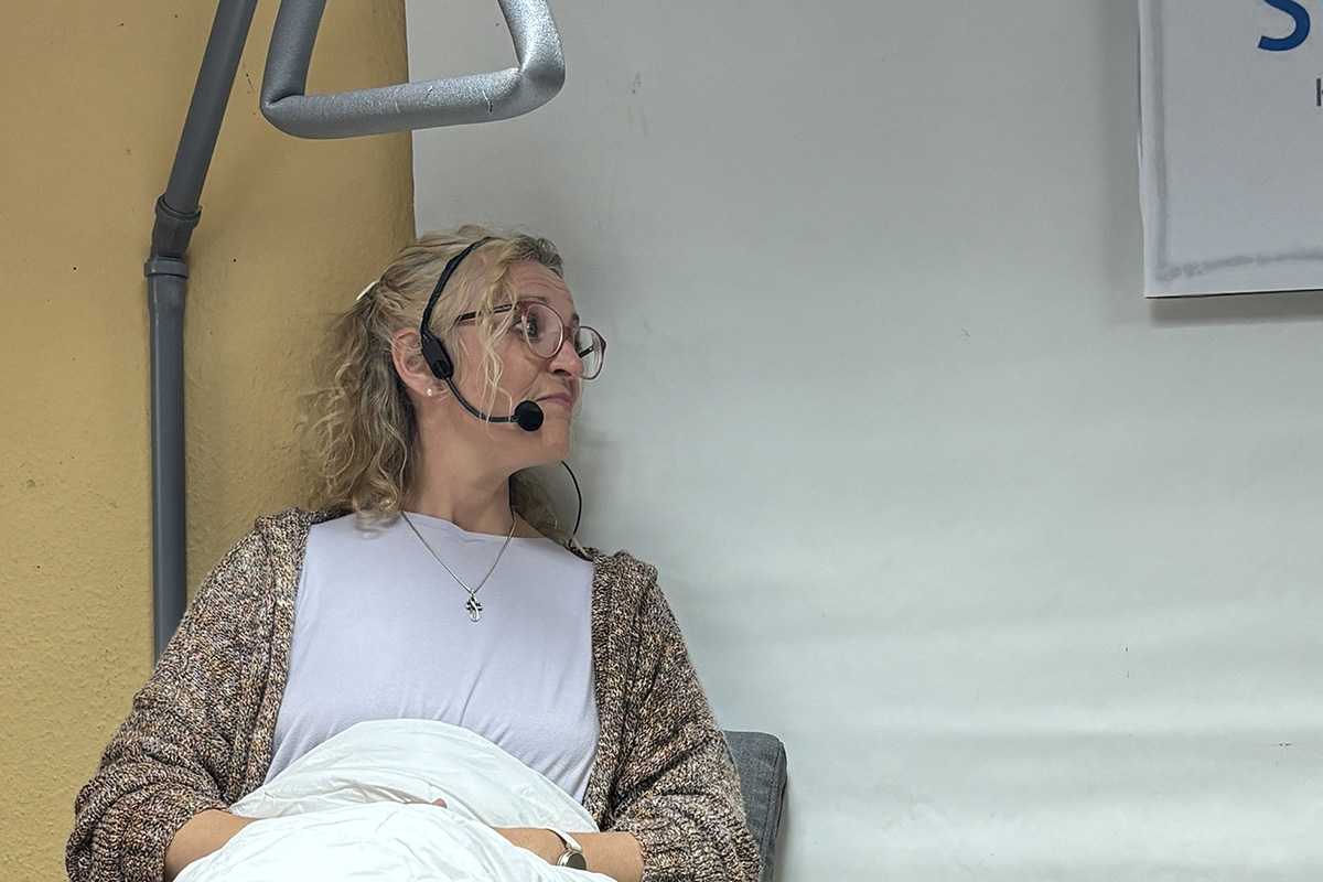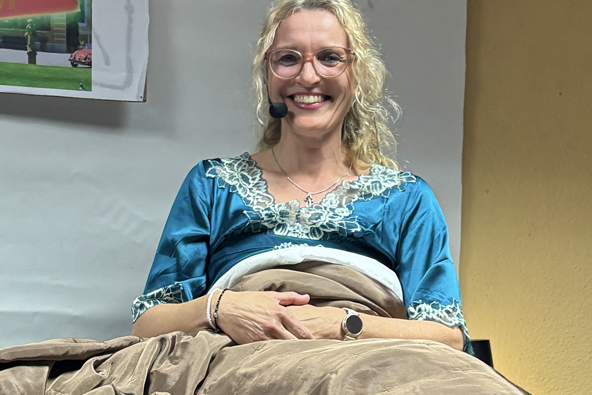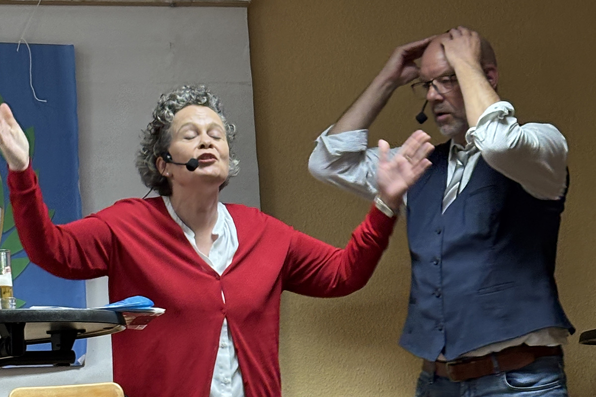 Um es gleich vorweg zu nehmen: Den Höhepunkt des Nachmittags werden die Gäste des Schauspiels sicher so schnell nicht vergessen: Es wurde brennend heiß, als Korinna Schmitz sich beim Bügeln im Homeoffice unter lebensnahem Stöhnen ganz ihrem Telefon-Sex Kunden widmete. Und der wollte keine schnelle Nummer. Ganz zum Leidwesen von Korinnas Ehemann Willi, der beherzt irgendwann selbst zum Hörer griff. Doch in punkto Leidenschaft und Phantasie über Fesselspiele konnte Willi nicht punkten. Umso mehr erlebte Kirchberg was an schauspielerischem Talent in Korinna Schmitz so schlummert, die zumindest verbal alle Hüllen fallen ließ.