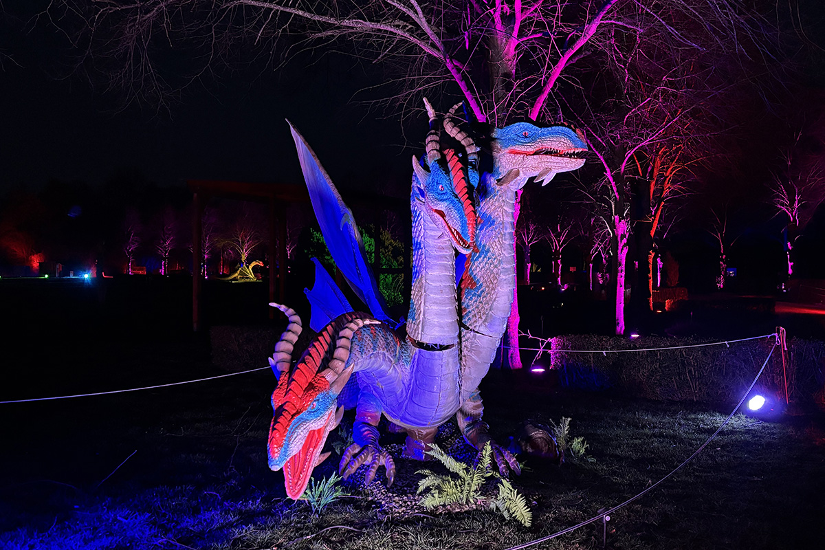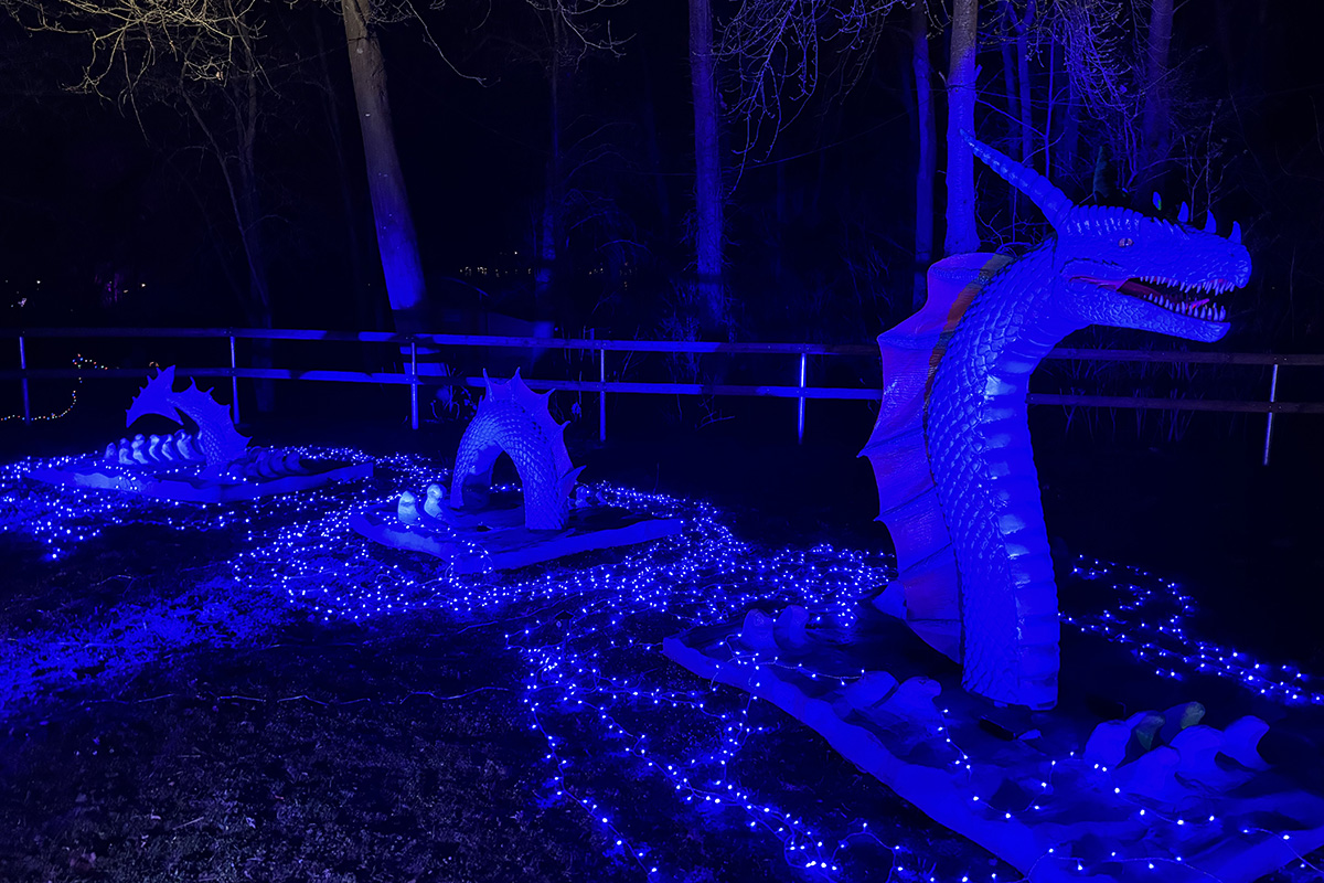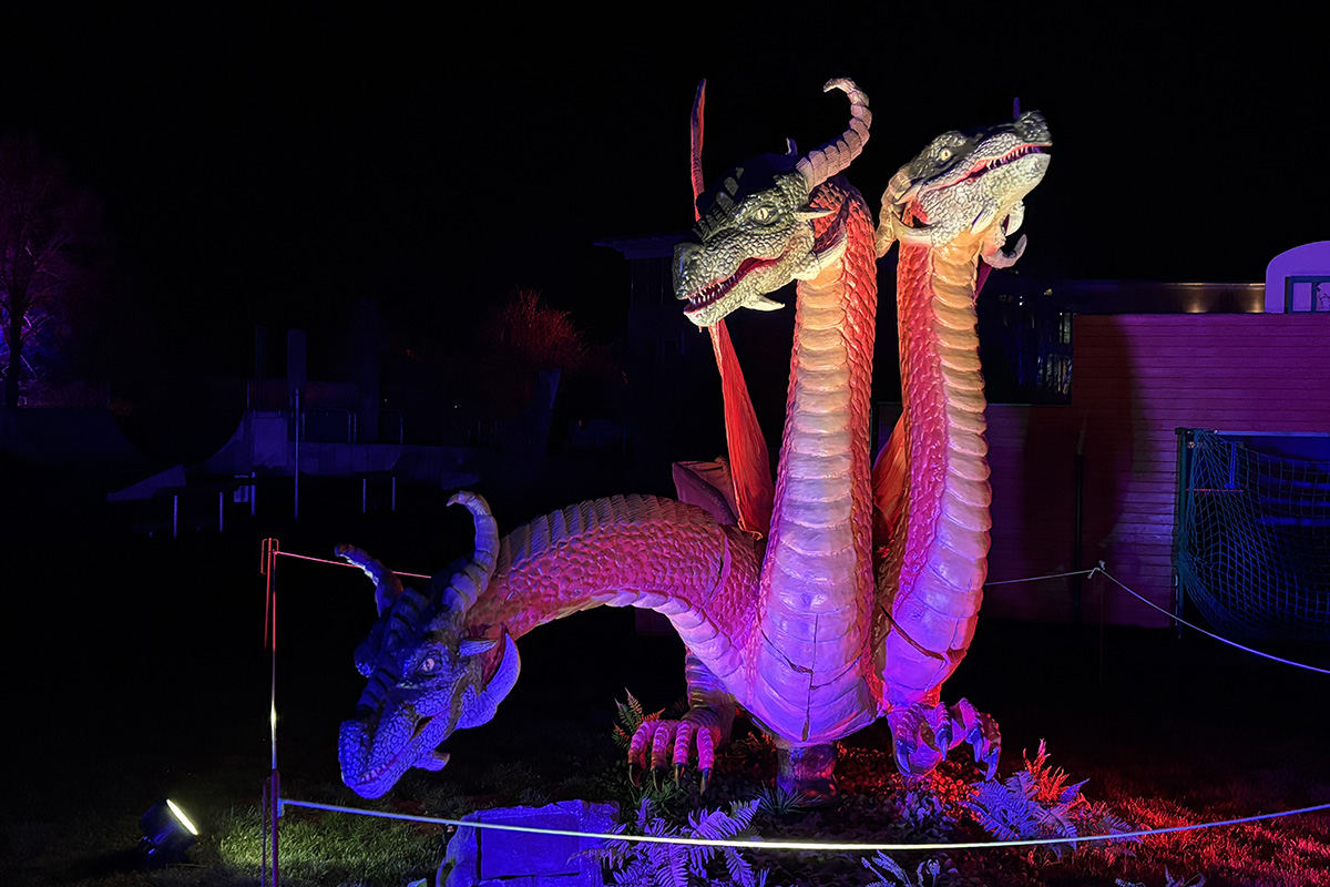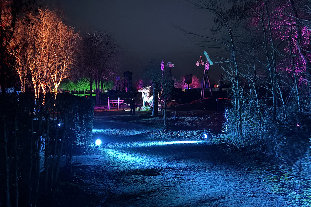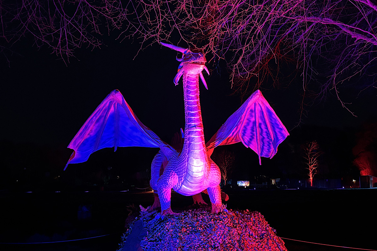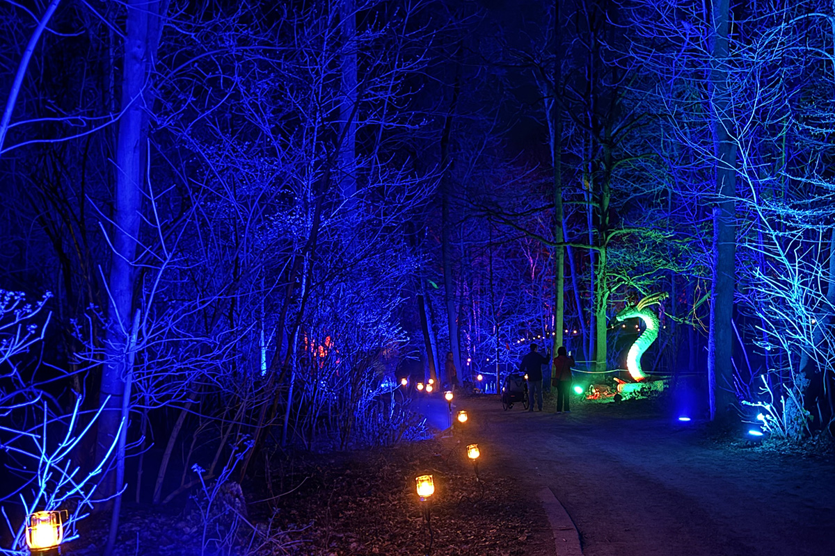 Der Rundgang beginnt am Lindenrondell am Eingang des Parks. Von dort aus führt die Route in Richtung Zoo. Aus Rücksicht auf die Tiere bleibt dieser Bereich allerdings ausgespart. Stattdessen schwenkt der Weg kurz davor durch den Wald zurück, vorbei am Spielplatz und schließlich wieder in Richtung Lindenrondell. Wer der empfohlenen Route folgt, erlebt die Installation so, wie sie gedacht ist – denn einige Lichtinstallationen sind gezielt ausgerichtet und könnten sonst blenden. Dabei ist auch ein Drache mit einer Höhe von über drei Metern; er ragt über die Besucher hinweg. Andere Exemplare besitzen gleich zwei oder sogar drei Köpfe und wirken dadurch noch imposanter. Manchmal fühlt man sich beim Rundgang fast wie in „Jurassic Park“ – nur eben mit Drachen. Gerade für Kinder dürfte der Spaziergang durch die beleuchtete Drachenwelt ein echtes Erlebnis werden.