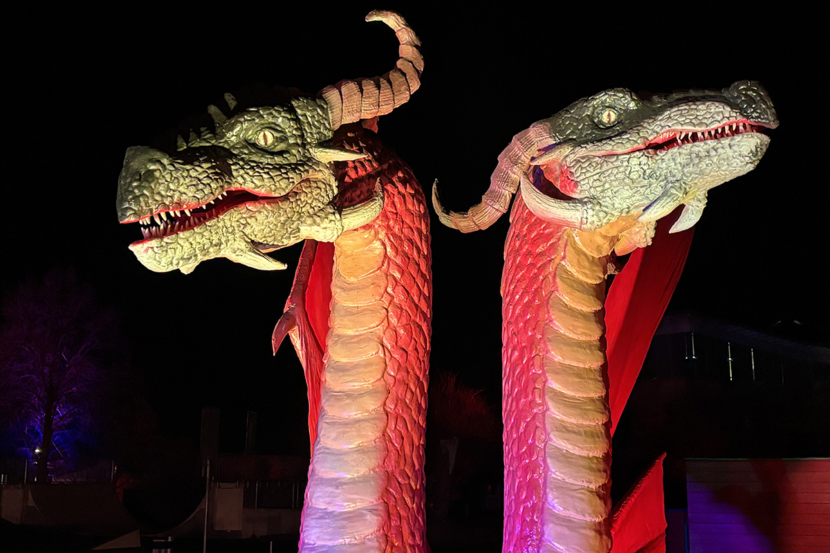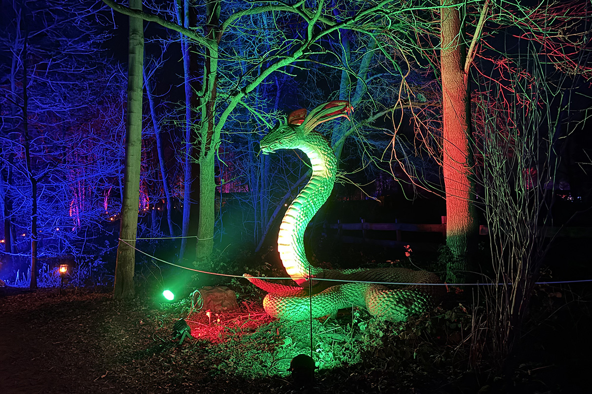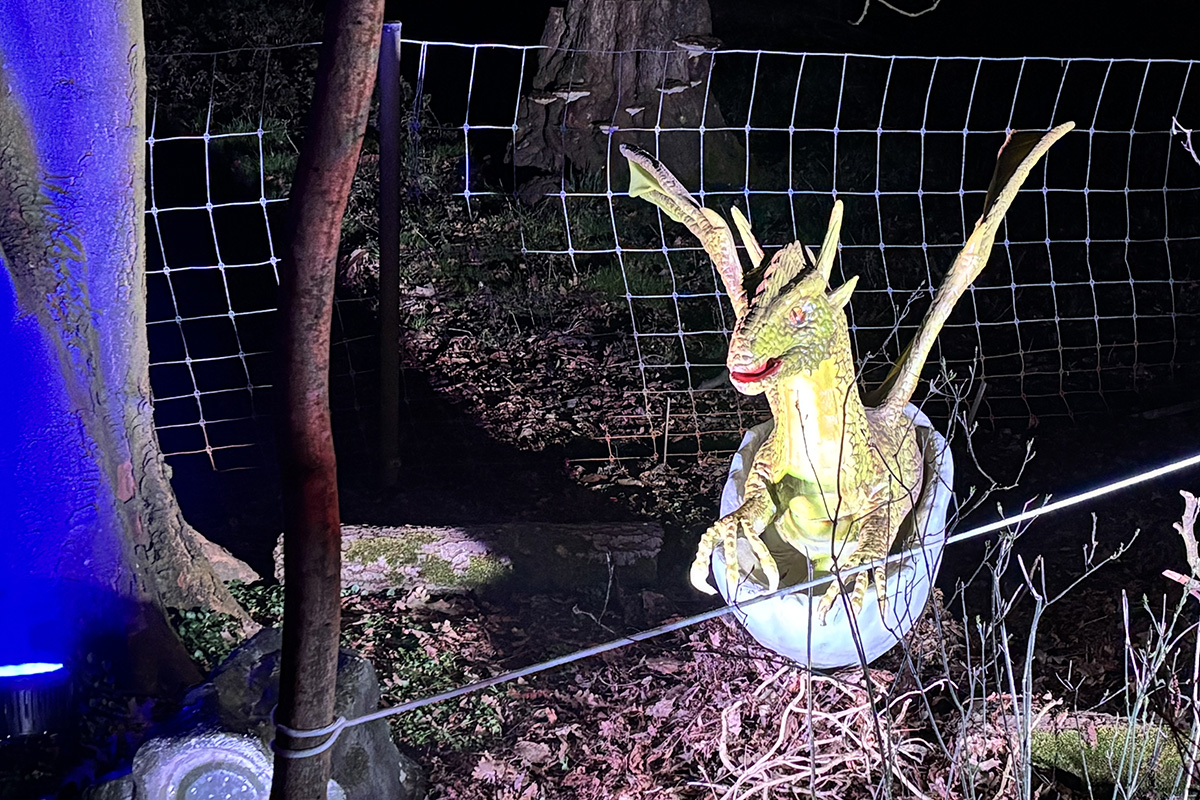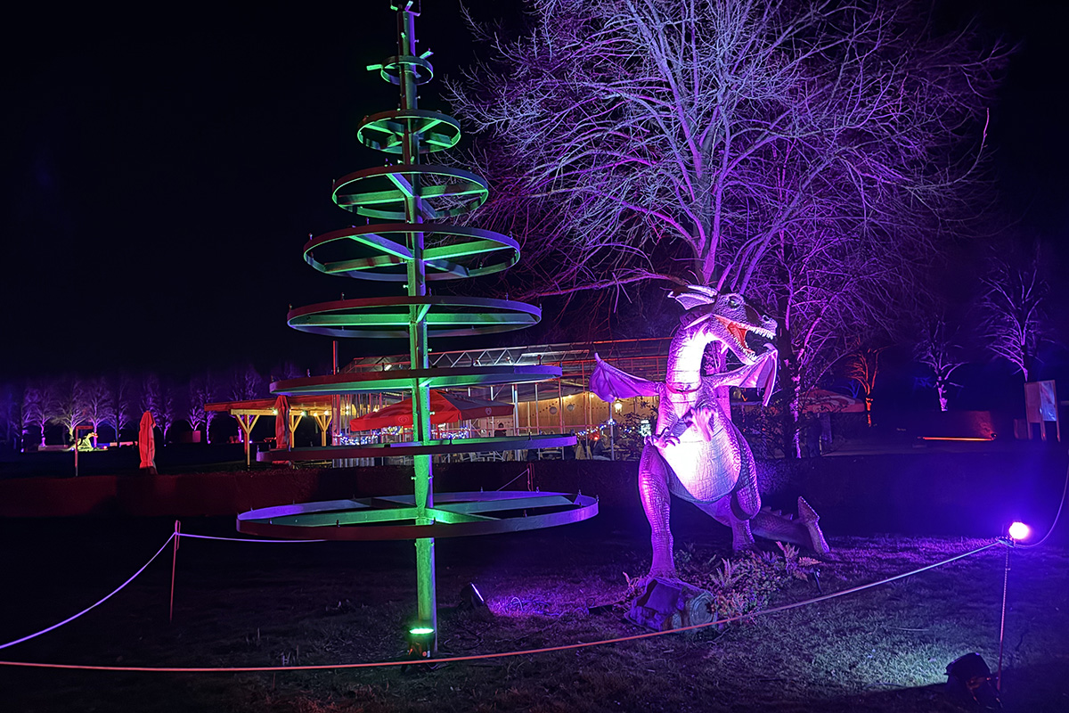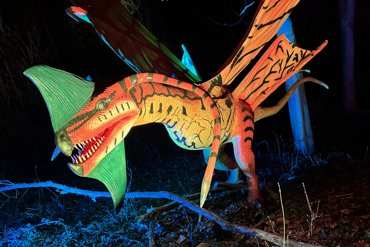 Der Rundgang beginnt am Lindenrondell am Eingang des Parks. Von dort aus führt die Route in Richtung Zoo. Aus Rücksicht auf die Tiere bleibt dieser Bereich allerdings ausgespart. Stattdessen schwenkt der Weg kurz davor durch den Wald zurück, vorbei am Spielplatz und schließlich wieder in Richtung Lindenrondell. Wer der empfohlenen Route folgt, erlebt die Installation so, wie sie gedacht ist – denn einige Lichtinstallationen sind gezielt ausgerichtet und könnten sonst blenden. Dabei ist auch ein Drache mit einer Höhe von über drei Metern; er ragt über die Besucher hinweg. Andere Exemplare besitzen gleich zwei oder sogar drei Köpfe und wirken dadurch noch imposanter. Manchmal fühlt man sich beim Rundgang fast wie in „Jurassic Park“ – nur eben mit Drachen. Gerade für Kinder dürfte der Spaziergang durch die beleuchtete Drachenwelt ein echtes Erlebnis werden.