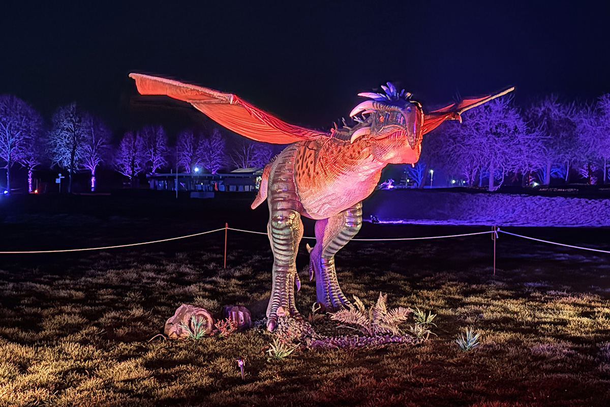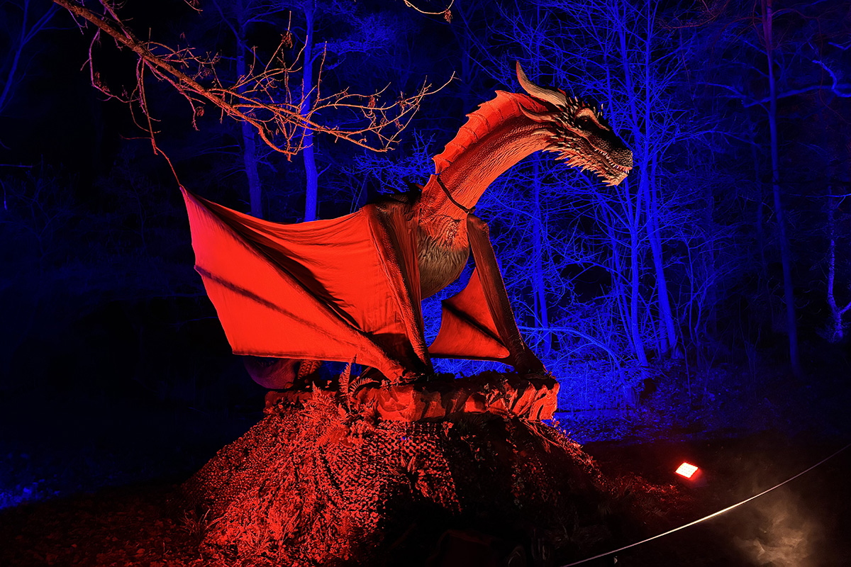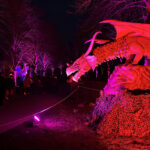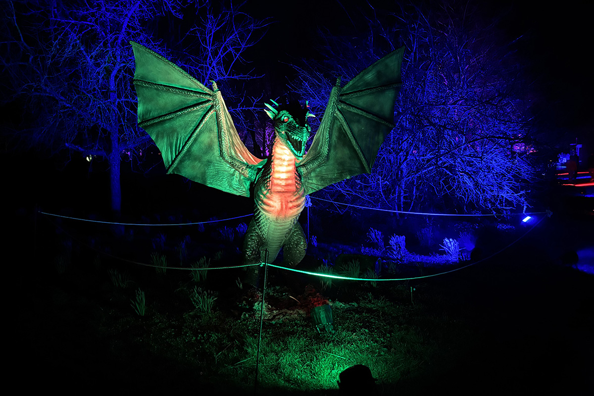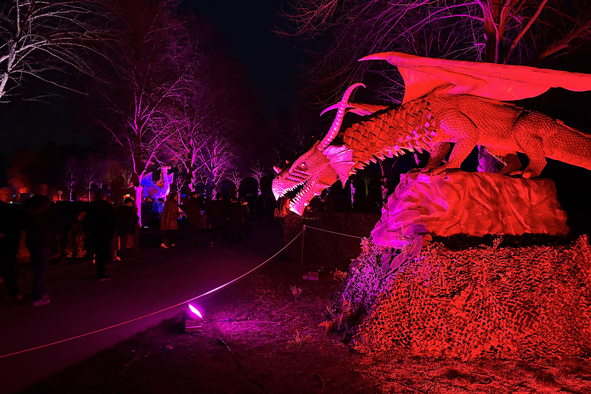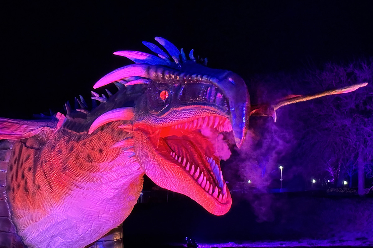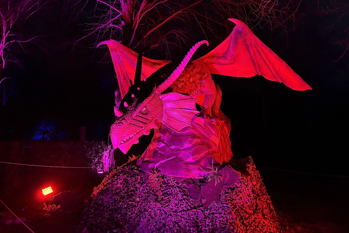 Der Rundgang beginnt am Lindenrondell am Eingang des Parks. Von dort aus führt die Route in Richtung Zoo. Aus Rücksicht auf die Tiere bleibt dieser Bereich allerdings ausgespart. Stattdessen schwenkt der Weg kurz davor durch den Wald zurück, vorbei am Spielplatz und schließlich wieder in Richtung Lindenrondell. Wer der empfohlenen Route folgt, erlebt die Installation so, wie sie gedacht ist – denn einige Lichtinstallationen sind gezielt ausgerichtet und könnten sonst blenden. Dabei ist auch ein Drache mit einer Höhe von über drei Metern; er ragt über die Besucher hinweg. Andere Exemplare besitzen gleich zwei oder sogar drei Köpfe und wirken dadurch noch imposanter. Manchmal fühlt man sich beim Rundgang fast wie in „Jurassic Park“ – nur eben mit Drachen. Gerade für Kinder dürfte der Spaziergang durch die beleuchtete Drachenwelt ein echtes Erlebnis werden.