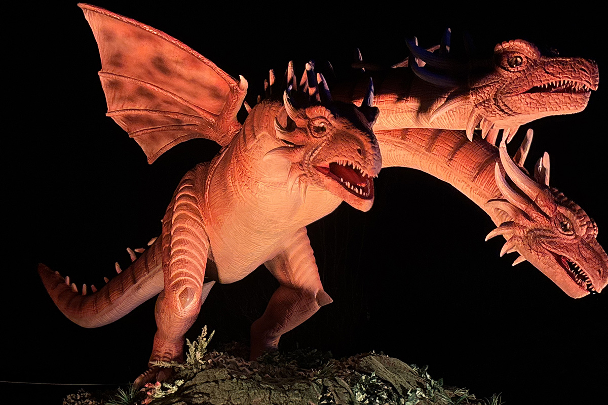 Rund 20 animatronische Riesendrachen sind bis zum 21. März im Brückenkopf-Park zu sehen. Die teilweise mehrere Meter großen Figuren verteilen sich entlang eines Rundwegs durch den Park. Einige von ihnen bewegen sich mithilfe aufwendiger Mechanik, andere überraschen zusätzlich mit Spezialeffekten – etwa Rauch, der aus ihren Mäulern aufsteigt und die Drachen manchmal fast lebendig wirken lässt. Alle mechanischen Drachen werden durch Bewegungssensoren ausgelöst, sobald sich Besucher nähern, und setzen sich dann in Bewegung.