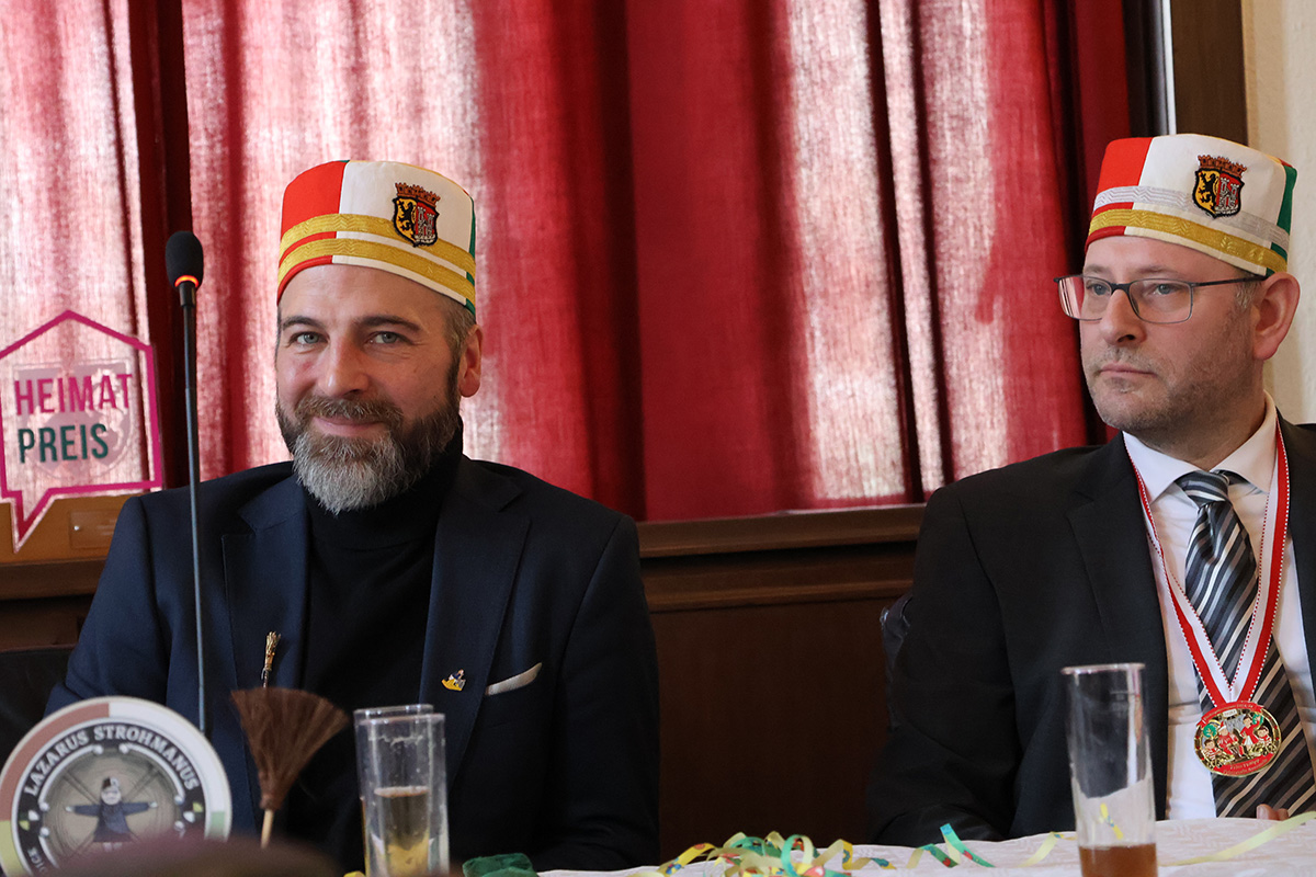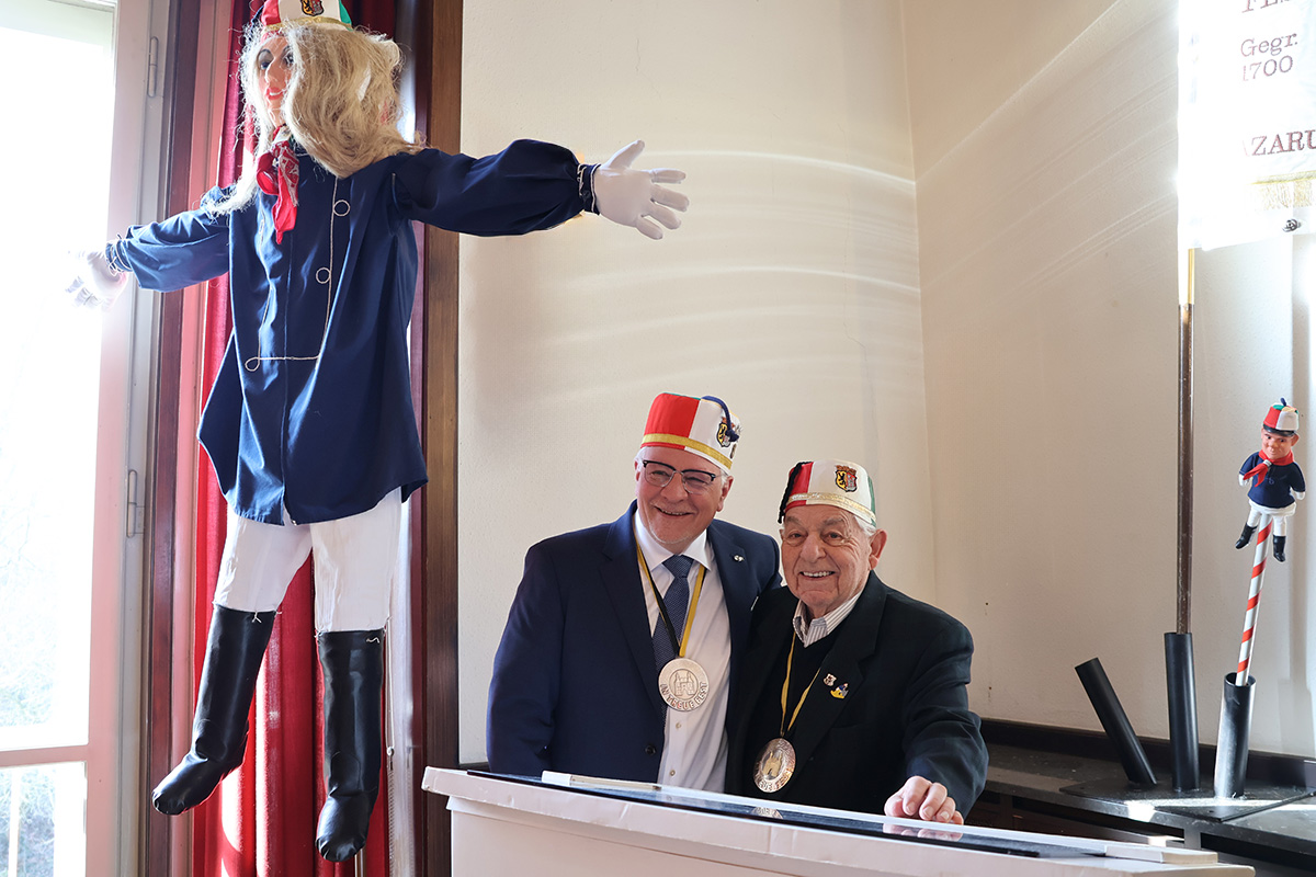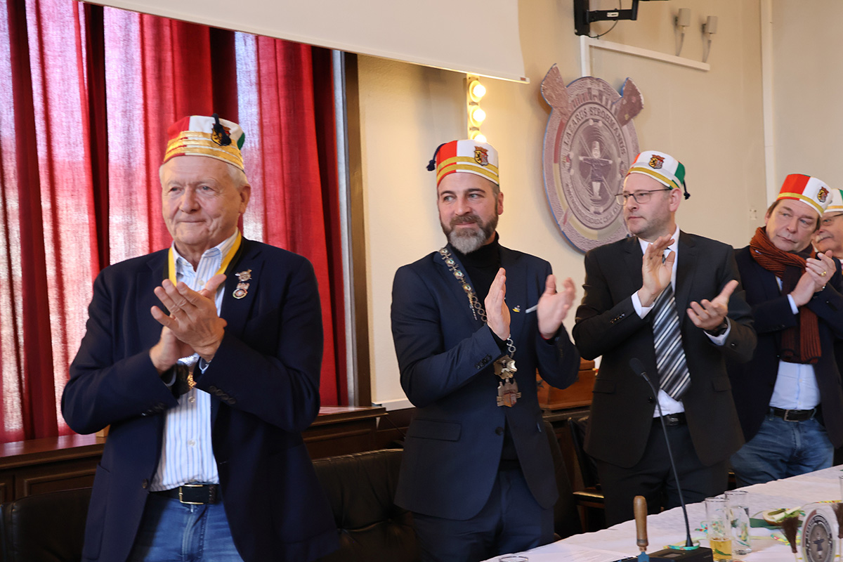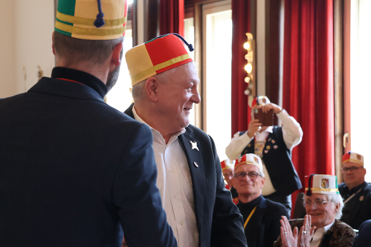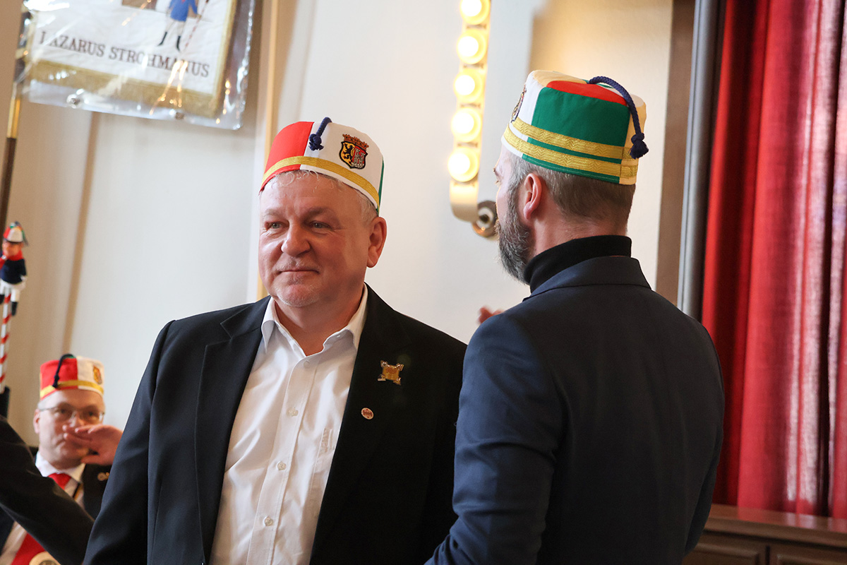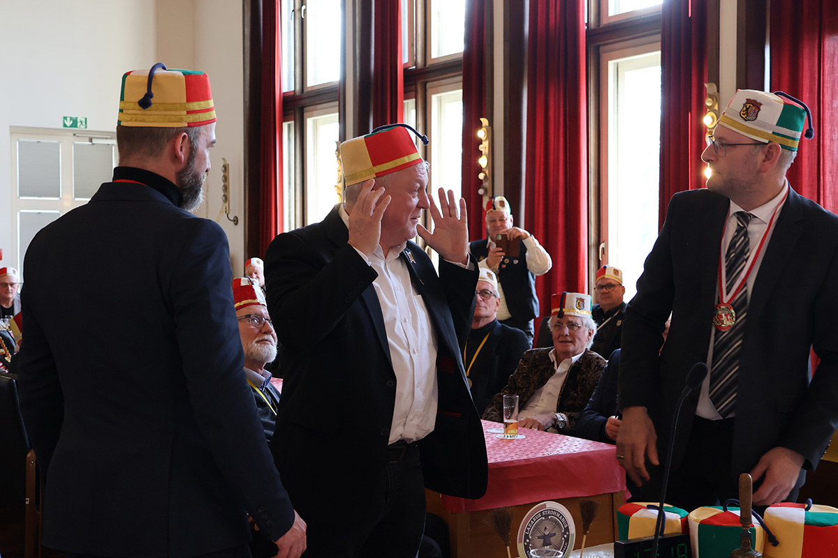 „Tach Jörsch“, begrüßte Präsident David Ningelchen den von Willi Romes zeremoniell hereingetragenen „Mann“ bei der traditionellen Jahreshauptversammlung der Historischen Gesellschaft Lazarus Strohmanus, „Du hast bestimmt mehr geschlafen als ich.“ Dessen Pate Jörg Bücher nahm es mit dem ihm eigenen Schmunzeln zur Kenntnis. Überhaupt schien der Hexenturmordensträger 2026 geehrt, aber in seiner Ehrung ohne Worte. Er ließ sprechen: zunächst Senatspräsident Linus Wiederholt, der ritusgemäß den Orden mit warmen Worten überreichte. In diesem Jahr ein besonderes Ereignis, denn erstmals erhielt der Spross eines Ordensträgers zu dessen Lebzeiten dieselbe Ehrung. Zweite Besonderheit: Wiederholt hatte dereinst die Laudatio auf Jörg Büchers Vater Heino bei dessen Auszeichnung gehalten. Diesmal ging es daher sehr familiär zu.