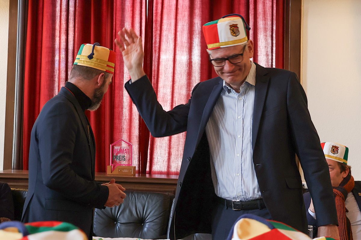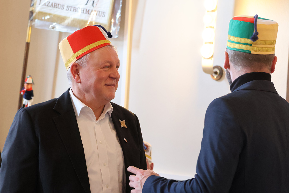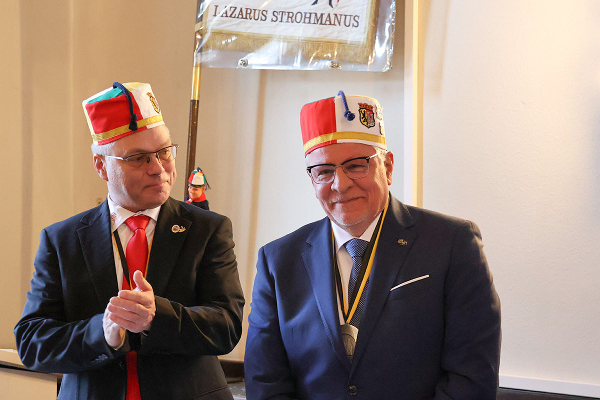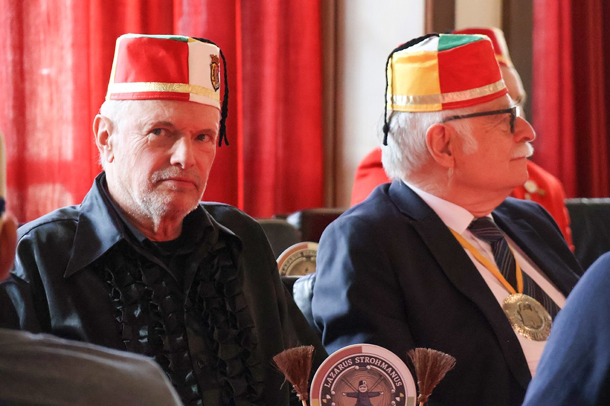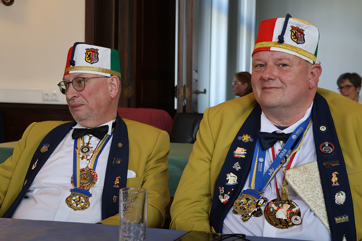 „Tach Jörsch“, begrüßte Präsident David Ningelchen den von Willi Romes zeremoniell hereingetragenen „Mann“ bei der traditionellen Jahreshauptversammlung der Historischen Gesellschaft Lazarus Strohmanus, „Du hast bestimmt mehr geschlafen als ich.“ Dessen Pate Jörg Bücher nahm es mit dem ihm eigenen Schmunzeln zur Kenntnis. Überhaupt schien der Hexenturmordensträger 2026 geehrt, aber in seiner Ehrung ohne Worte. Er ließ sprechen: zunächst Senatspräsident Linus Wiederholt, der ritusgemäß den Orden mit warmen Worten überreichte. In diesem Jahr ein besonderes Ereignis, denn erstmals erhielt der Spross eines Ordensträgers zu dessen Lebzeiten dieselbe Ehrung. Zweite Besonderheit: Wiederholt hatte dereinst die Laudatio auf Jörg Büchers Vater Heino bei dessen Auszeichnung gehalten. Diesmal ging es daher sehr familiär zu.