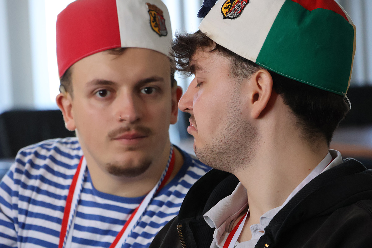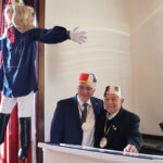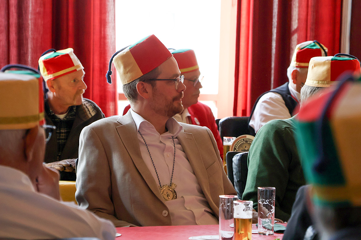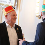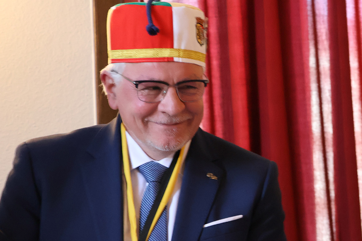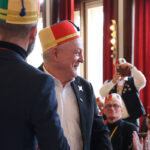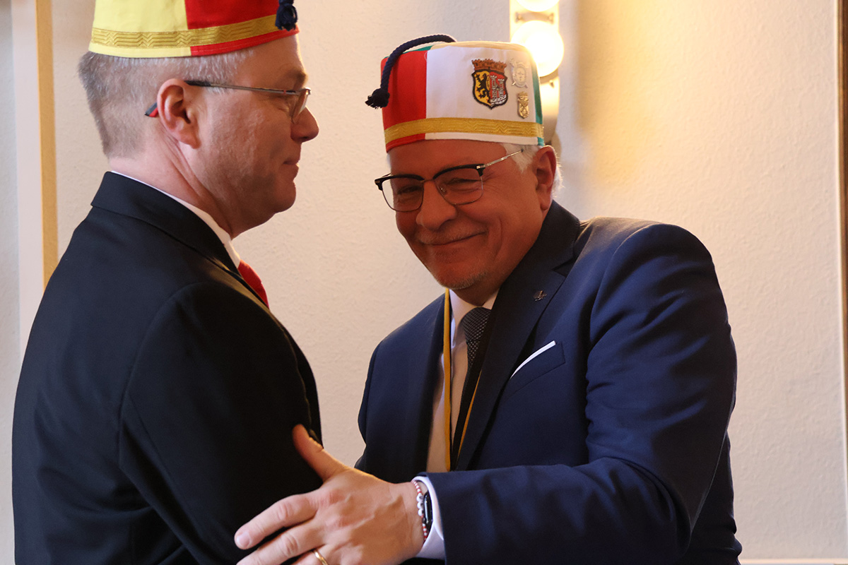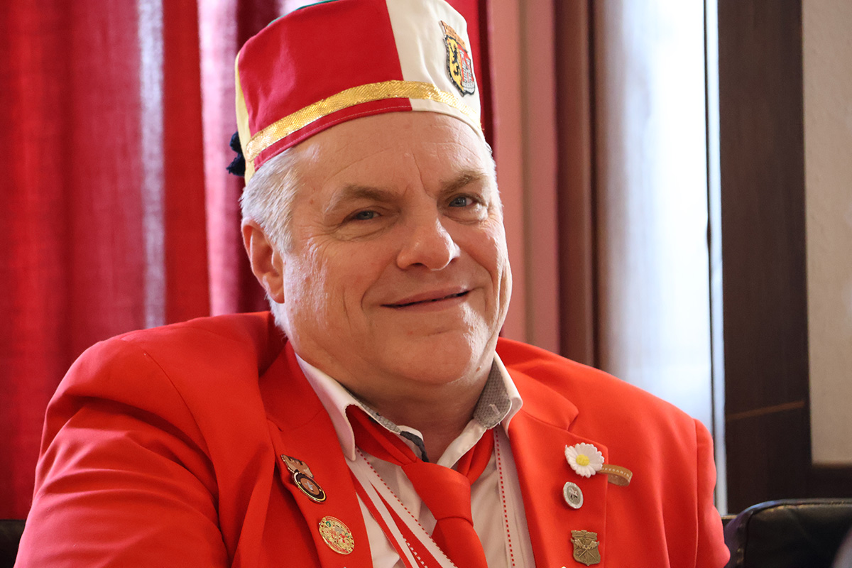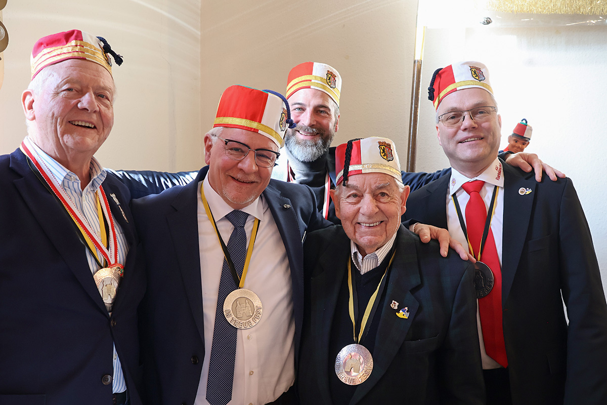 „Tach Jörsch“, begrüßte Präsident David Ningelchen den von Willi Romes zeremoniell hereingetragenen „Mann“ bei der traditionellen Jahreshauptversammlung der Historischen Gesellschaft Lazarus Strohmanus, „Du hast bestimmt mehr geschlafen als ich.“ Dessen Pate Jörg Bücher nahm es mit dem ihm eigenen Schmunzeln zur Kenntnis. Überhaupt schien der Hexenturmordensträger 2026 geehrt, aber in seiner Ehrung ohne Worte. Er ließ sprechen: zunächst Senatspräsident Linus Wiederholt, der ritusgemäß den Orden mit warmen Worten überreichte. In diesem Jahr ein besonderes Ereignis, denn erstmals erhielt der Spross eines Ordensträgers zu dessen Lebzeiten dieselbe Ehrung. Zweite Besonderheit: Wiederholt hatte dereinst die Laudatio auf Jörg Büchers Vater Heino bei dessen Auszeichnung gehalten. Diesmal ging es daher sehr familiär zu.
