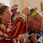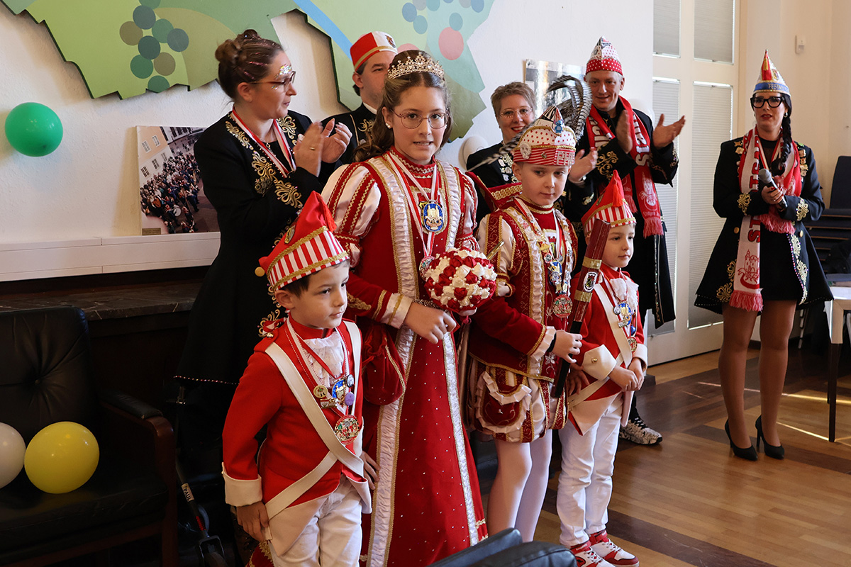 Als besondere Überraschungsgäste erschienen zur Jahreshauptversammlung die närrischen Majestäten: Zum ersten Mal stellte sich nicht nur Page Ben, sondern auch sein Bruder Felix selbst vor. „Ich freue mich sehr“, so Präsident Ningelchen, „dass Du Dich bei uns so wohlfühlst, dass Du Dich das getraut hast.“ Als absolute Profis zum Ende der Session erwiesen sich Prinz Philipp und Prinzessin Anastasia, die Ningelchen ausdrücklich dafür lobte; war er doch selbst vor einigen Jahrzehnten als Page im Kinderdreigestirn im Einsatz gewesen und kennt die Verfahren aus eigenem Erleben.