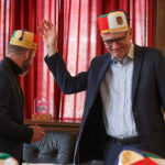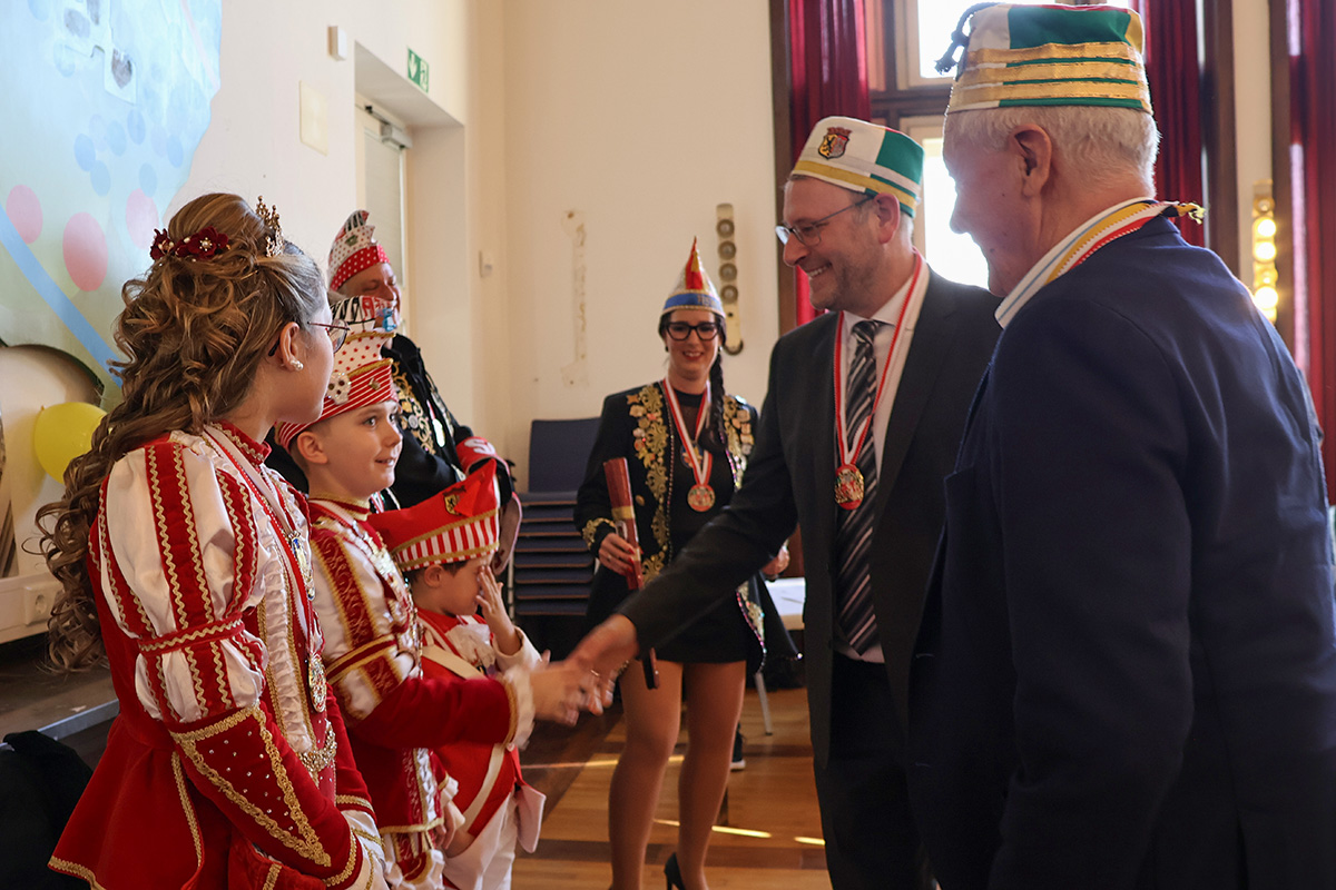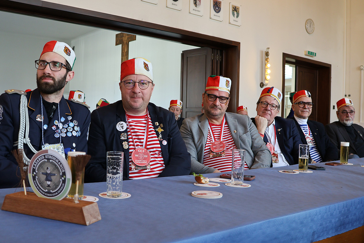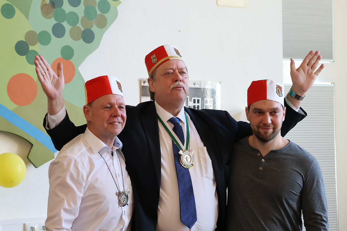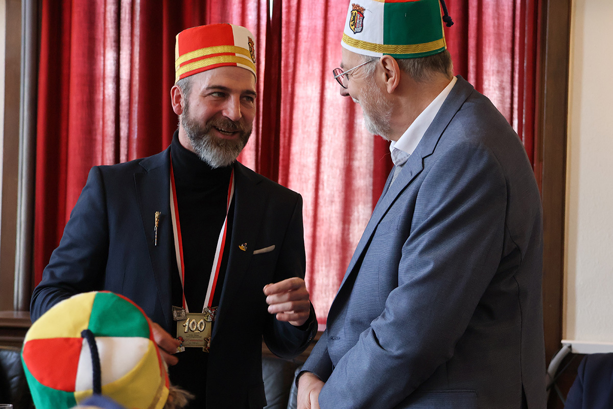 Ebenso traditionell vergibt die Gesellschaft Ehrenkappen – als Überraschungen. Diesmal wurde Jürgen Hennes gewürdigt, der als Personalratsvorsitzender alljährlich für den Rathaussturm zu Weiberfastnacht mitverantwortlich zeichnet. Damit würde er vielen Gesellschaften eine Bühne bieten, meinte David Ningelchen bei der Ehrenkappenverleihung. Die zweite Kappe erhielt Museumsleiter Marcell Perse, den die Beschäftigung mit der Historie mit dem Verein verbindet. Der Archäologe gräbt in der Vergangenheit, um sie zu bewahren. Ebenso sei es mit dem Brauchtum, das die Lazarusbrüder bewahren würden. Das Trio vervollständigte Ulrich Backhausen, der für sein jahrzehntelanges Engagement für Jülich ausgezeichnet wurde.