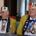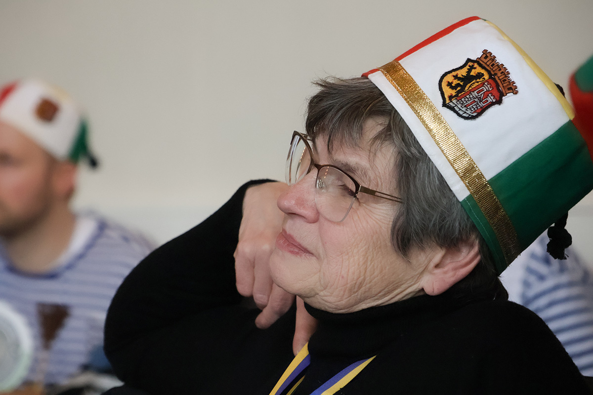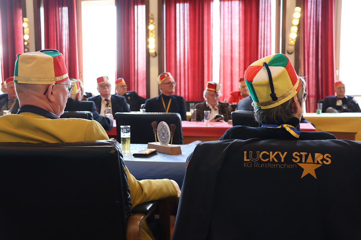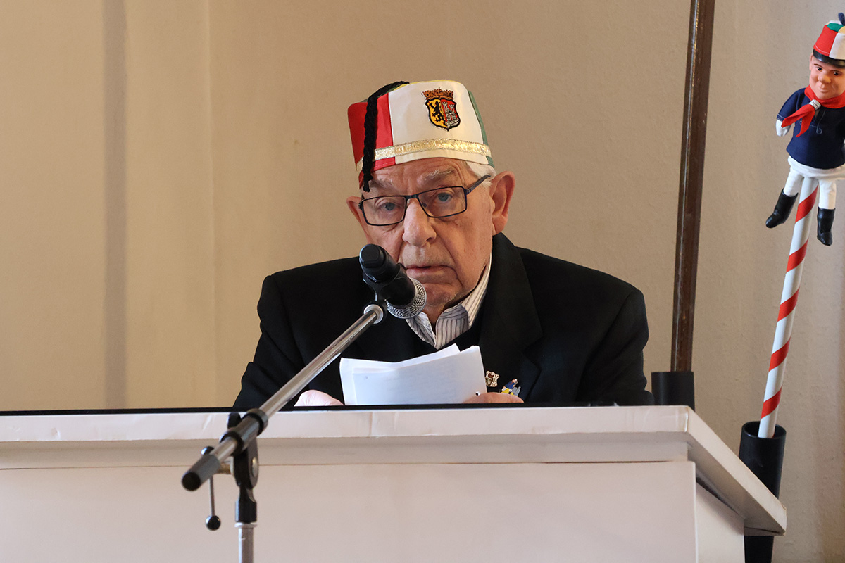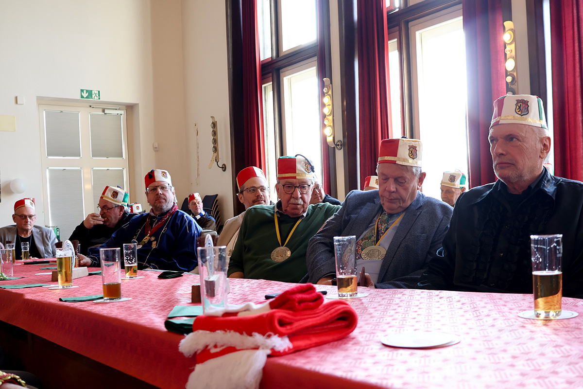 Die Majestäten wie auch fast alle übrigen Anwesenden kamen im anschließenden Kengerzoch zum Einsatz und hatten sich noch passend umzuziehen. In der Sitzung erfuhren die Anwesenden auch, was denn so ein Präsident zum diesjährigen, frostigen Umzug „untenrum“ trägt. Die Diskretion verbietet eine nähere Beschreibung – das Gelächter der Mitglieder war ihm jedenfalls sicher. Anlass der Indiskretion war der Vortrag von Heino Bücher, der statt der erwarteten Dankesrede des Hexenturmordensträgers das Wort ergriff. Er trug am Rednerpult seine Anekdote vom „Jülicher Kengerzoch“ vor und erntete damit reichlich wiedererkennendes Nicken und entsprechend Applaus.