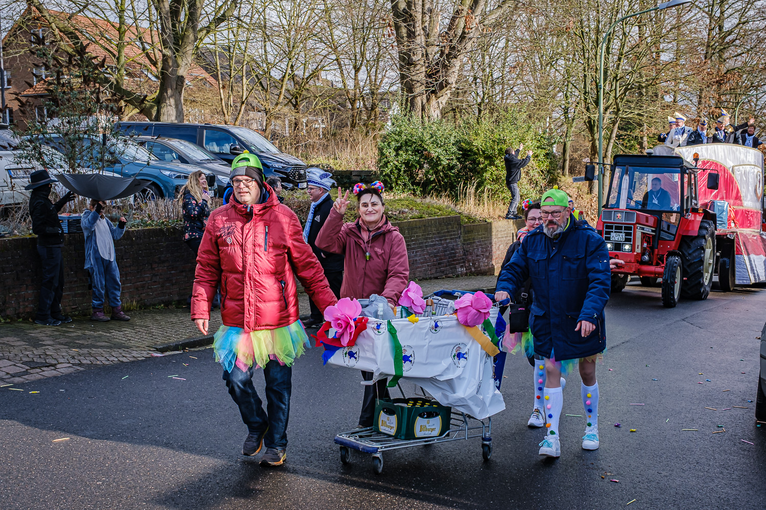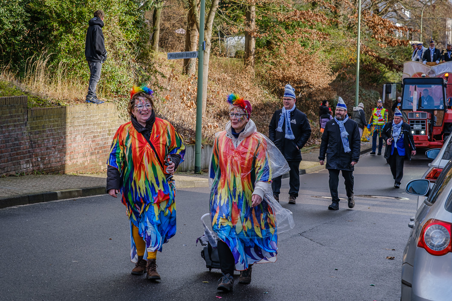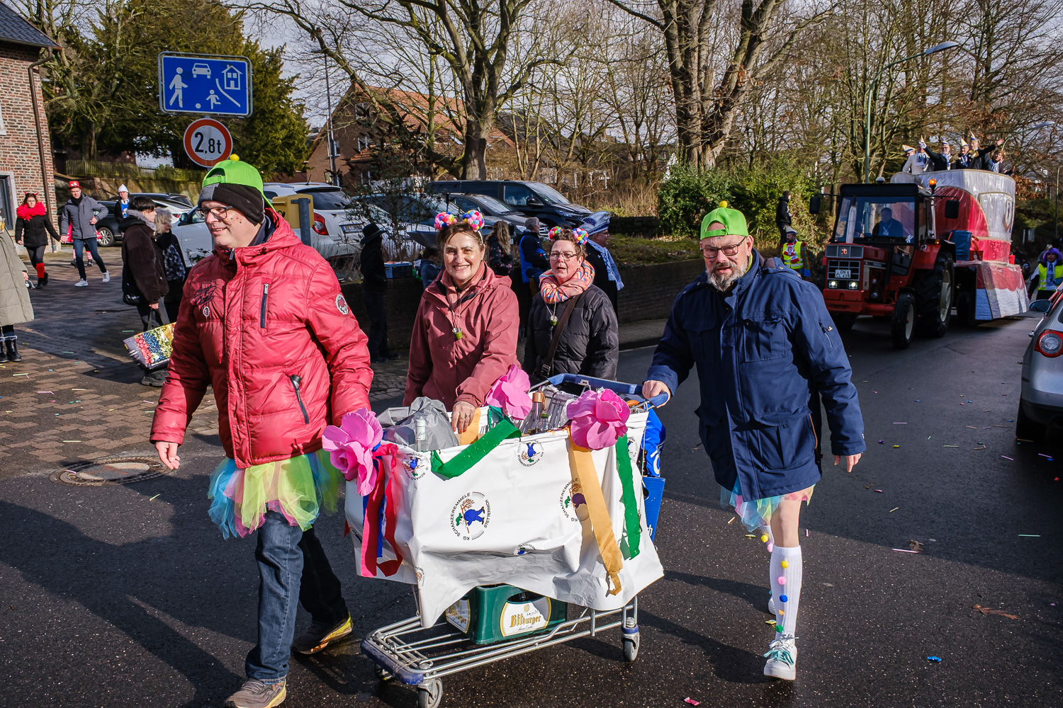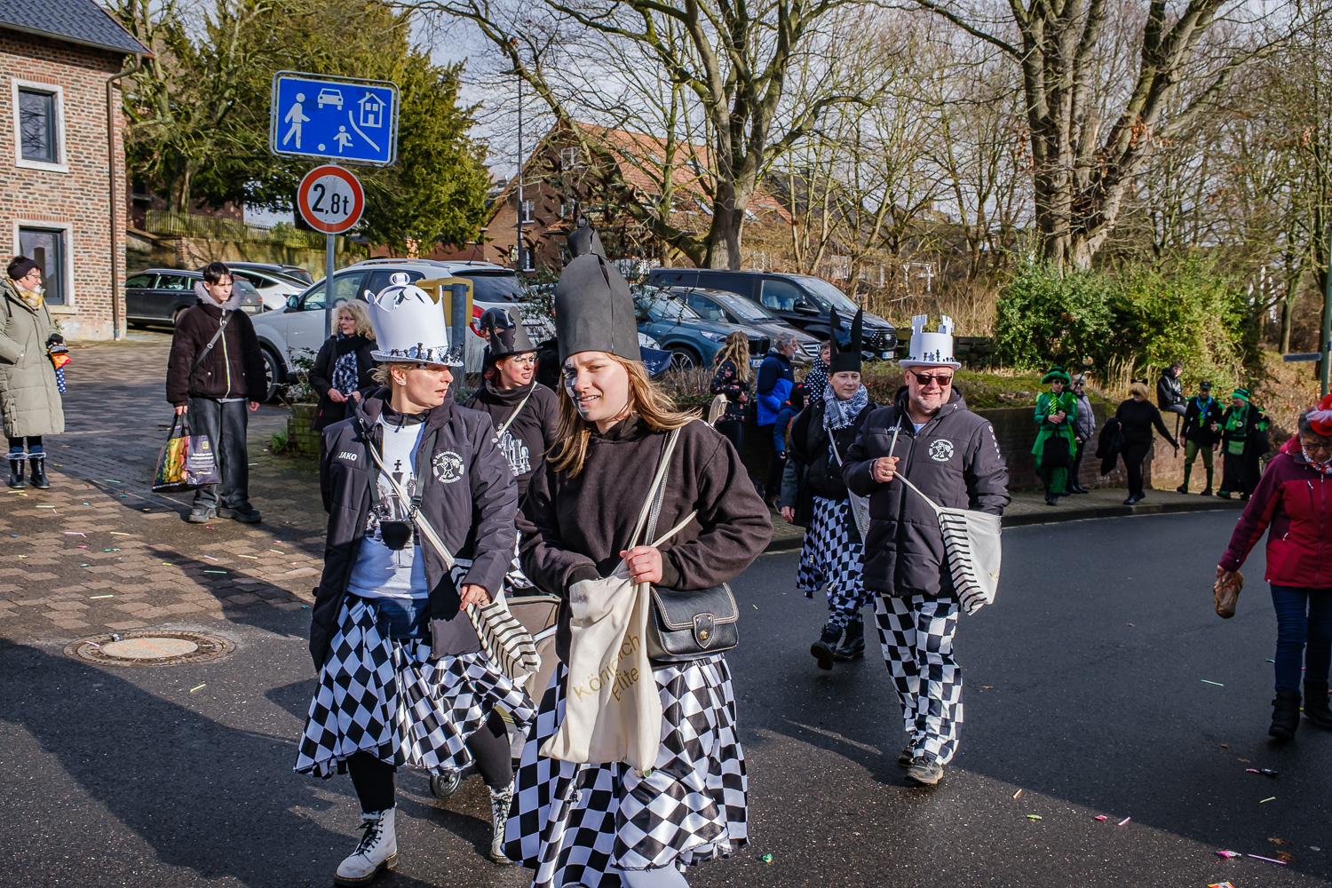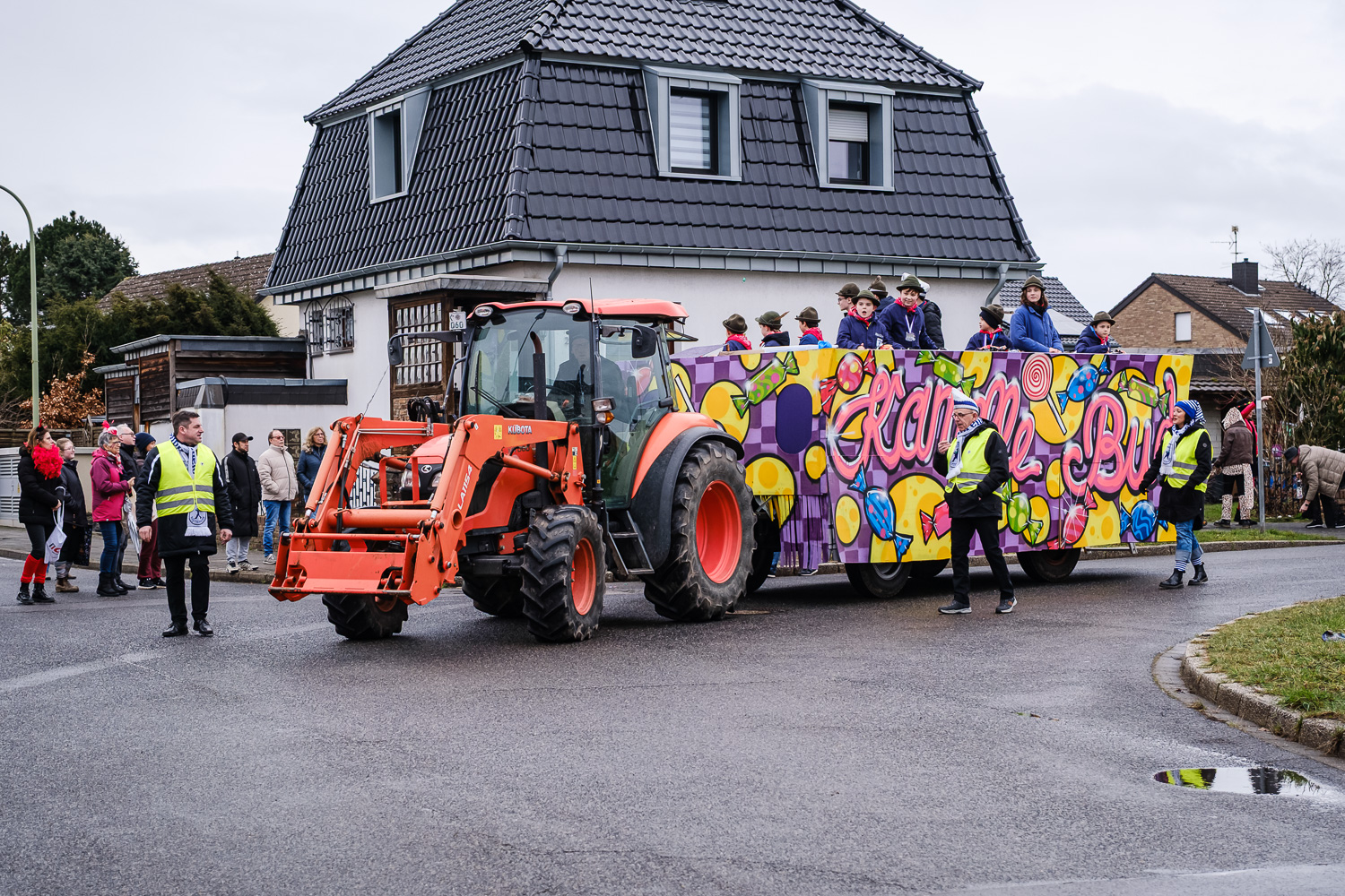 Der närrische Lindwurm zog gut gelaunt trotz frostiger Temperaturen durch Stetternich. Das Dörfchen schwelgte in den Vereinsfarben ergänzt durch bunte Fußgruppen: Von TicTac, Schachfiguren, eine Football-Mannschaft, Meeresmajestäten und eine großartige Fußgruppe, die sich als Marionetten kostümiert hatten, reichten die jecken Verkleidungen. Den Abschluss bildete wie stets das närrische Treiben im Festzelt Auf der Klause.