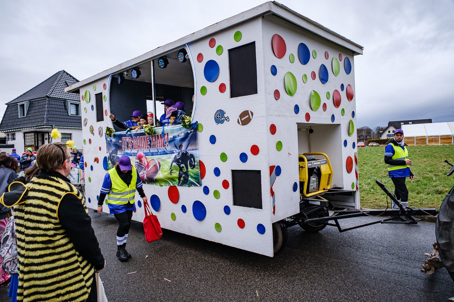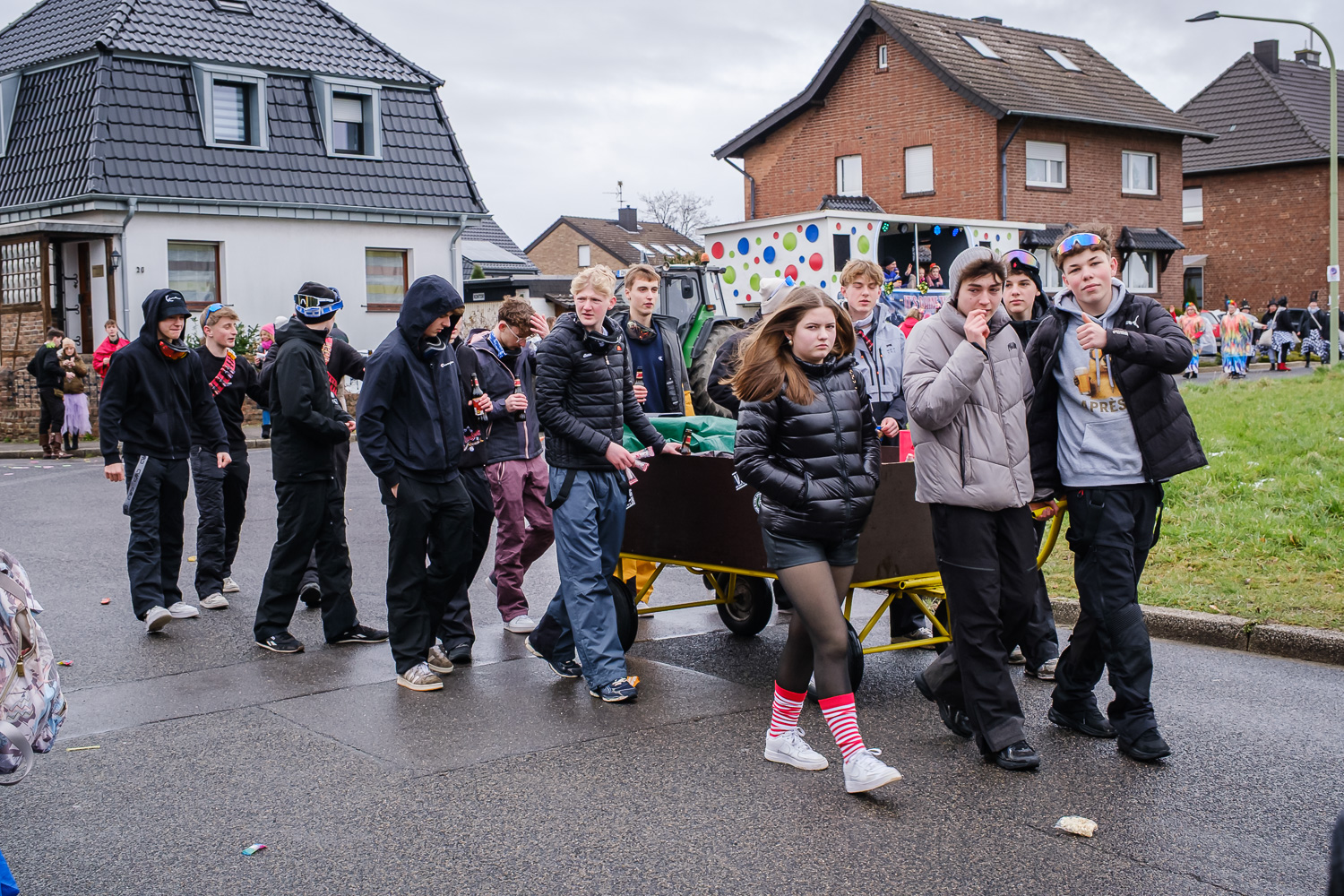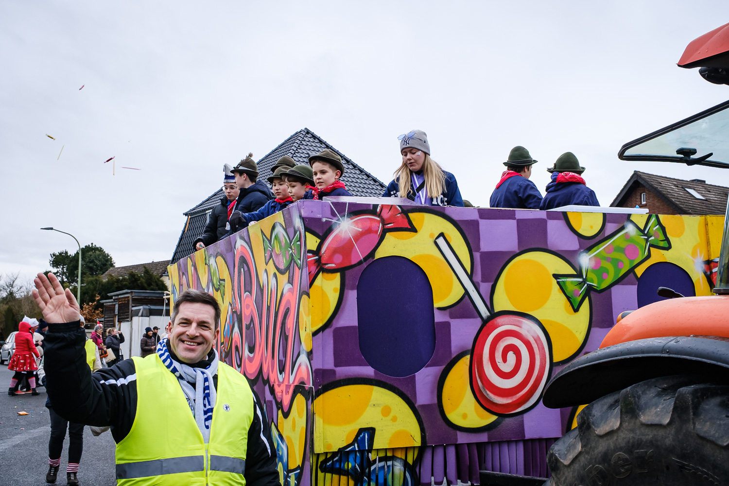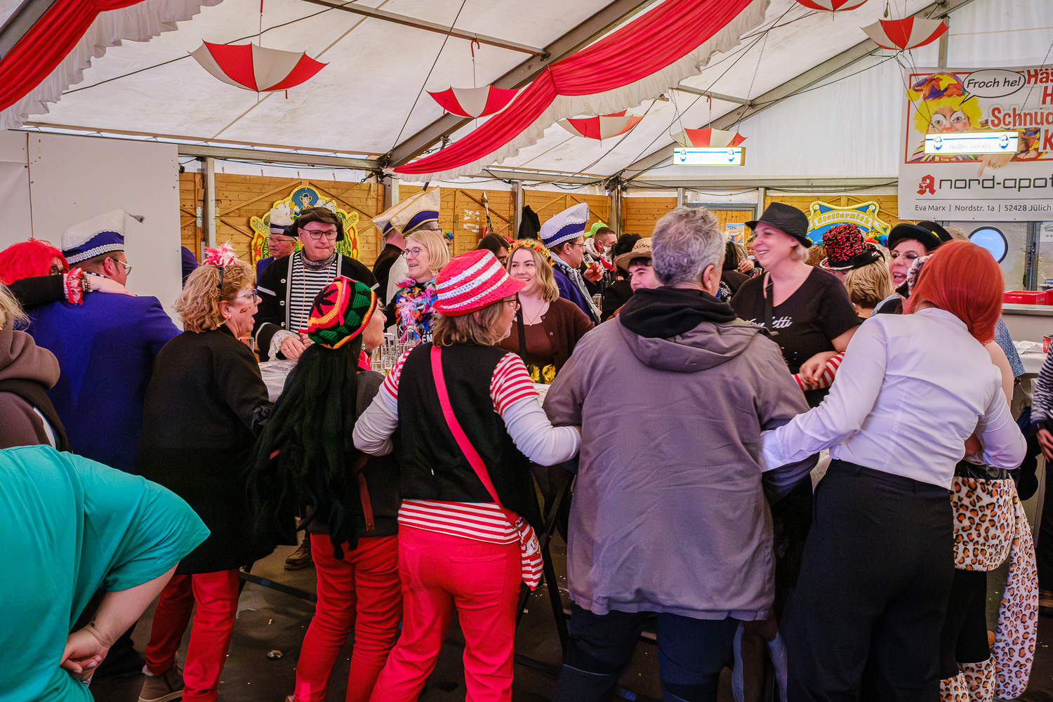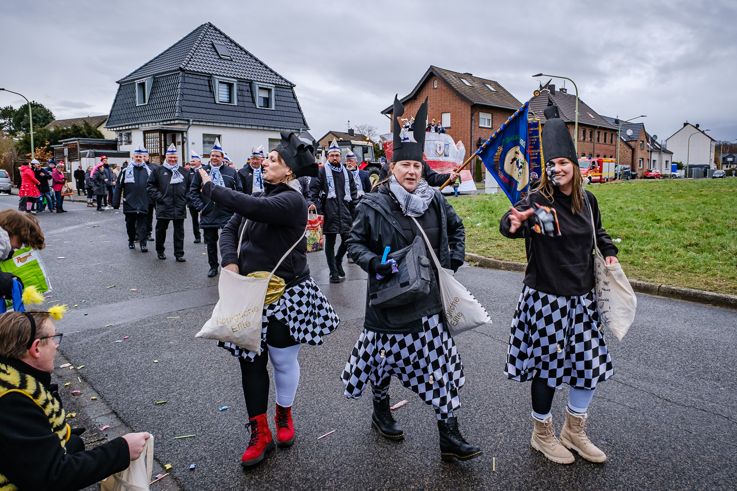 Der närrische Lindwurm zog gut gelaunt trotz frostiger Temperaturen durch Stetternich. Das Dörfchen schwelgte in den Vereinsfarben ergänzt durch bunte Fußgruppen: Von TicTac, Schachfiguren, eine Football-Mannschaft, Meeresmajestäten und eine großartige Fußgruppe, die sich als Marionetten kostümiert hatten, reichten die jecken Verkleidungen. Den Abschluss bildete wie stets das närrische Treiben im Festzelt Auf der Klause.