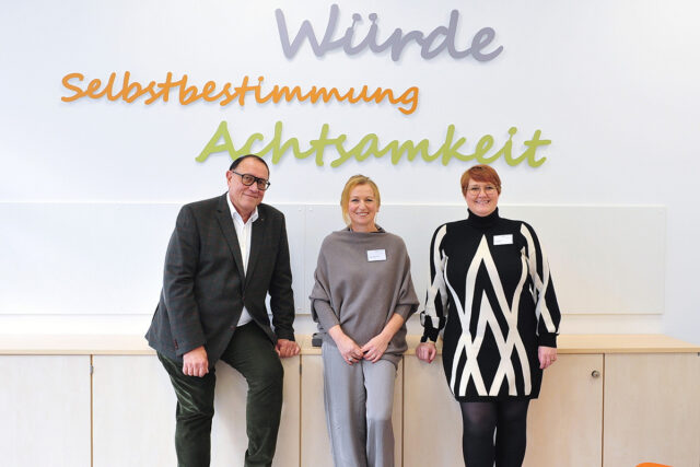 Frohe Gesichter zur Eröffnung des neuen JG-Rur-Campus in Düren: (v.l.) Dr. Theodor-Michael Lucas (Vorstandsvorsitzender Josefs-Gesellschaft), Menka Berres-Förster (Leitung Rur-Campus) und Annika Butzen (Geschäftsführerin Rur-Kliniken). Foto: Kaya Erdem