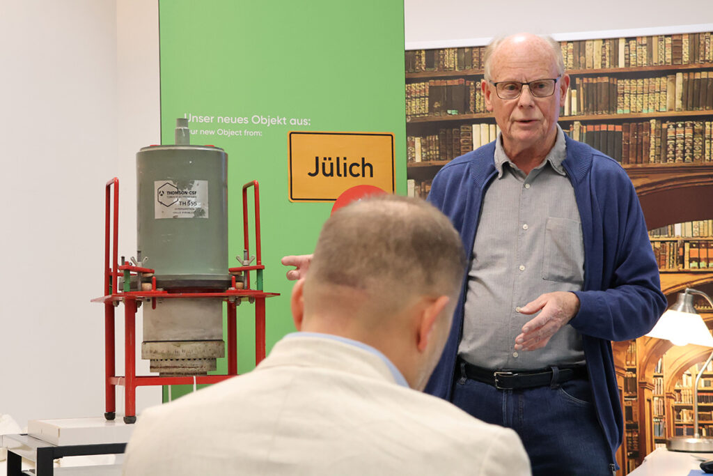 Das ließ sich der Geschichtsverein im Vorhinein nicht zwei Mal sagen. Zu Beginn der Veranstaltung wurde eine Senderöhre aus der alten Rundfunksendestelle auf der Merscher Höhe enthüllt, die vom Verein gespendet wurde. Ein Exponat, das auch im Sinne der eigenen Ausstellung „Von Jülich in die ganze Welt“ über ebenjene Sendestelle, dereinst gesichert worden war. Claus Maas, Arbeitsgruppenleiter der Ausstellung und Günter Hirte, Leiter der Sendeanlage von 1973 bis 2010, zeigten sich erfreut, über das Exponat einige Worte verlieren und es dem neuen Haus der Geschichte zugänglich machen zu können.