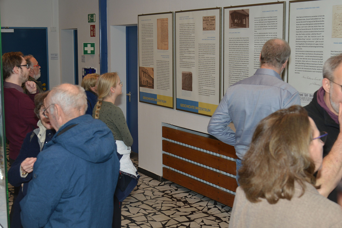 Anlässlich der Ausstellungseröffnung „Geschichte im Zentrum“ lieh Jacek Grubba, Betriebsleiter des Museums Zitadelle, dem Jülicher Wilhelm Becker seine Stimme und ließ ihn, seine Erinnerungen und Lebensgeschichte auf diese Weise lebendig werden. Auch Museumsleiter Marcell Perse sowie Susanne Richter und Doris Flesch vom Stadtarchiv schlüpften anlässlich der Eröffnung in verschiedene Rollen. So erzählte Katharina Lesmeister von ihrem „Grand Café de Belle Vue“ am Ende der Römerstraße, das sie Mitte bis Ende des 19. Jahrhunderts betrieb.