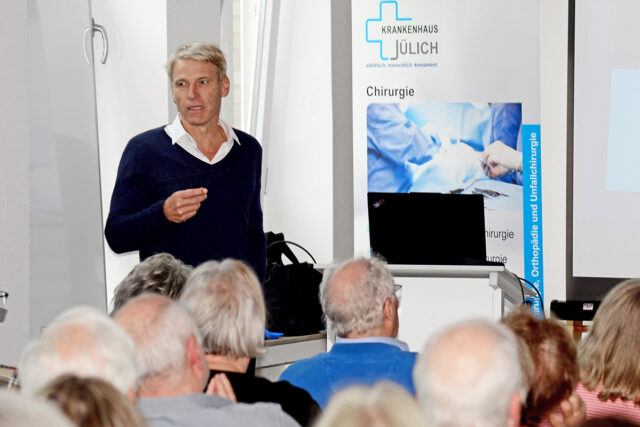 Dabei stellte er die Vorteile von Knie-Teilprothesen und von einem speziellen Verfahren der Hüftgelenk-OP vor: „Wir wenden hier in Jülich als eines von nur wenigen Krankenhäusern in Deutschland das AMIS-Verfahren an. Dabei erfolgt der Zugang von vorne, wodurch wir auf dem Weg zum Gelenk keine Muskeln und keine Sehnen durchtrennen müssen.“ Auch wenn die Langzeitergebnisse sich von denen anderer OP-Verfahren nicht unterscheiden, hätten die Patienten nach AMIS weniger Schmerzen, sie seien schneller wieder fit und hätten ein deutlich geringeres Risiko für eine Luxation, also ein Auskugeln des neuen Gelenks, betonte der Chefarzt.