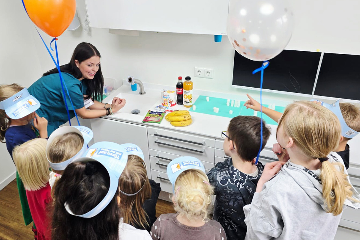 So wartete in einem der Zimmer ein ganzer Berg verlockender Süßigkeiten auf die Kinder. Zum Essen waren Knoppers, Milchschnitte und Co allerdings nicht gedacht, vielmehr haben die kleinen Besucher gemeinsam mit Mitarbeiterin Paula ein „Zuckerquiz“ gemacht und durften raten, wie hoch der Gegenwert in Zuckerwürfeln wohl sein könnte. Dass die Flasche Cola hier ganz weit vorne liegt, wussten alle auf Anhieb. Neben der Theorie ging es aber vor allem ums Ausprobieren, Anfassen und Selbstmachen. Den Behandlungsstuhl rauf und runter fahren lassen, das helle Licht obendrüber einschalten und „alle Knöpfe drücken, die man sonst nicht anfassen darf“, lachte Jasmin Wilmes. „Iiiih, ist das eklig!“ hieß es einen Raum weiter. Dort wurde die etwas glitschige Abdruckmasse angerührt, in kleine Becher gefüllt und anschließend – na klar, ein Abdruck gemacht. Aber nicht von den Zähnen, hier wurden nur die Finger verewigt. Den fertigen Gipsabdruck durften die kleinen Gäste am Ende des Vormittags als Andenken an einen etwas anderen Zahnarztbesuch mit nach Hause nehmen.