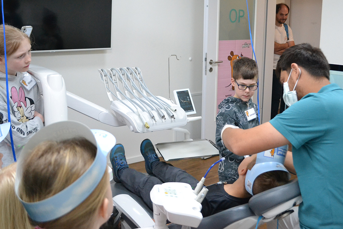 Vorher allerdings gab es noch ein ganz besonderes „Fernsehprogramm“ für die Kinder. Andrej traute sich als Erster, nahm auf dem Behandlungsstuhl Platz und ließ sich die Zähne scannen. Jedes Detail tauchte auf dem Bildschirm auf, es herrschte schon fast andächtige Stille im Raum. Mit der spannenden neuen Technik lassen sich künftig die eher unbeliebten Abdrücke vermeiden, so die Information am Rande.