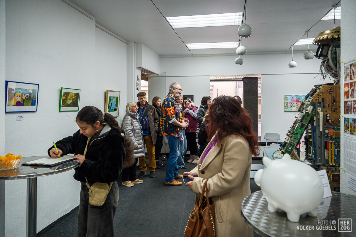 Der Veranstalter freuten sich über volles Haus zur Vernissage. Bis auf Samira, die absagen musste, waren alle Künstlerinnen der Einladung gefolgt. Moderator Gerold Malß stellte jede Teilnehmerin persönlich vor und ließ sie ihre Bilder erklären.