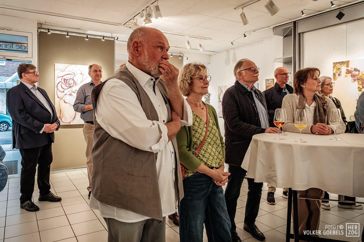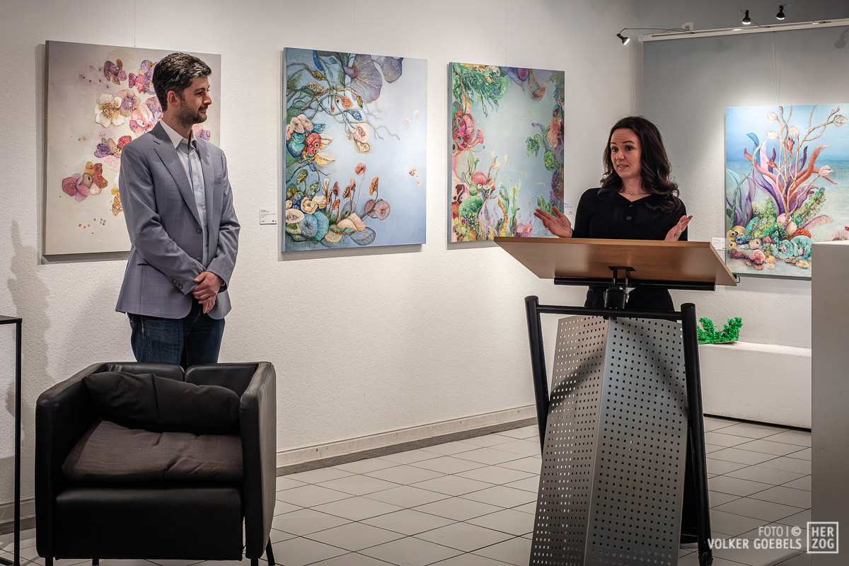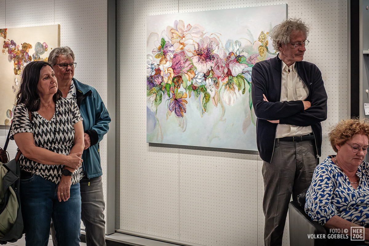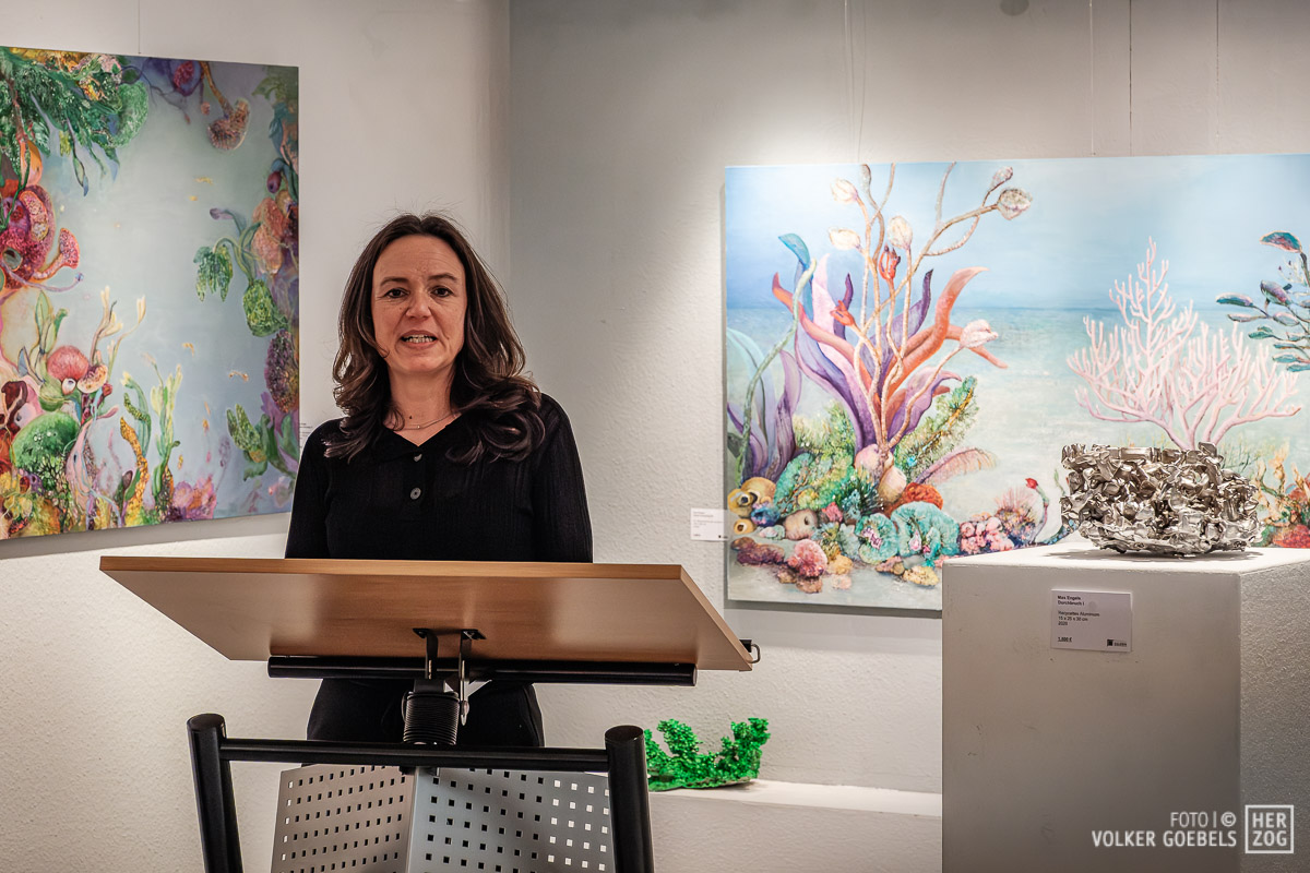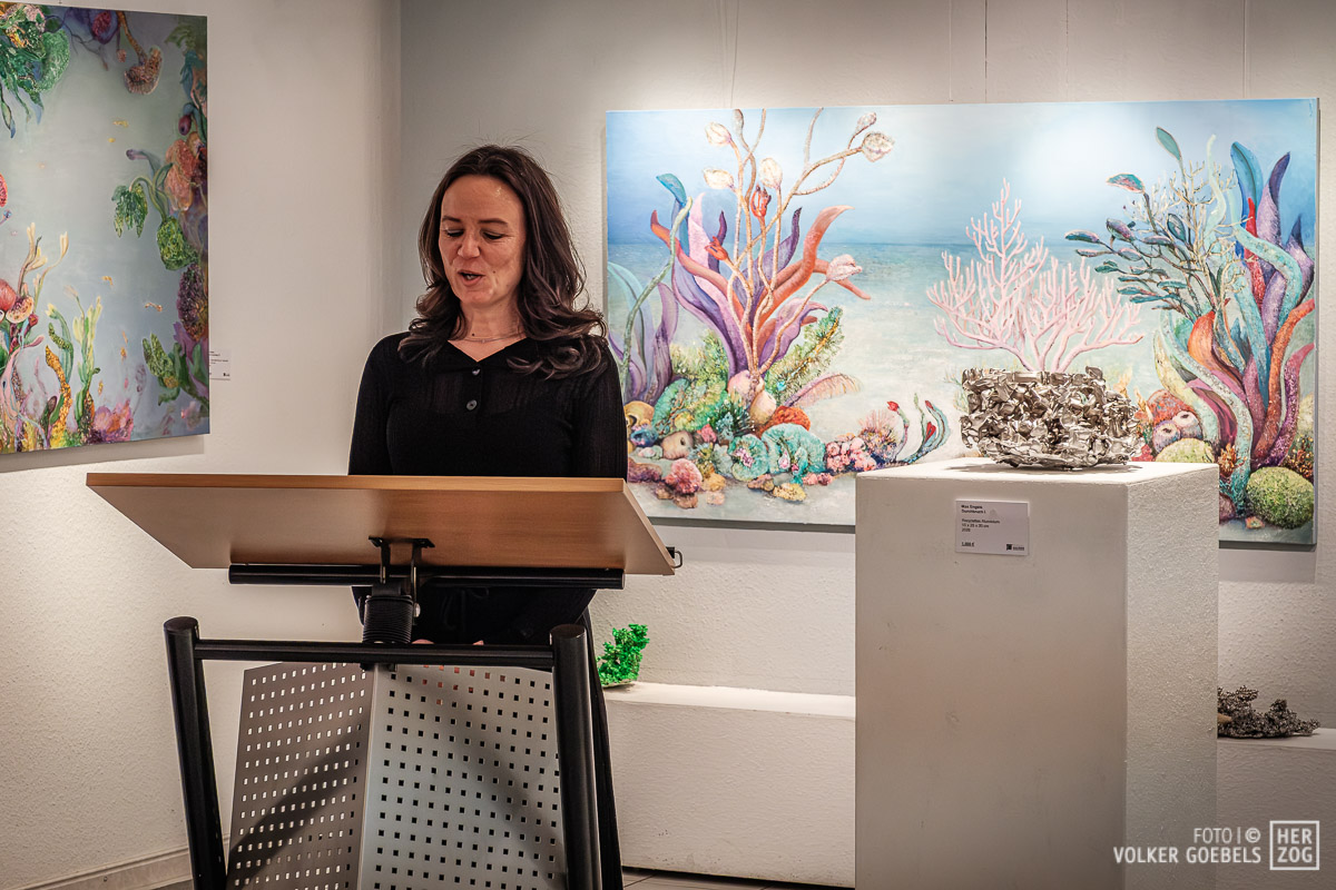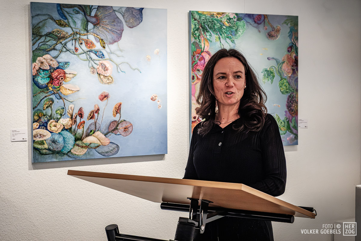 Die Galerie An der Zitadelle präsentiert Ruttens Malerei in Kombination mit Plastiken von Max Engels. Alexandra Simon-Tönges hat die Künstler und ihre Werke anlässlich der Vernissage vorgestellt. Bemerkenswert sei der abwechslungsreiche kompositorische Aufbau der Gemälde von Rutten, so die Kunsthistorikerin. „Der Fokus liegt teils auf ungewöhnlichen Stellen im Bild, dennoch erzeugt Ena immer eine sehr vielschichtige, zugleich dynamische und harmonische Bildordnung. Vielleicht ist es genau das, was ihre Arbeiten so lebendig macht: Sie wirken nicht konstruiert, sondern gewachsen“, überlegte Simon-Tönges in ihren einführenden Worten.